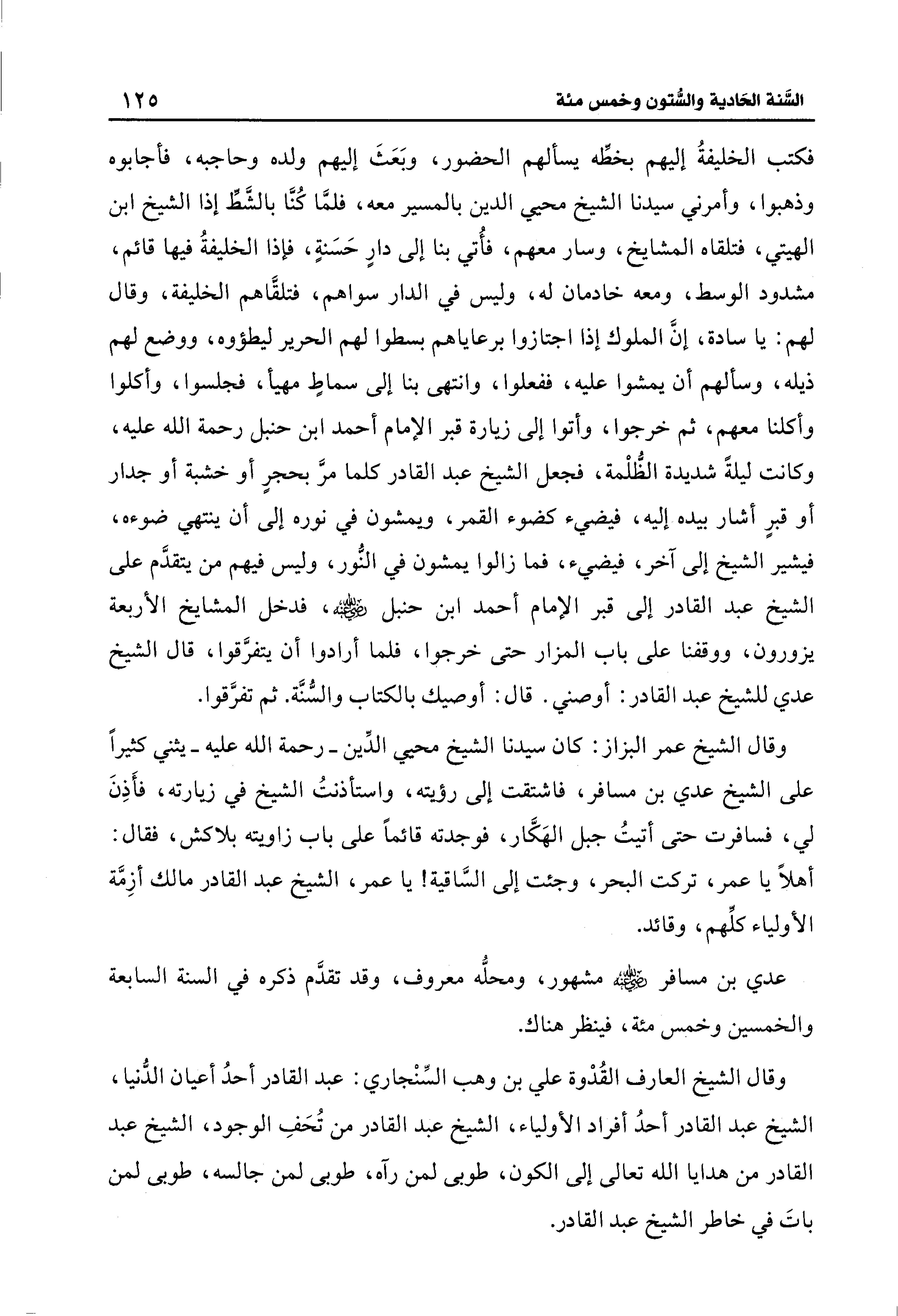 فكتب الخليفةُ إليهم بخطِّه يسألهم الحضور، وبَعَثَ إليهم ولده وحاجبه، فأجابوه وذهبوا، وأمرني سيدنا الشيخ محيي الدين بالمسير معه، فلمَّا كُنَّا بالشَّطِّ إذا الشيخ ابن الهيتي، فتلقاه المشايخ، وسار معهم، فأُتي بنا إلى دارٍ حَسَنةٍ، فإذا الخليفةُ فيها قائم، مشدود الوسط، ومعه خادمان له، وليس في الدار سواهم، فتلقَّاهم الخليفة، وقال لهم: يا سادة، إنَّ الملوك إذا اجتازوا برعاياهم بسطوا لهم الحرير ليطؤوه، ووضع لهم ذيله، وسألهم أن يمشوا عليه، ففعلوا، وانتهى بنا إلى سماطٍ مهيأ، فجلسوا، وأكلوا وأكلنا معهم، ثمَّ خرجوا، وأتوا إلى زيارة قبر الإمام أحمد بن حنبل رحمة الله عليه، وكانت ليلةً شديدة الظُّلْمة، فجعل الشيخ عبد القادر كلما مرَّ بحجرٍ أو خشبة أو جدار أو قبرٍ أشار بيده إليه، فيضيء كضوء القمر، ويمشون في نوره إلى أن ينتهي ضوءه، فيشير الشيخ إلى آخر، فيضيء، فما زالوا يمشون في النُّور، وليس فيهم من يتقدَّم على الشيخ عبد القادر إلى قبر الإمام أحمد بن حنبل - رضي الله عنه -، فدخل المشايخ الأربعة يزورون، ووقفنا على باب المزار حتى خرجوا، فلما أرادوا أن يتفرَّقوا، قال الشيخ عدي للشيخ عبد القادر: أوصني. قال: أوصيك بالكتاب والسُّنَّة. ثمَّ تفرَّقوا.