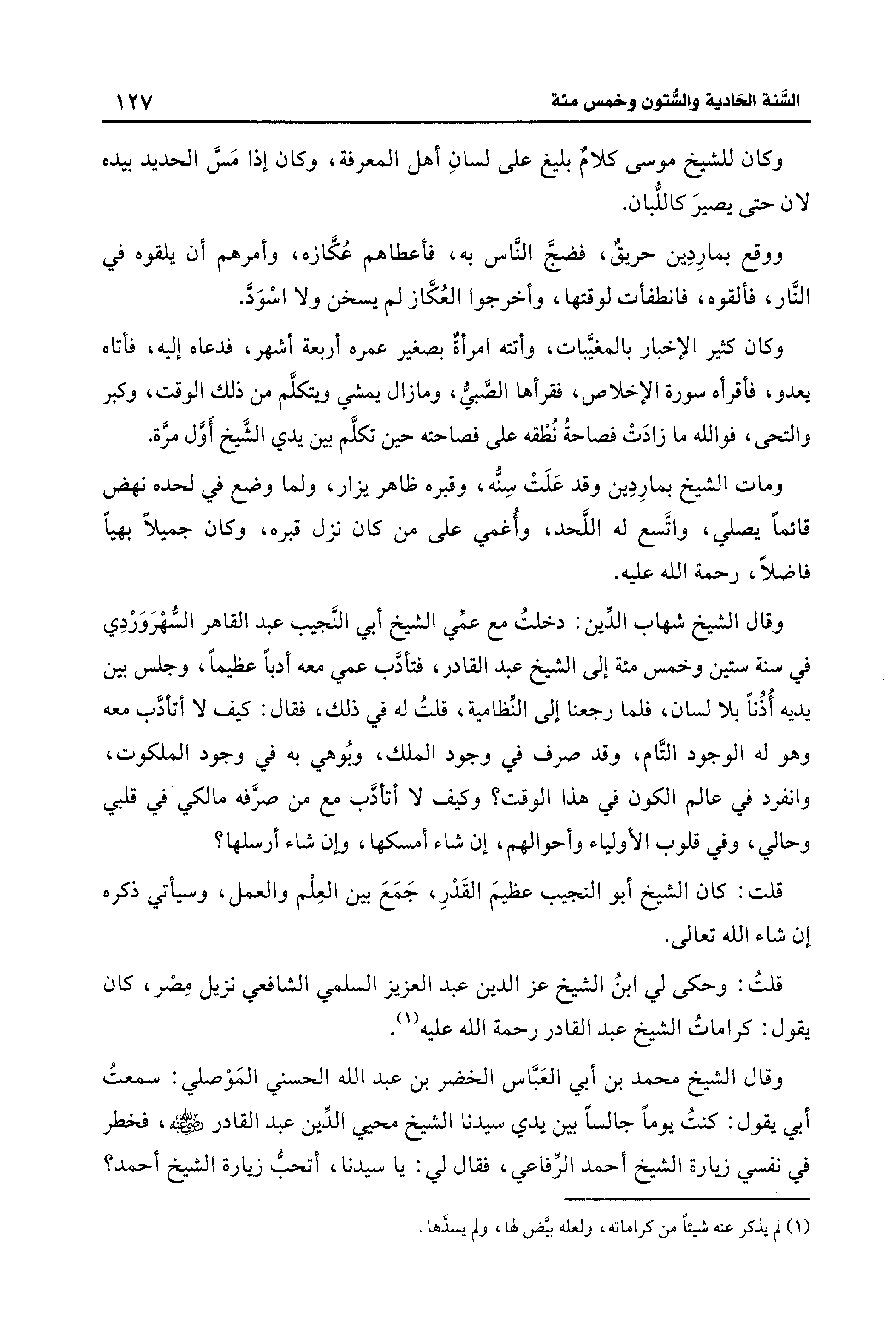 قلتُ: وحكى لي ابنُ الشيخ عز الدين عبد العزيز السلمي الشافعي نزيل مِصْر، كان يقول: كراماتُ الشيخ عبد القادر رحمة الله عليه (¬1).