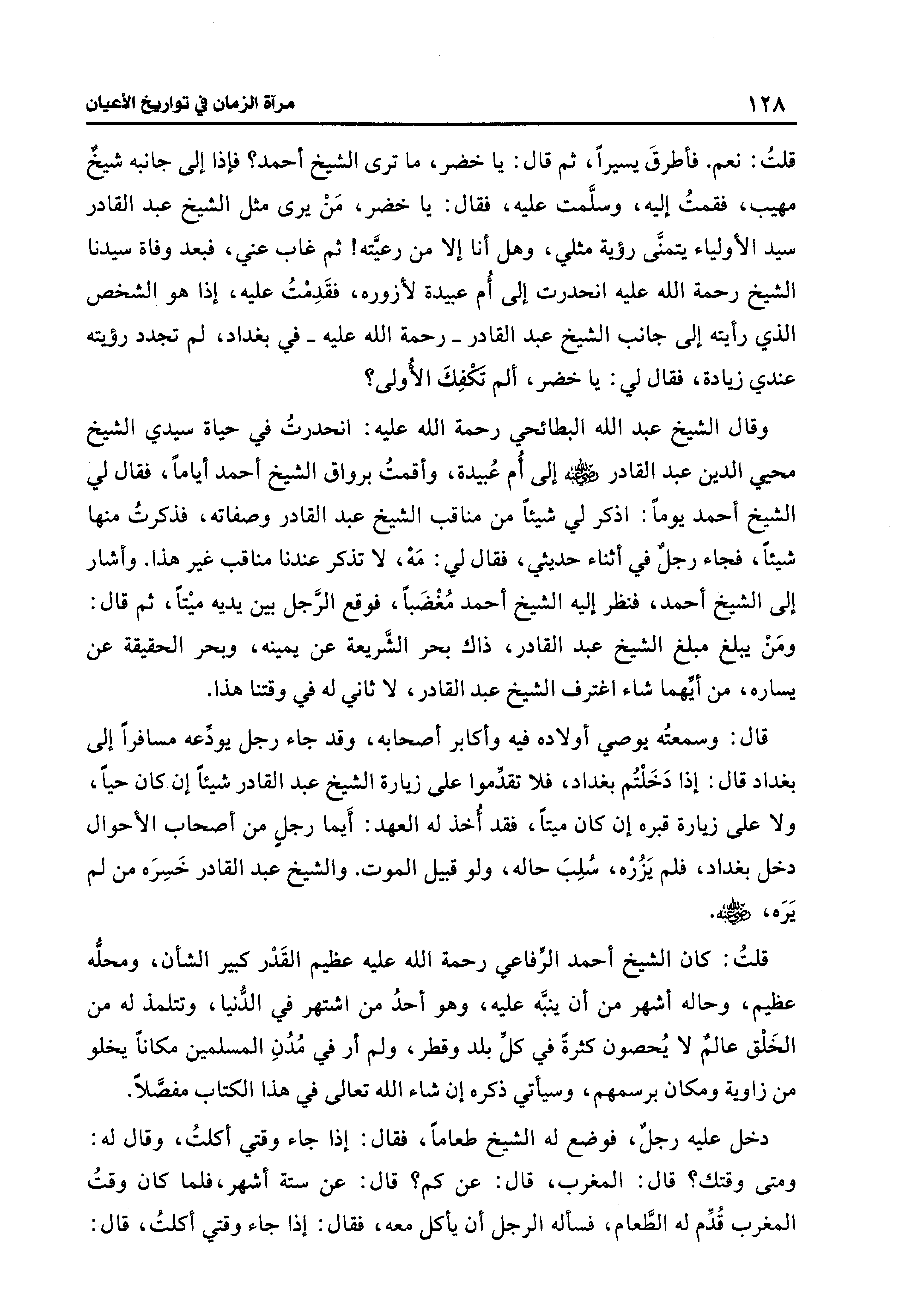 قلتُ: نعم. فأطرقَ يسيرًا، ثمَّ قال: يا خضر، ما ترى الشيخ أحمد؟ فإذا إلى جانبه شيخٌ مهيب، فقمتُ إليه، وسلَّمت عليه، فقال: يا خضر، مَنْ يرى مثل الشيخ عبد القادر سيد الأولياء يتمنَّى رؤية مثلي، وهل أنا إلا من رعيَّته! ثمَّ غاب عني، فبعد وفاة سيدنا الشيخ رحمة الله عليه انحدرت إلى أُم عبيدة لأزوره، فقَدِمْتُ عليه، إذا هو الشخص الذي رأيته إلى جانب الشيخ عبد القادر - رحمة الله عليه - في بغداد، لم تجدد رؤيته عندي زيادة، فقال لي: يا خضر، ألم تَكْفِكَ الأُولى؟