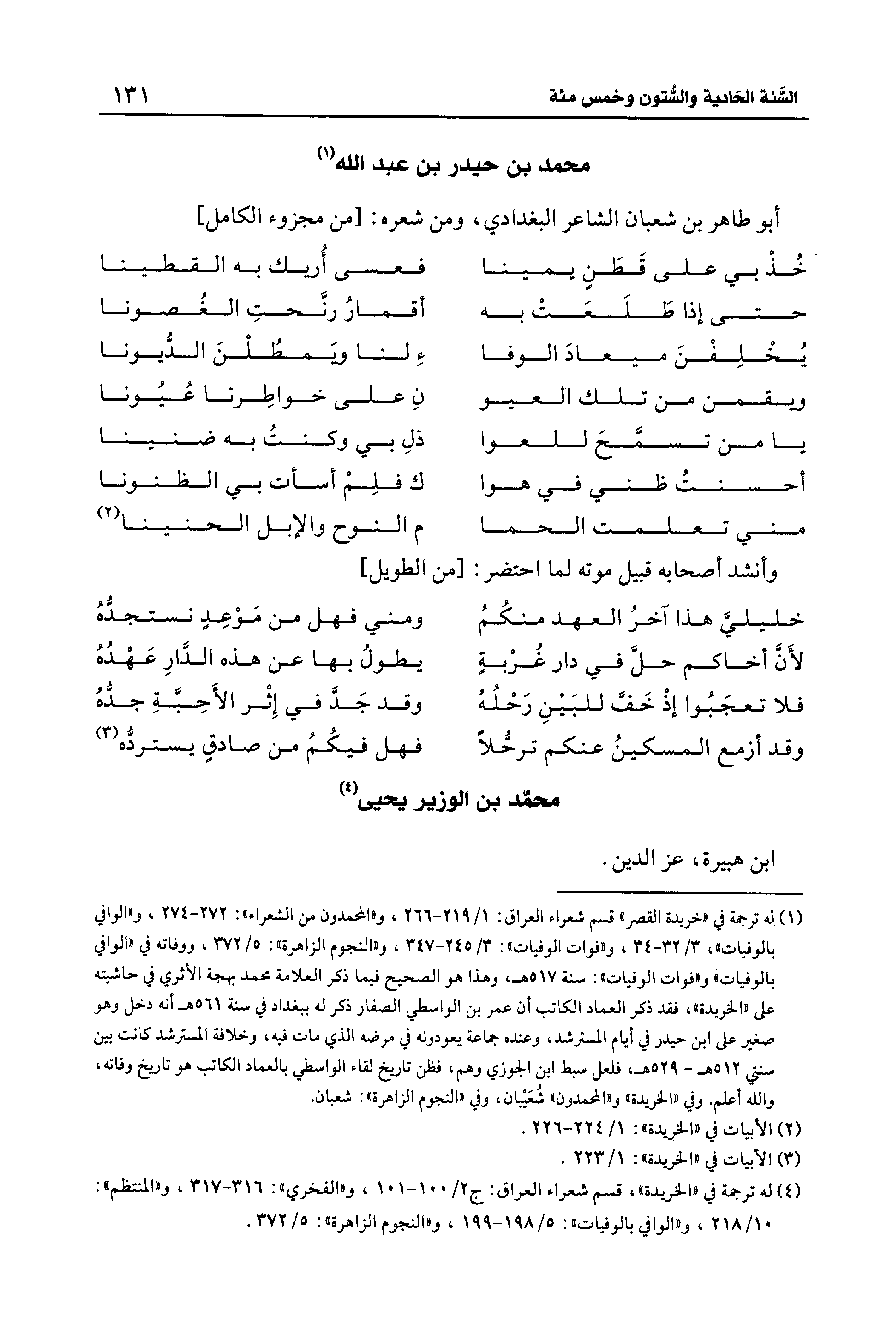 (¬1) له ترجمة في "خريدة القصر" قسم شعراء العراق: 1/ 219 - 266، و"المحمدون من الشعراء": 272 - 274، و"الوافي بالوفيات"، 3/ 32 - 34، و"فوات الوفيات": 3/ 245 - 347، و"النجوم الزاهرة": 5/ 372، ووفاته في "الوافي بالوفيات" و"فوات الوفيات": سنة 517 هـ، وهذا هو الصحيح فيما ذكر العلامة محمَّد بهجة الأثري في حاشيته على "الخريدة"، فقد ذكر العماد الكاتب أن عمر بن الواسطي الصفار ذكر له ببغداد في سنة 561 هـ أنَّه دخل وهو صغير على ابن حيدر في أيام المسترشد، وعنده جماعة يعودونه في مرضه الذي مات فيه، وخلافة المسترشد كانت بين سنتي 512 هـ - 529 هـ، فلعل سبط ابن الجوزي وهم، فظن تاريخ لقاء الواسطي بالعماد الكاتب هو تاريخ وفاته، والله أعلم. وفي "الخريدة" و "المحمدون" شُعَيْبان، وفي "النجوم الزاهرة": شعبان.