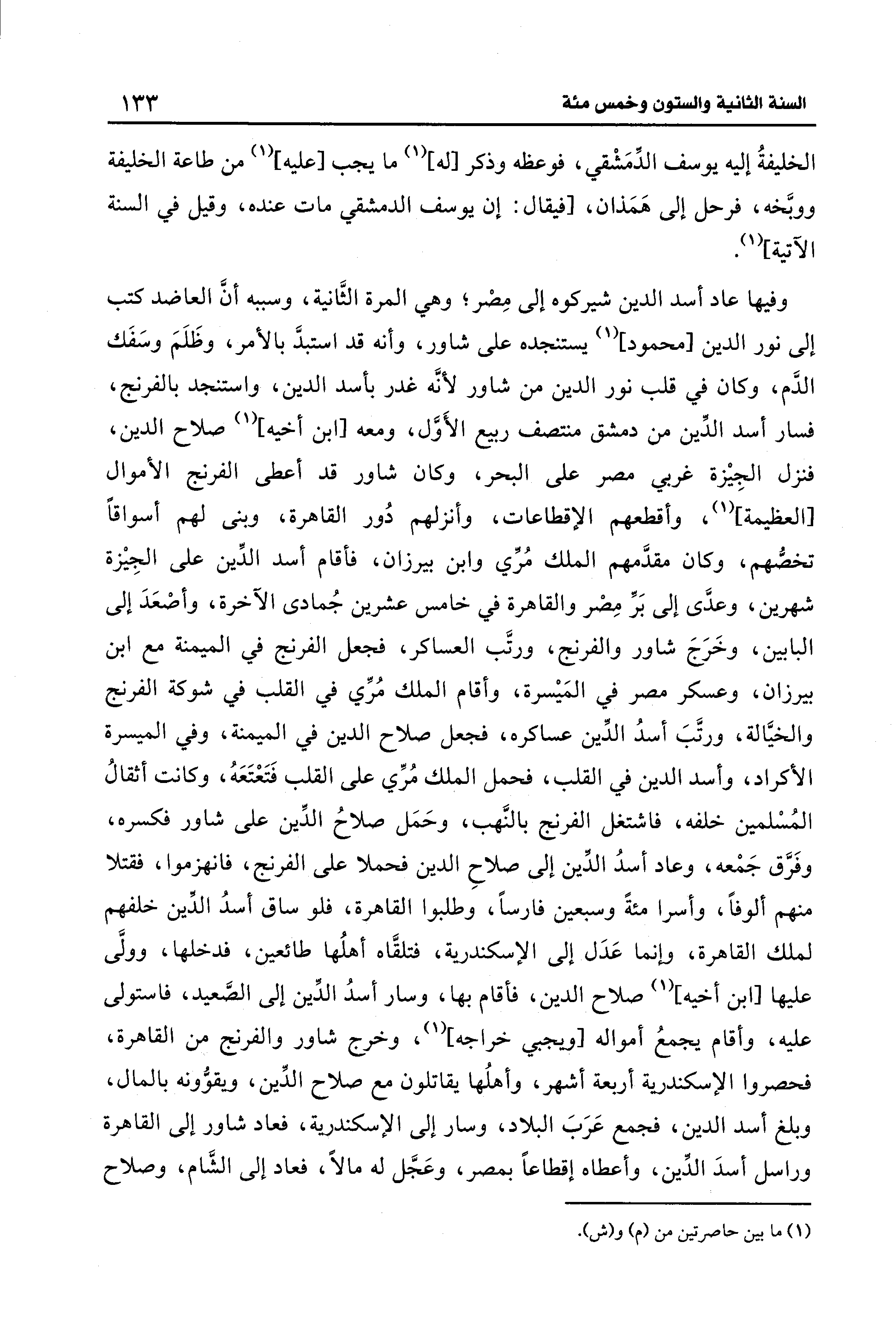 وفيها عاد أسد الدين شيركوه إلى مِصْر؛ وهي المرَّة الثَّانية، وسببه أنَّ العاضد كتب إلى نور الدين [محمود] (1) يستنجده على شاور، وأنه قد استبدَّ بالأمر، وظَلَمَ وسَفَك الدَّم، وكان في قلب نور الدين من شاور لأنَّه غدر بأسد الدين، واستنجد بالفرنج، فسار أسد الدِّين من دمشق منتصف ربيع الأَوَّل، ومعه [ابن أخيه] (1) صلاح الدين، فنزل الجِيزة غربي مصر على البحر، وكان شاور قد أعطى الفرنج الأموال [العظيمة] (1)، وأقطعهم الإقطاعات، وأنزلهم دُور القاهرة، وبنى لهم أسواقًا تخصُّهم، وكان مقدَّمهم الملك مُرِّي وابن بيرزان، فأقام أسد الدِّين على الجِيزة شهرين، وعدَّى إلى بَرِّ مِصْر والقاهرة في خامس عشرين جُمادى الآخرة، وأصْعَدَ إلى البابين، وخَرَجَ شاور والفرنج، ورتَّب العساكر، فجعل الفرنج في الميمنة مع ابن بيرزان، وعسكر مصر في المَيسرة، وأقام الملك مُرِّي في القلب في شوكة الفرنج والخيَّالة، ورتَّبَ أسدُ الدِّين عساكره، فجعل صلاح الدين في الميمنة، وفي الميسرة الأكراد، وأسد الدين في القلب، فحمل الملك مُرِّي على القلب فَتَعْتَعَهُ، وكانت أثقالُ المُسْلمين خلفه، فاشتغل الفرنج بالنَّهب، وحَمَل صلاحُ الدِّين على شاور فكسره، وفَرَّق جَمْعه، وعاد أسدُ الدِّين إلى صلاحِ الدين فحملا على الفرنج، فانهزموا، فقتلا منهم ألوفًا، وأسرا مئةً وسبعين فارسًا، وطلبوا القاهرة، فلو ساق أسدُ الدِّين خلفهم لملك القاهرة، وإنما عَدَل إلى الإسكندرية، فتلقَّاه أهلُها طائعين، فدخلها، وولَّى عليها [ابن أخيه] (1) صلاح الدين، فأقام بها، وسار أسدُ الدِّين إلى الصَّعيد، فاستولى عليه، وأقام يجمعُ أمواله [ويجبي خراجه] (¬1)، وخرج شاور والفرنج من القاهرة، فحصروا الإسكندرية أربعة أشهر، وأهلُها يقاتلون مع صلاح الدِّين، ويقوُّونه بالمال، وبلغ أسد الدين، فجمع عَرَبَ البلاد، وسار إلى الإسكندرية، فعاد شاور إلى القاهرة وراسل أسدَ الدِّين، وأعطاه إقطاعًا بمصر، وعَجَّل له مالًا، فعاد إلى الشَّام، وصلاح
