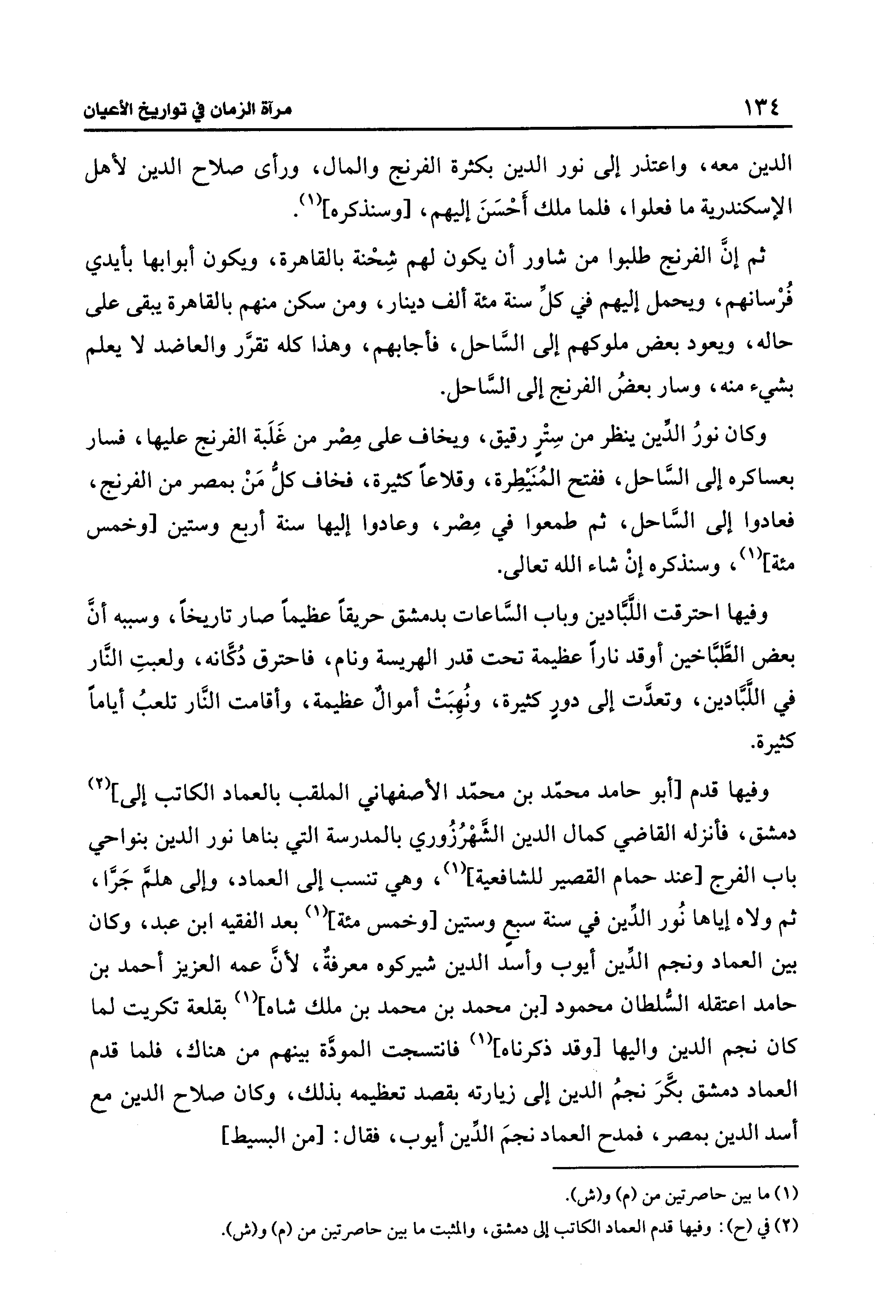 وفيها قدم [أبو حامد محمّد بن محمّد الأصفهاني الملقب بالعماد الكاتب إلى] (¬2) دمشق، فأنزله القاضي كمال الدين الشَّهْرُزُوري بالمدرسة التي بناها نور الدين بنواحي باب الفرج [عند حمام القصير للشافعية] (1)، وهي تنسب إلى العماد، وإلى هلمَّ جَرَّا، ثمَّ ولاه إياها نُور الدِّين في سنة سبعٍ وستين [وخمس مئة] (1) بعد الفقيه ابن عبد، وكان بين العماد ونجم الدِّين أيوب وأسد الدين شيركوه معرفةٌ، لأنَّ عمه العزيز أحمد بن حامد اعتقله السُّلطان محمود [بن محمَّد بن محمَّد بن ملك شاه] (1) بقلعة تكريت لما كان نجم الدين واليها [وقد ذكرناه] (1) فانتسجت المودَّة بينهم من هناك، فلما قدم العماد دمشق بكَّرَ نجمُ الدين إلى زيارته بقصد تعظيمه بذلك، وكان صلاح الدين مع أسد الدين بمصر، فمدح العماد نجمَ الدِّين أيوب، فقال: [من البسيط]