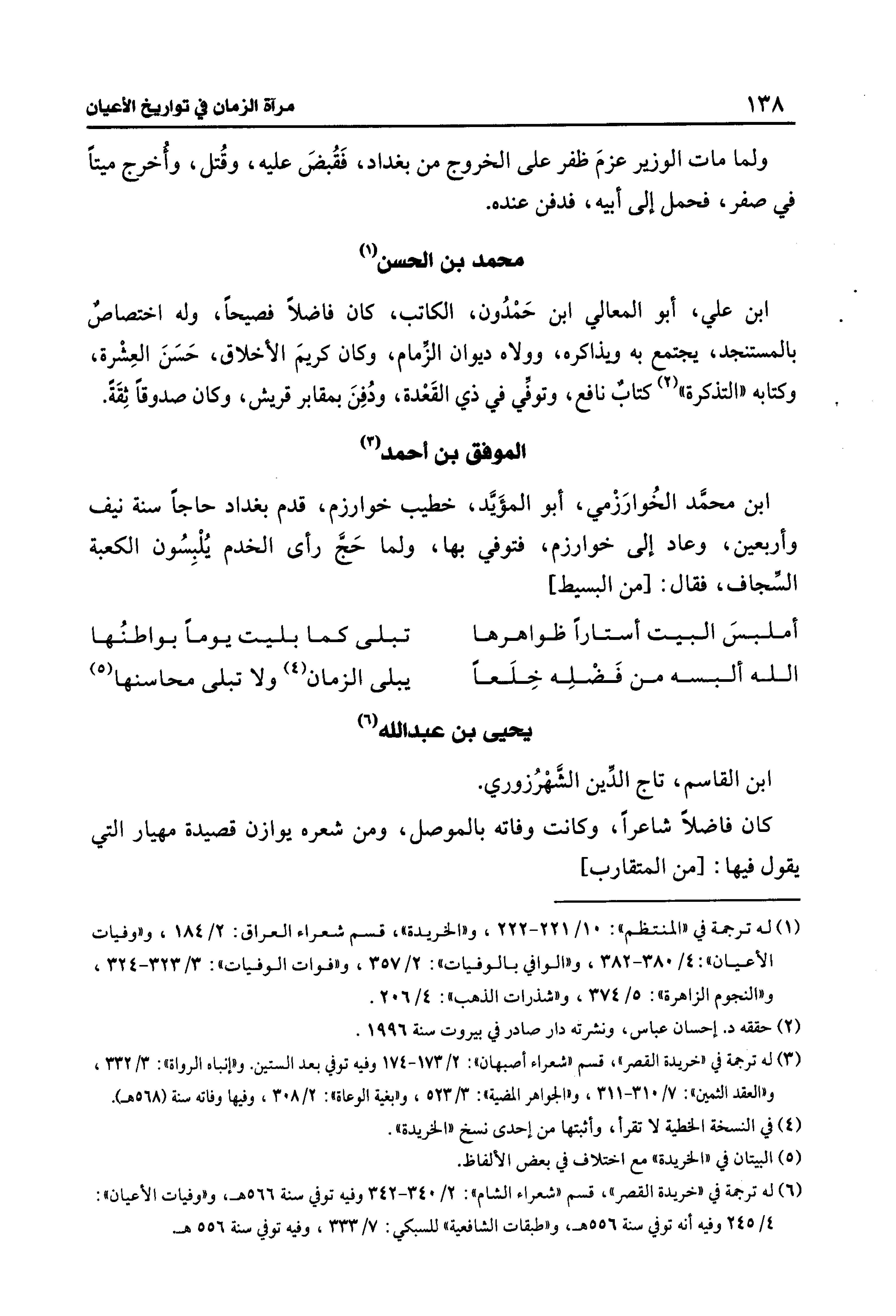 (¬6) له ترجمة في "خريدة القصر"، قسم "شعراء الشام": 2/ 340 - 342 وفيه توفي سنة 566 هـ، و"وفيات الأعيان": 4/ 245 وفيه أنَّه توفي سنة 556 هـ، و"طبقات الشافعية" للسبكي: 7/ 333، وفيه توفي سنة 556 هـ.