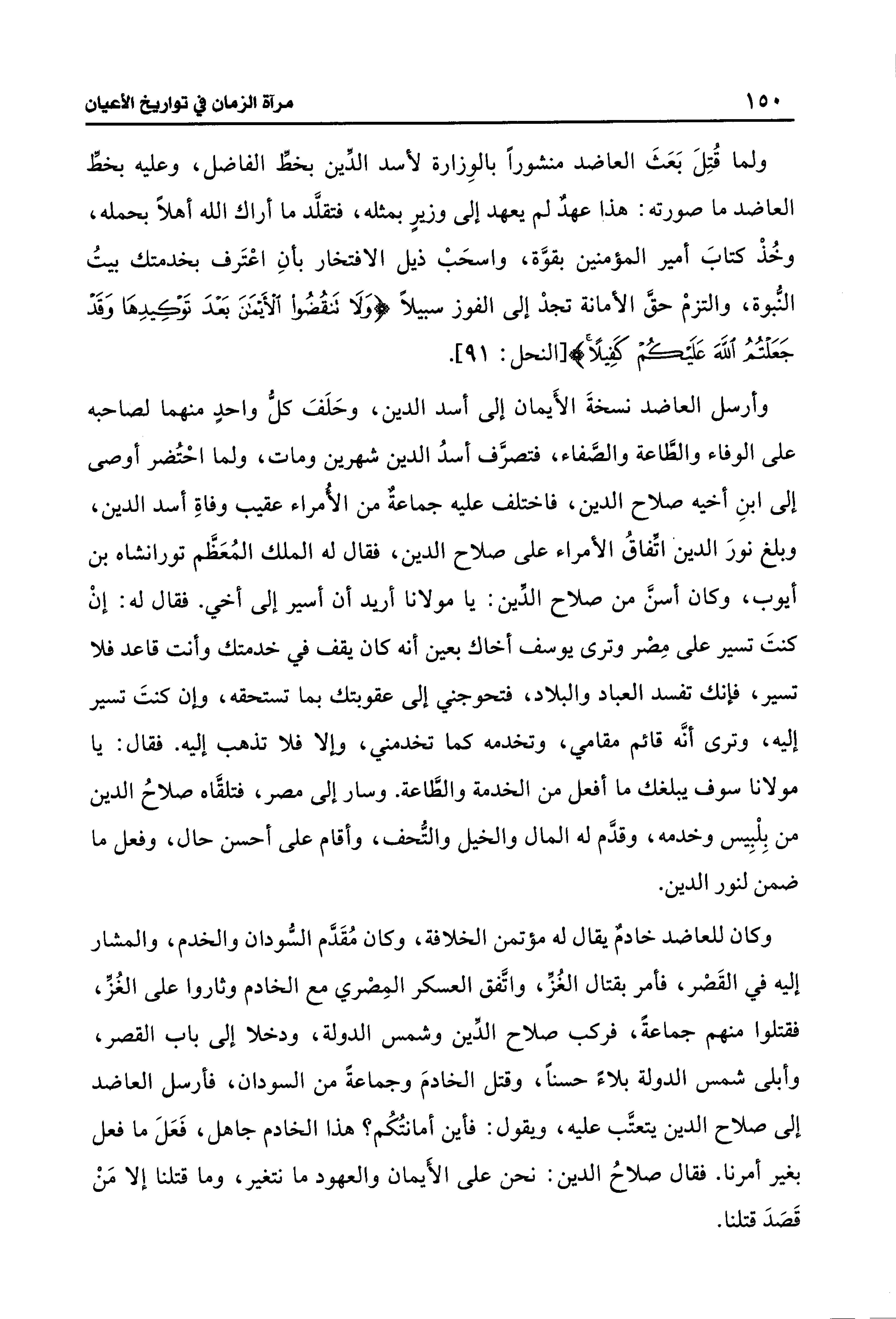 وأرسل العاضد نسخةَ الأَيمان إلى أسد الدين، وحَلَفَ كلُّ واحدٍ منهما لصاحبه على الوفاء والطَّاعة والصَّفاء، فتصرَّف أسدُ الدين شهرين ومات، ولما احْتُضر أوصى إلى ابنِ أخيه صلاح الدين، فاختلف عليه جماعةٌ من الأُمراء عقيب وفاةِ أسد الدين، وبلغ نورَ الدينْ اتِّفاقُ الأمراء على صلاح الدين، فقال له الملك المُعَظَم تورانشاه بن أيوب، وكان أسنَّ من صلاح الدِّين: يا مولانا أريد أن أسير إلى أخي. فقال له: إنْ كنتَ تسير على مِصْر وترى يوسف أخاك بعين أنَّه كان يقف في خدمتك وأنت قاعد فلا تسير، فإنك تفسد العباد والبلاد، فتحوجني إلى عقوبتك بما تستحقه، وإن كنتَ تسير إليه، وترى أنَّه قائم مقامي، وتخدمه كما تخدمني، وإلا فلا تذهب إليه. فقال: يا مولانا سوف يبلغك ما أفعل من الخدمة والطَّاعة. وسار إلى مصر، فتلفاه صلاحُ الدين من بِلْبِيس وخدمه، وقدَّم له المال والخيل والتُّحف، وأقام على أحسن حال، وفعل ما ضمن لنور الدين.
