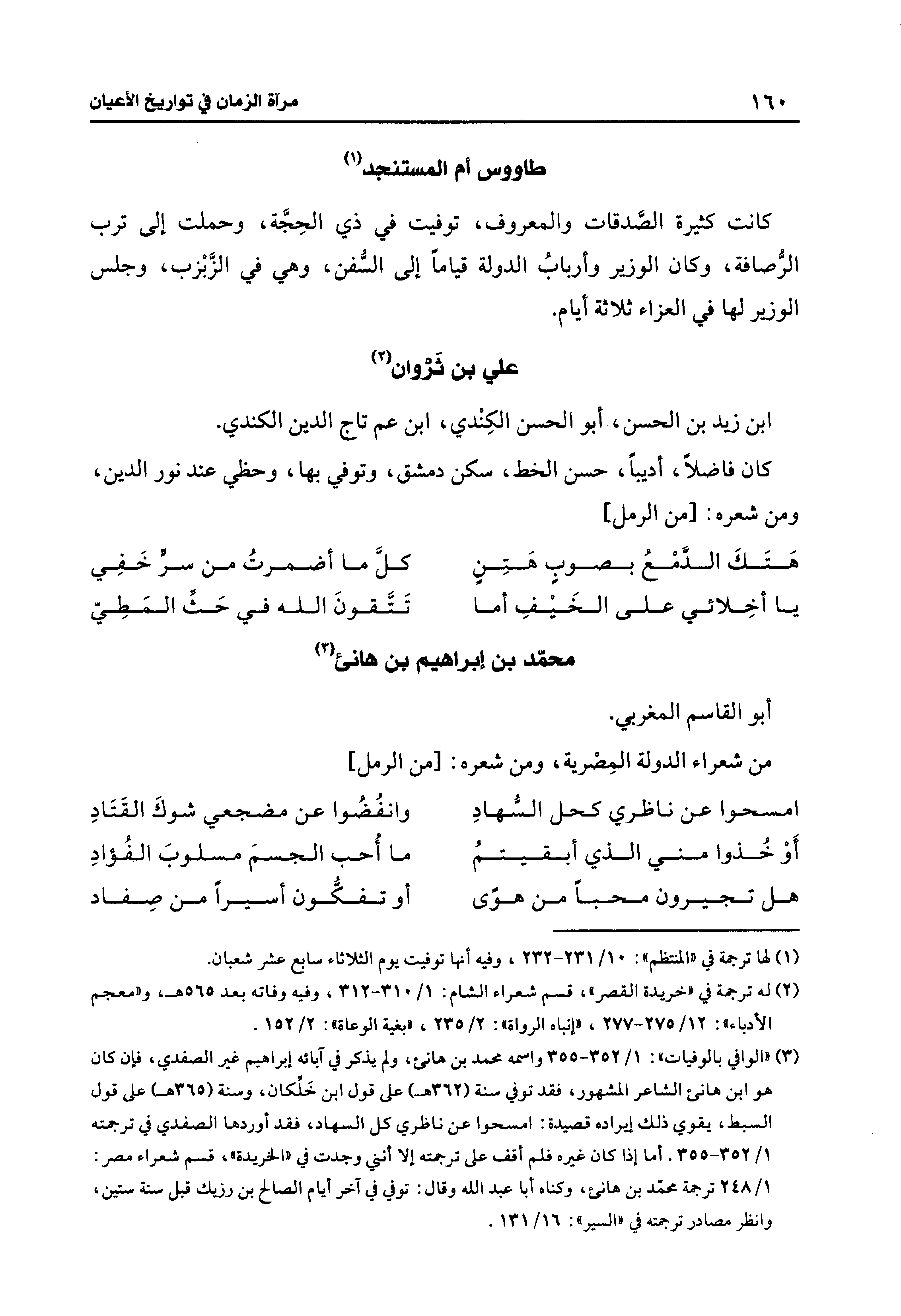(¬3) "الوافي بالوفيات": 1/ 352 - 355 واسمه محمد بن هانئ، ولم يذكر في آبائه إبراهيم غير الصفدي، فإن كان هو ابن هانئ الشاعر المشهور، فقد توفي سنة (362 هـ) على قول ابن خَلِّكان، وسنة (365 هـ) على قول السبط، يقوي ذلك إيراده قصيدة: امسحوا عن ناظري كل السهاد، فقد أوردها الصفدي في ترجمته 1/ 352 - 355 أما إذا كان غيره فلم أقف على ترجمته إلا أنني وجدت في "الخريدة"، قسم شعراء مصر: 1/ 248 ترجمة محمَّد بن هانئ، وكناه أبا عبد الله وقال: توفي في آخر أيام الصالح بن رزيك قبل سنة ستين، وانظر مصادر ترجمته في "السير": 16/ 131.
