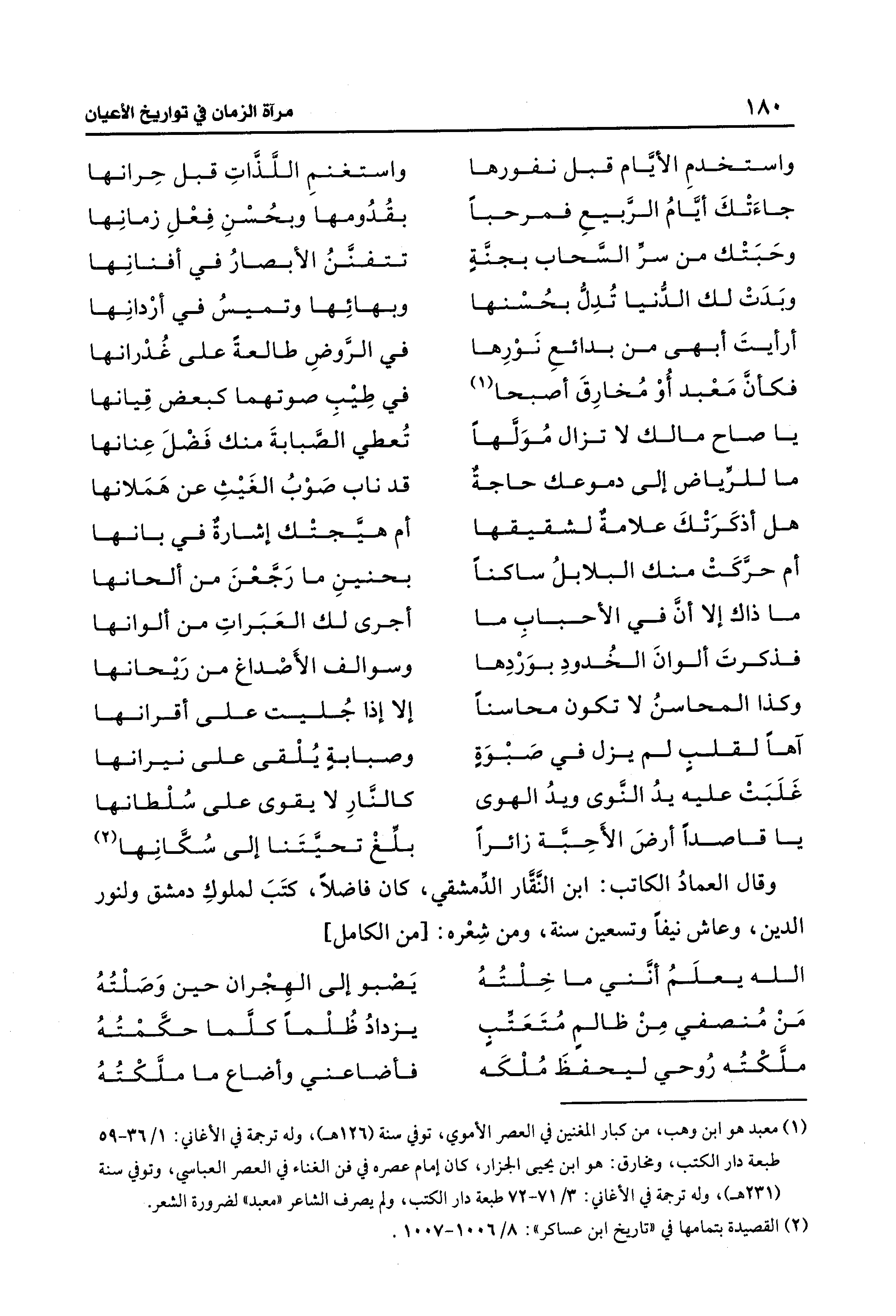 (¬1) معبد هو ابن وهب، من كبار المغنين في العصر الأموي، توفي سنة (126 هـ)، وله ترجمة في الأغاني: 1/ 36 - 59 طبعة دار الكتب، ومخارق: هو ابن يحيى الجزار، كان إمام عصره في فن الغناء في العصر العباسي، وتوفي سنة (123 هـ)، وله ترجمة في الأغاني: 3/ 71 - 72 طبعة دار الكتب، ولم يصرف الشاعر "معبد" لضرورة الشعر.