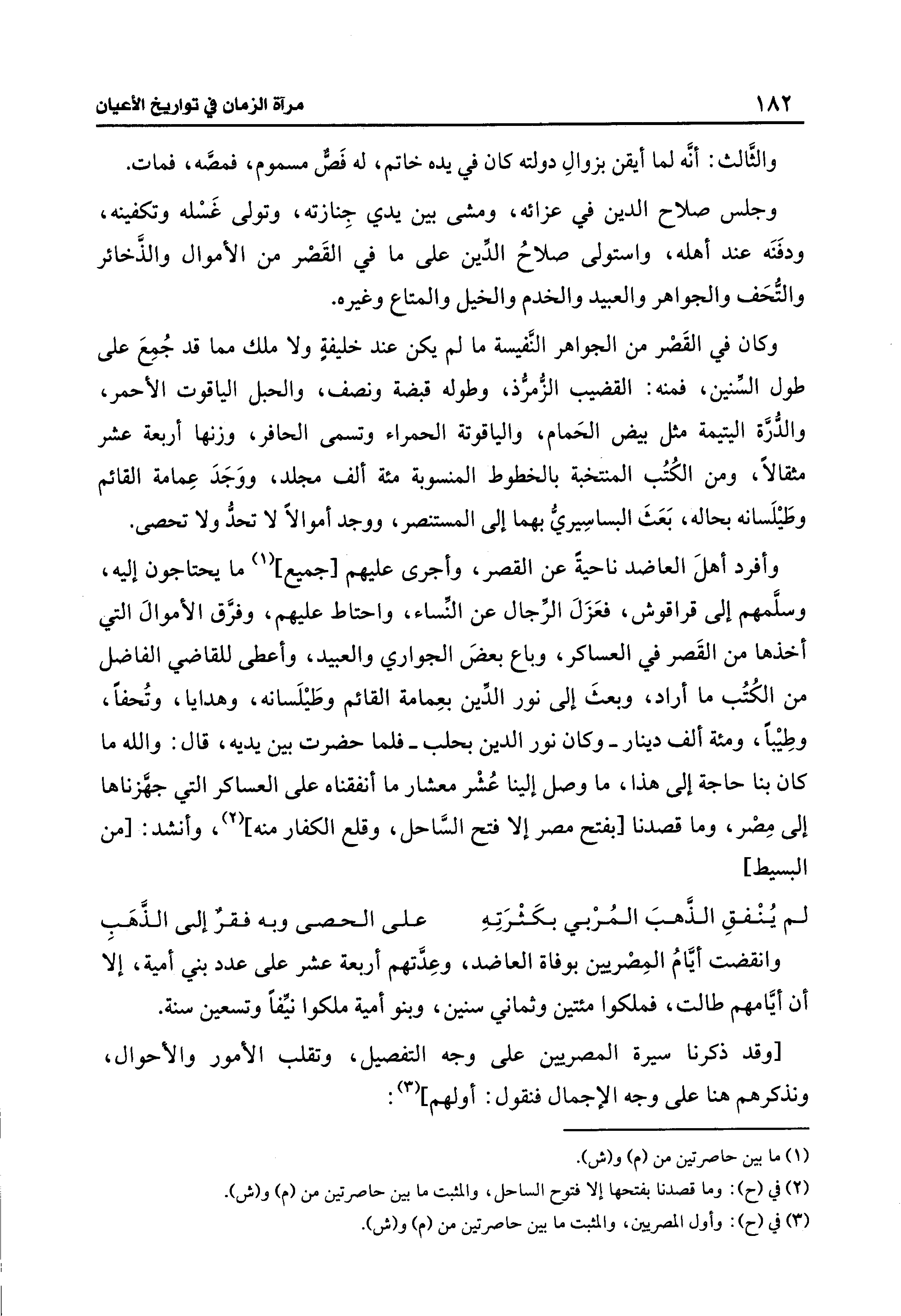 وأفرد أهلَ العاضد ناحيةَ عن القصر، وأجرى عليهم [جميع] (¬1) ما يحتاجون إليه، وسلَّمهم إلى قراقوش، فعَزَلَ الرِّجال عن النِّساء، واحتاط عليهم، وفرَّق الأموال التي أخذها من القَصر في العساكر، وباع بعضَ الجواري والعبيد، وأعطى للقاضي الفاضل من الكُتب ما أراد، وبعثَ إلى نور الدِّين بعِمامة القائم وطَيلَسانه، وهدايا، وتحفًا، وطِيبًا، ومئة ألف دينار - وكان نور الدين بحلب - فلما حضرت بين يديه، قال: والله ما كان بنا حاجة إلى هذا، ما وصل إلينا عُشْر معشار ما أنفقناه على العساكر التي جهَّزناها إلى مِصْر، وما قصدنا [بفتح مصر إلا فتح السَّاحل، وقلع الكفار منه] (¬2)، وأنشد: ] من البسيط]