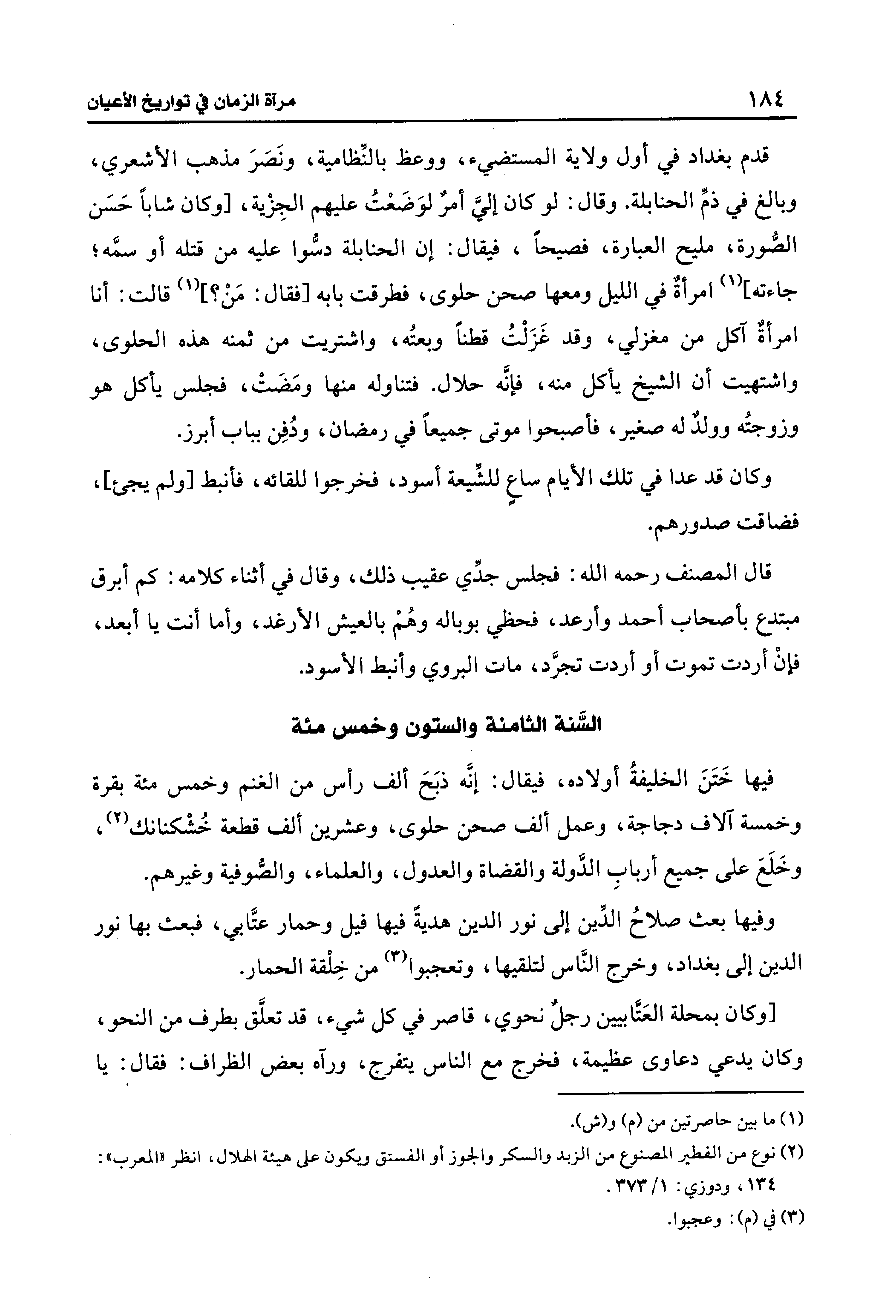 فيها خَتَنَ الخليفةُ أولاده، فيقال: إنَّه ذبَحَ ألف رأس من الغنم وخمس مئة بقرة وخمسة آلاف دجاجة، وعمل ألف صحن حلوى، وعشرين ألف قطعة خُشْكنانك (¬2)، وخَلَعَ على جميع أربابِ الدَّولة والقضاة والعدول، والعلماء، والصُّوفية وغيرهم.