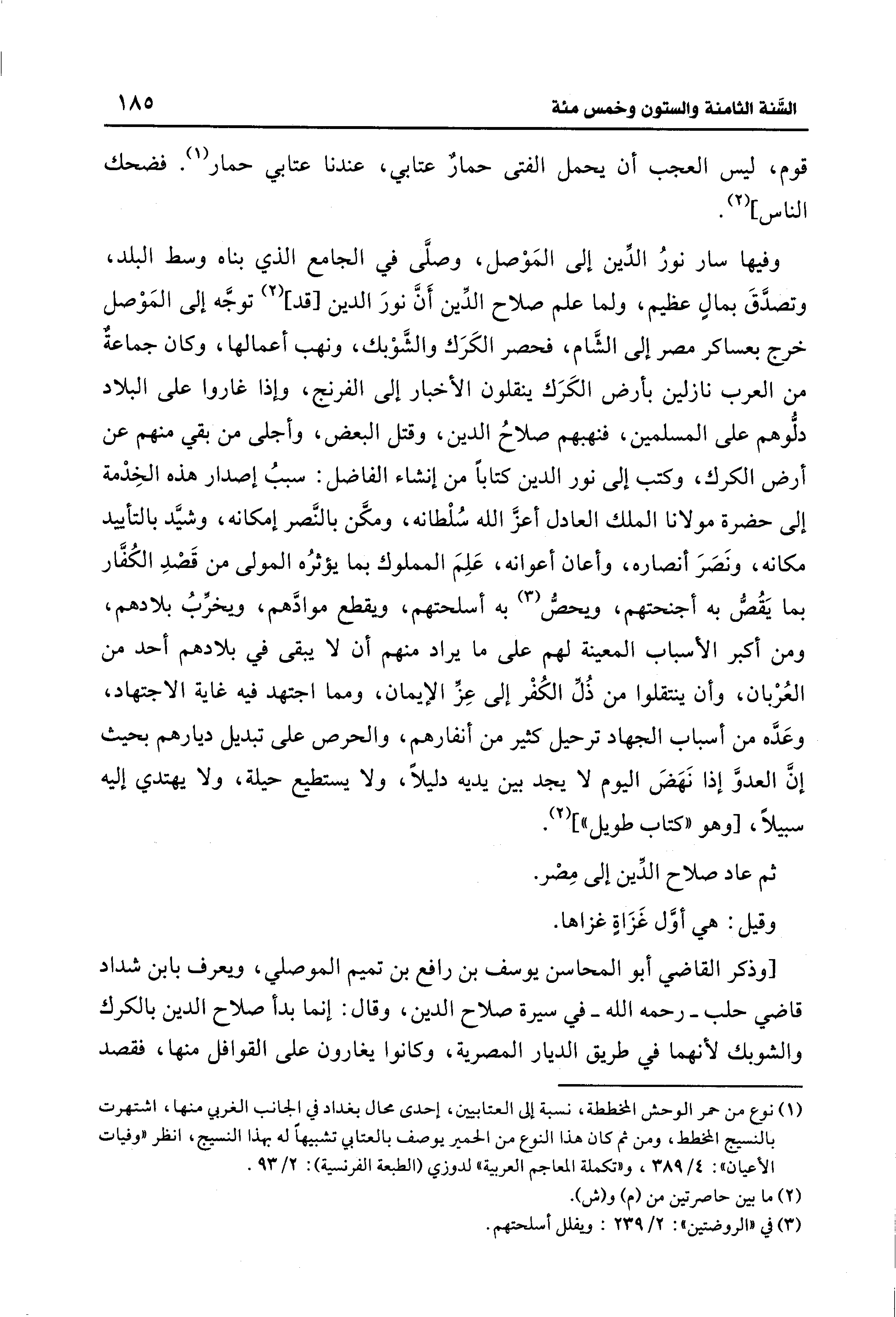 وفيها سار نورُ الدِّين إلى المَوْصل، وصلَّى في الجامع الَّذي بناه وسط البلد، وتصدَّقَ بمالٍ عظيم، ولما علم صلاح الدِّين أَنَّ نورَ الدين [قد] (2) توجَّه إلى المَوْصل خرج بعساكر مصر إلى الشَّام، فحصر الكَرَك والشَّوْبك، ونهب أعمالها، وكان جماعة من العرب نازلين بأرض الكَرَك ينقلون الأخبار إلى الفرنج، وإذا غاروا على البلاد دلُّوهم على المسلمين، فنهبهم صلاحُ الدين، وقتل البعض، وأجلى من بقي منهم عن أرض الكرك، وكتب إلى نور الدين كتابًا من إنشاء الفاضل: سببُ إصدار هذه الخِدْمة إلى حضرة مولانا الملك العادل أعزَّ الله سُلْطانه، ومكَّن بالنَّصر إمكانه، وشيَّد بالتأييد مكانه، ونَصَرَ أنصاره، وأعان أعوانه، عَلِمَ المملوك بما يؤثرُه المولى من قَصْدِ الكُفَّار بما يَقُصُّ به أجنحتهم، ويحصُّ (¬3) به أسلحتهم، ويقطع موادَّهم، ويخرِّبُ بلادهم، ومن أكبر الأسباب المعينة لهم على ما يراد منهم أن لا يبقى في بلادهم أحد من العُرْبان، وأن ينتقلوا من ذُلِّ الكُفْر إلى عِزِّ الإيمان، ومما اجتهد فيه غاية الاجتهاد، وعَدَّه من أسباب الجهاد ترحيل كثير من أنفارهم، والحرص على تبديل ديارهم بحيث إنَّ العدوَّ إذا نَهَضَ اليوم لا يجد بين يديه دليلًا، ولا يستطيع حيلة، ولا يهتدي إليه سبيلًا، [وهو "كتاب طويل"] (2).