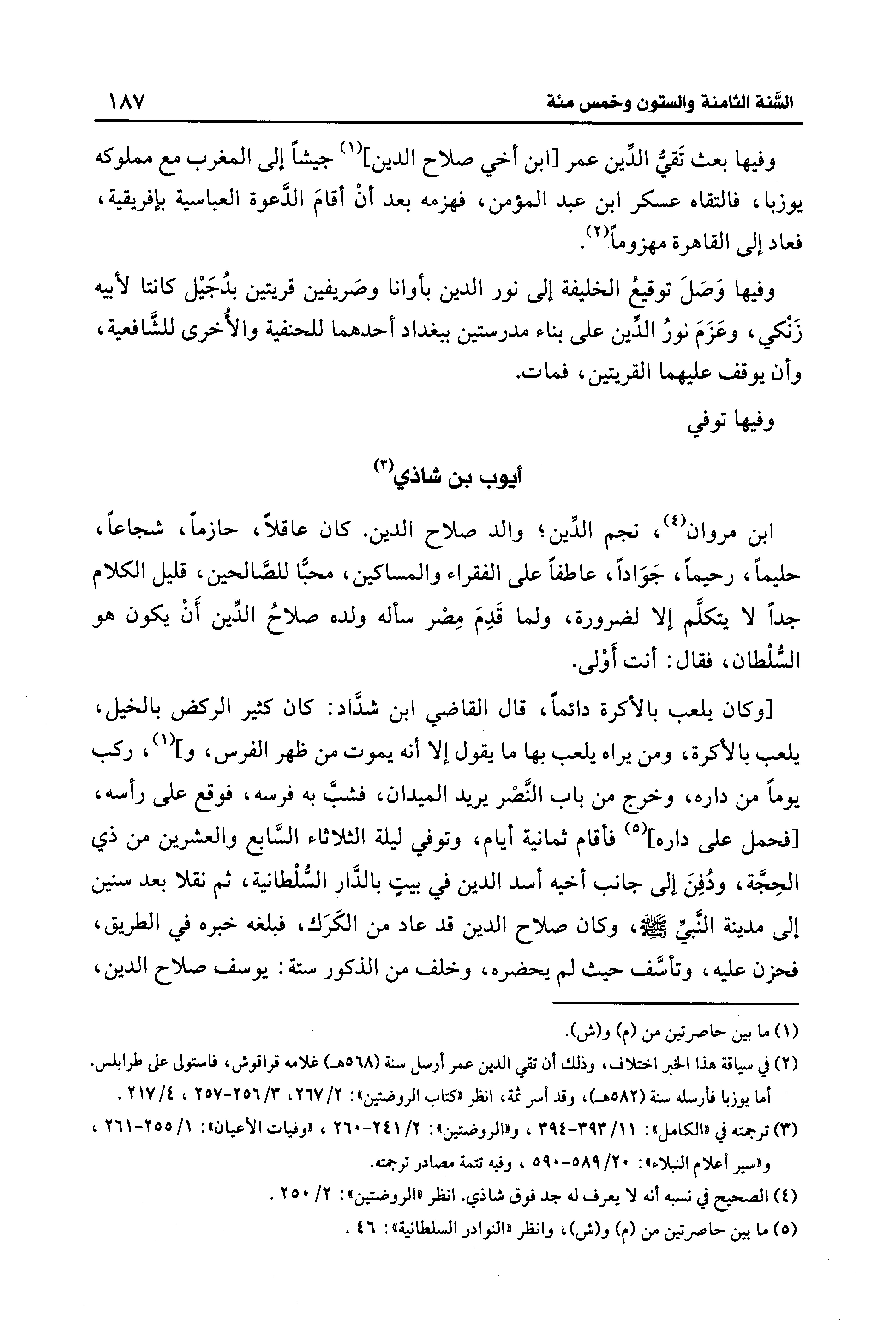 (¬3) ترجمته في "الكامل": 11/ 393 - 394، و"الروضتين": 2/ 241 - 260، "وفيات الأعيان": 1/ 255 - 261، و"سير أعلام النبلاء": 20/ 589 - 590، وفيه تتمة مصادر ترجمته.