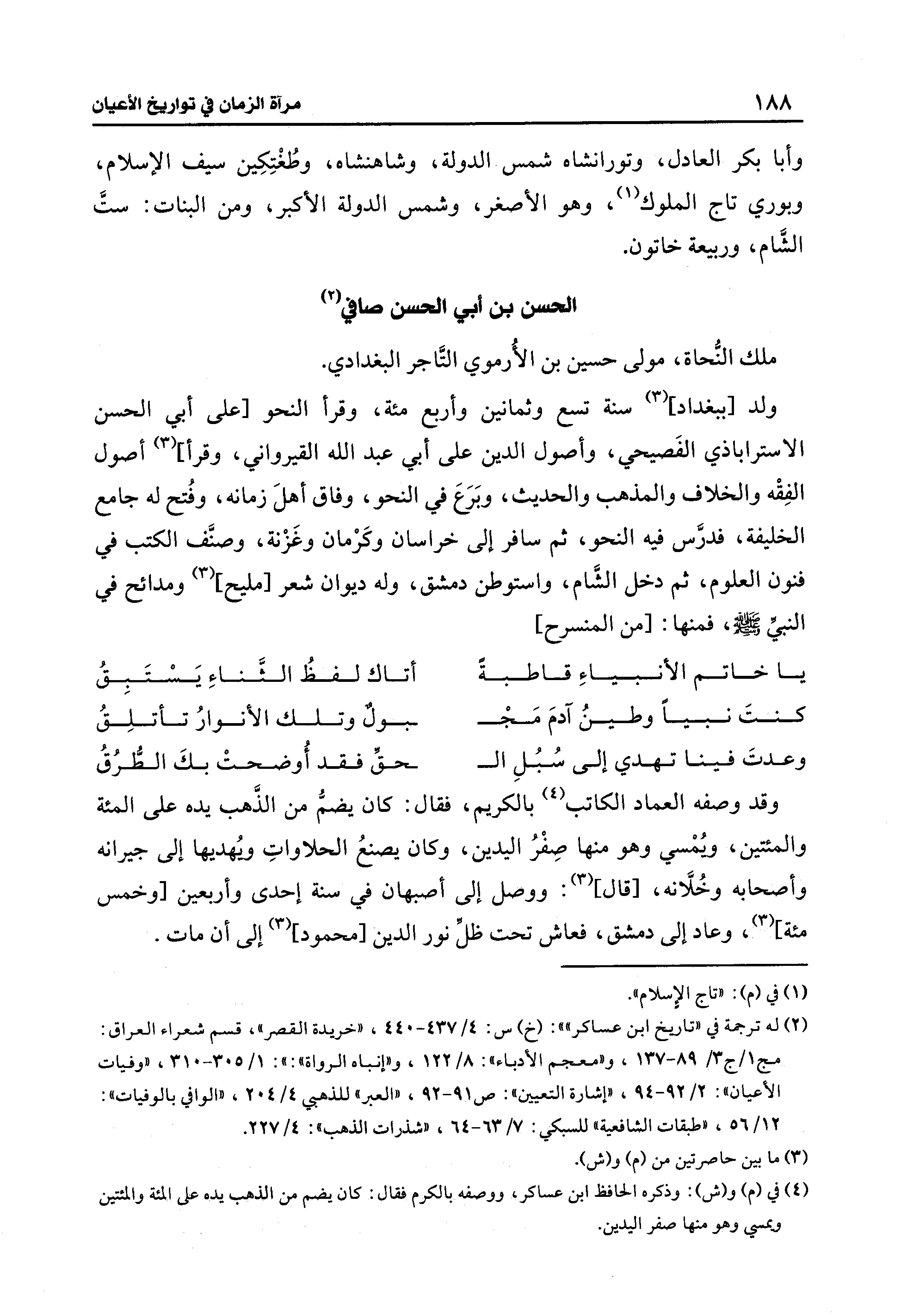ولد [ببغداد] (3) سنة تسع وثمانين وأربع مئة، وقرأ النحو [على أبي الحسن الاستراباذي الفَصيحي، وأصول الدين على أبي عبد الله القيرواني، وقرأ] (3) أصول الفِقْه والخلاف والمذهب والحديث، وبَرَعَ في النحو، وفاق أهلَ زمانه، وفُتح له جامع الخليفة، فدرَّس فيه النحو، ثم سافر إلى خراسان وكَرْمان وغَزْنة، وصنَّف الكتب في فنون العلوم، ثم دخل الشَّام، واستوطن دمشق، وله ديوان شعر [مليح] (¬3) ومدائح في النبيِّ - صلى الله عليه وسلم -، فمنها: [من المنسرح]