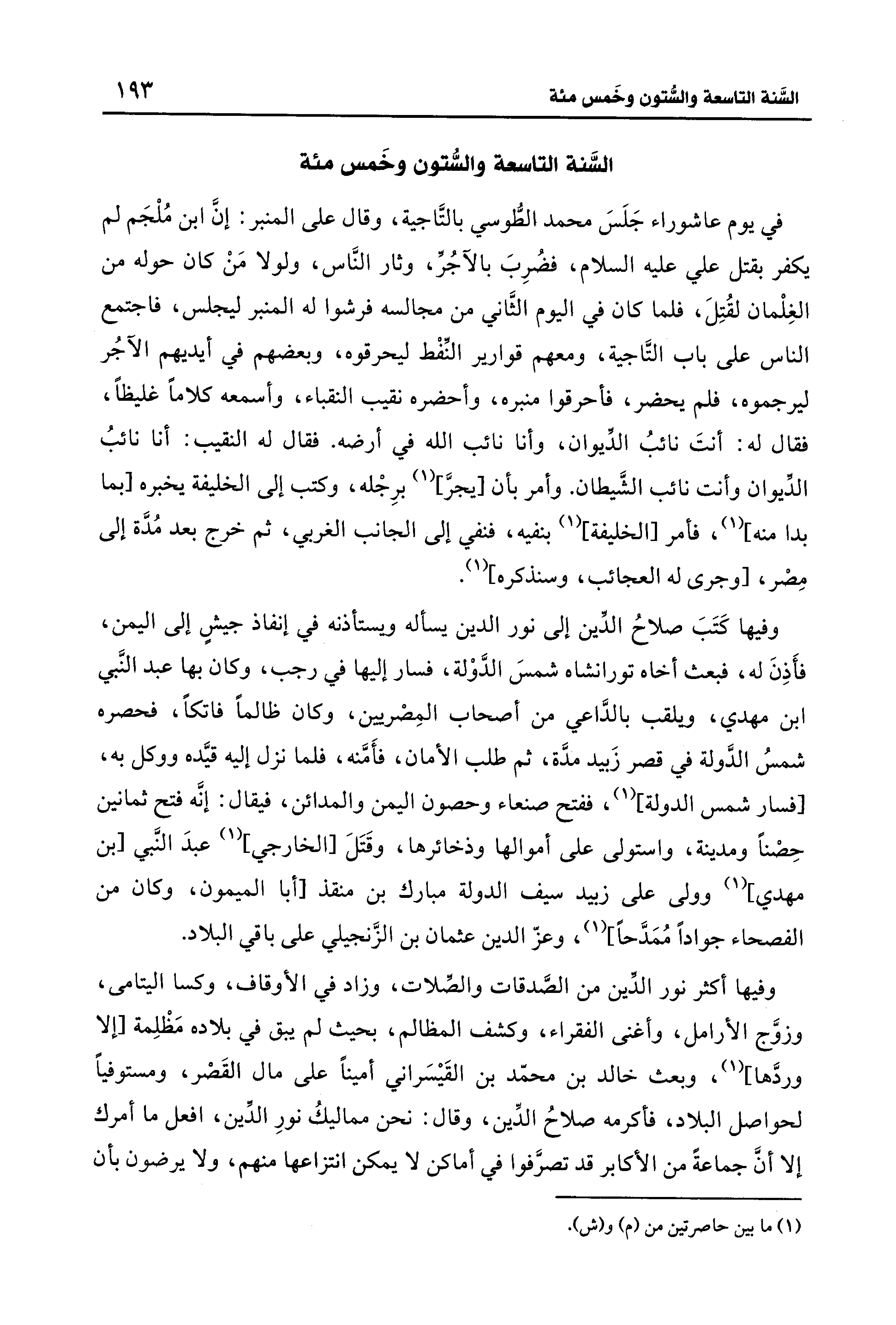 وفيها أكثر نور الدِّين من الصَّدقات والصِّلات، وزاد في الأوقاف، وكسا اليتامى، وزوَّج الأرامل، وأغنى الفقراء، وكشف المظالم، بحيث لم يبق في بلاده مَظْلِمة [إلا وردَّها] (¬1)، وبعث خالد بن محمّد بن القَيسَراني أمينًا على مال القَصْر، ومستوفيًا لحواصل البلاد، فأكرمه صلاحُ الدِّين، وقال: نحق مماليكُ نورِ الدِّين، افعل ما أمرك إلا أنَّ جماعةً من الأكابر قد تصرَّفوا في أماكن لا يمكن انتزاعها منهم، ولا يرضون بأن