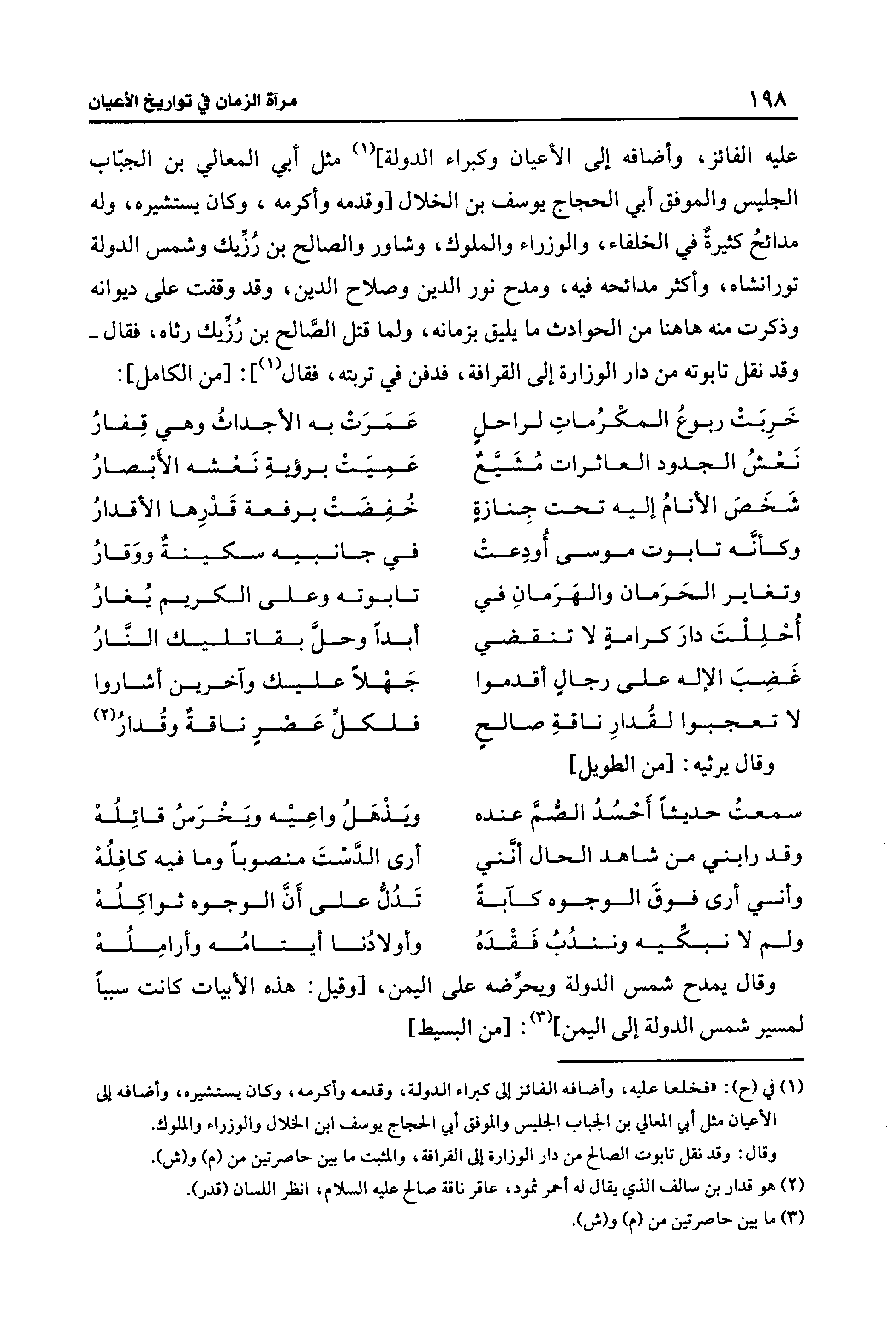 عليه الفائز، وأضافه إلى الأعيان وكبراء الدولة] (1) مثل أبي المعالي بن الجبّاب الجليس والموفق أبي الحجاج يوسف بن الخلال [وقدمه وأكرمه، وكان يستشيره، وله مدائحُ كثيرةٌ في الخلفاء، والوزراء والملوك، وشاور والصالح بن رُزِّيك وشمس الدولة تورانشاه، وأكثر مدائحه فيه، ومدخ نور الدين وصلاح الدين، وقد وقفت على ديوانه وذكرت منه هاهنا من الحوادث ما يليق بزمانه، ولما قتل الصَّالح بن رُزِّيك رثاه، فقال- وقد نقل تابوته من دار الوزارة إلى القرافة، فدفن في تربته، فقال (¬1)]: [من الكامل]: