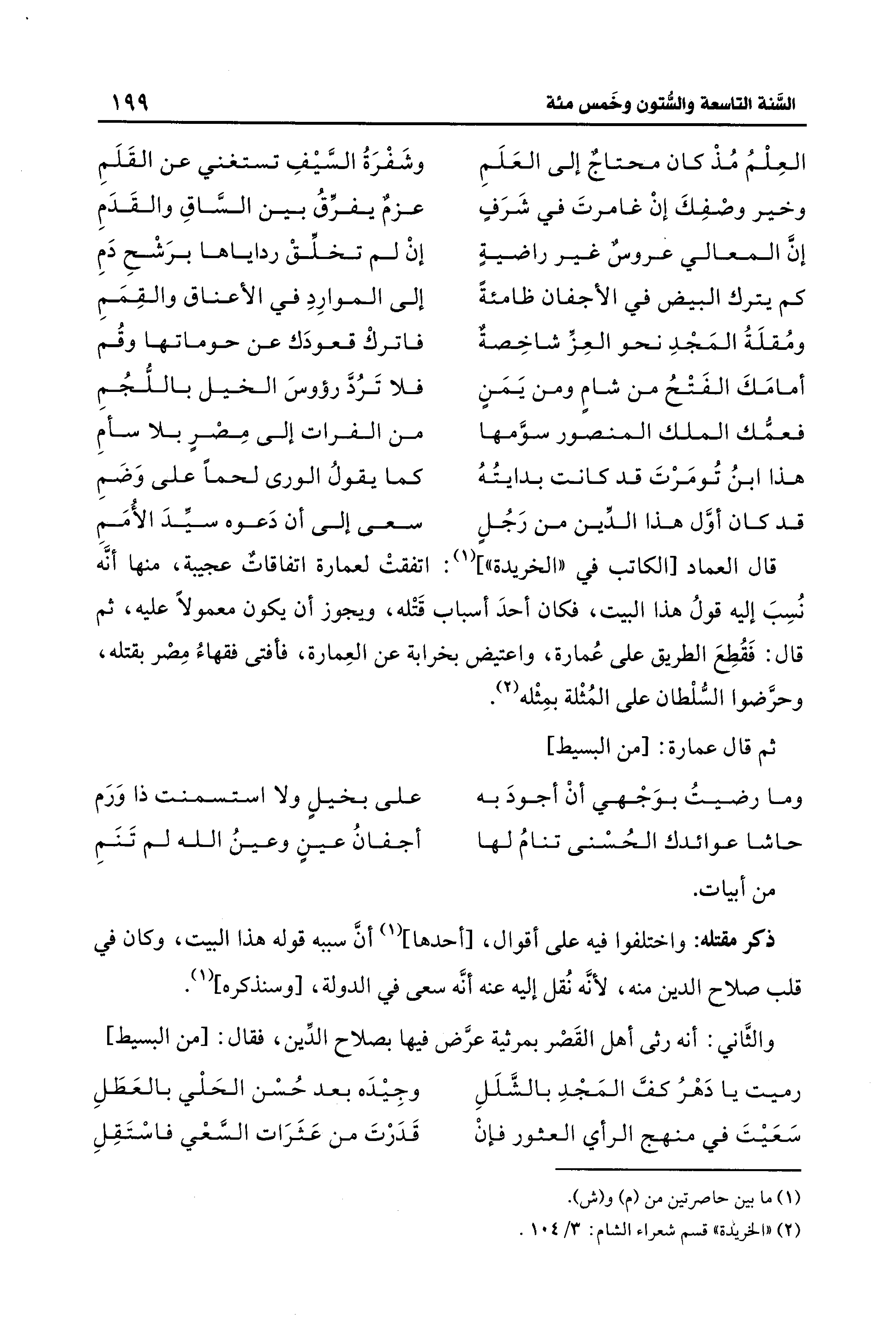 قال العماد [الكاتب في "الخريدة"] (¬1): اتفقتْ لعمارة اتفاقاتٌ عجيبة، منها أنَّه نُسِبَ إليه قولُ هذا البيت، فكان أحدَ أسباب قَتْله، ويجوز أن يكون معمولًا عليه، ثم قال: فَقُطِعَ الطريق على عُمارة، واعتيض بخرابة عن العِمارة، فأفتى فقهاءُ مِصْر بقتله، وحرَّضوا السُّلْطان على المُثْلة بمِثْله (¬2).