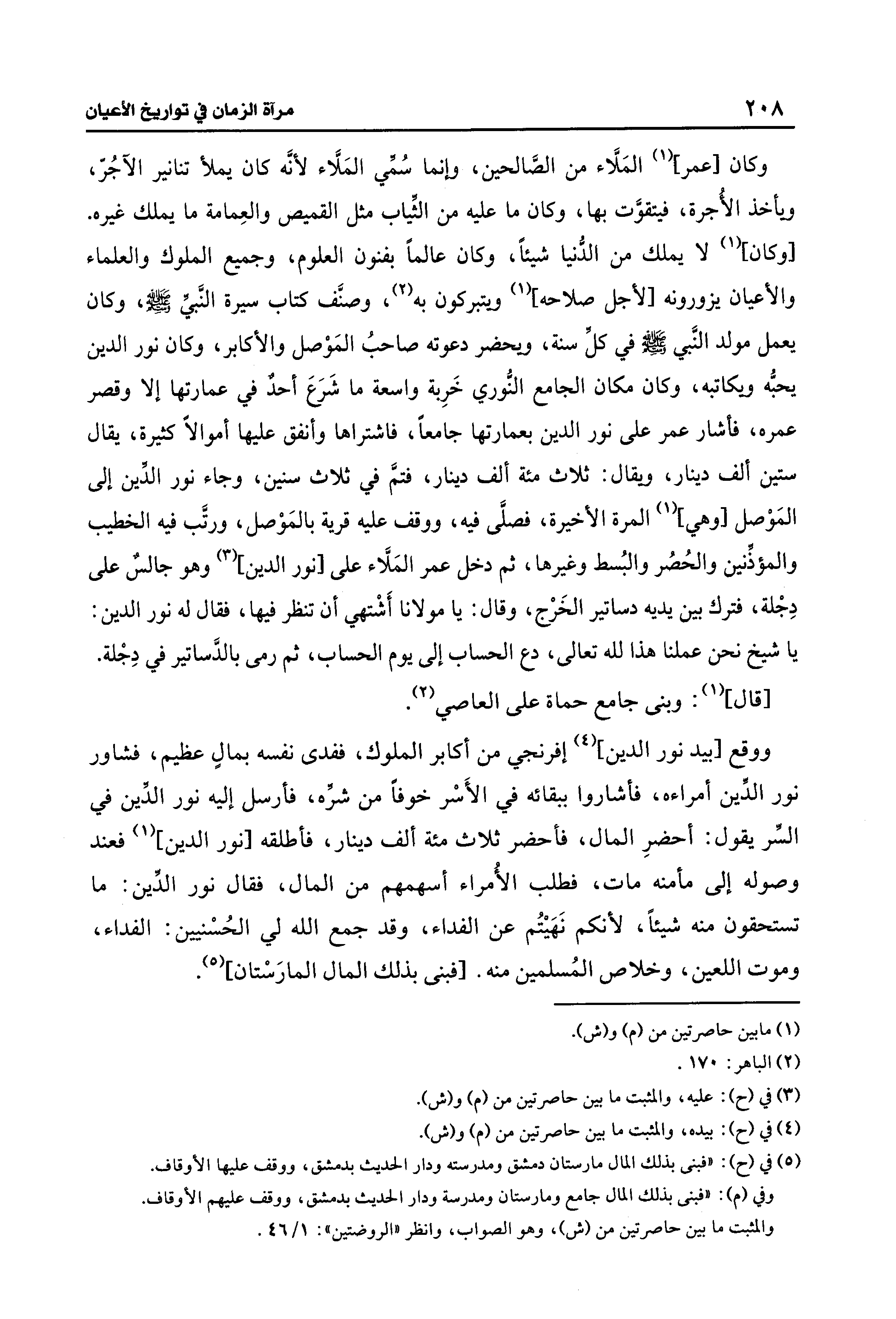 (¬5) في (ح): "فبنى بذلك المال مارستان دمشق ومدرسته ودار الحديث بدمشق، ووقف عليها الأوقاف. وفي (م): "فبنى بذلك المال جامع ومارستان ومدرسة ودار الحديث بدمشق، ووقف عليهم الأوقاف. والمثبت ما بين حاصرتين من (ش)، وهو الصواب، وانظر "الروضتين": 1/ 46.
