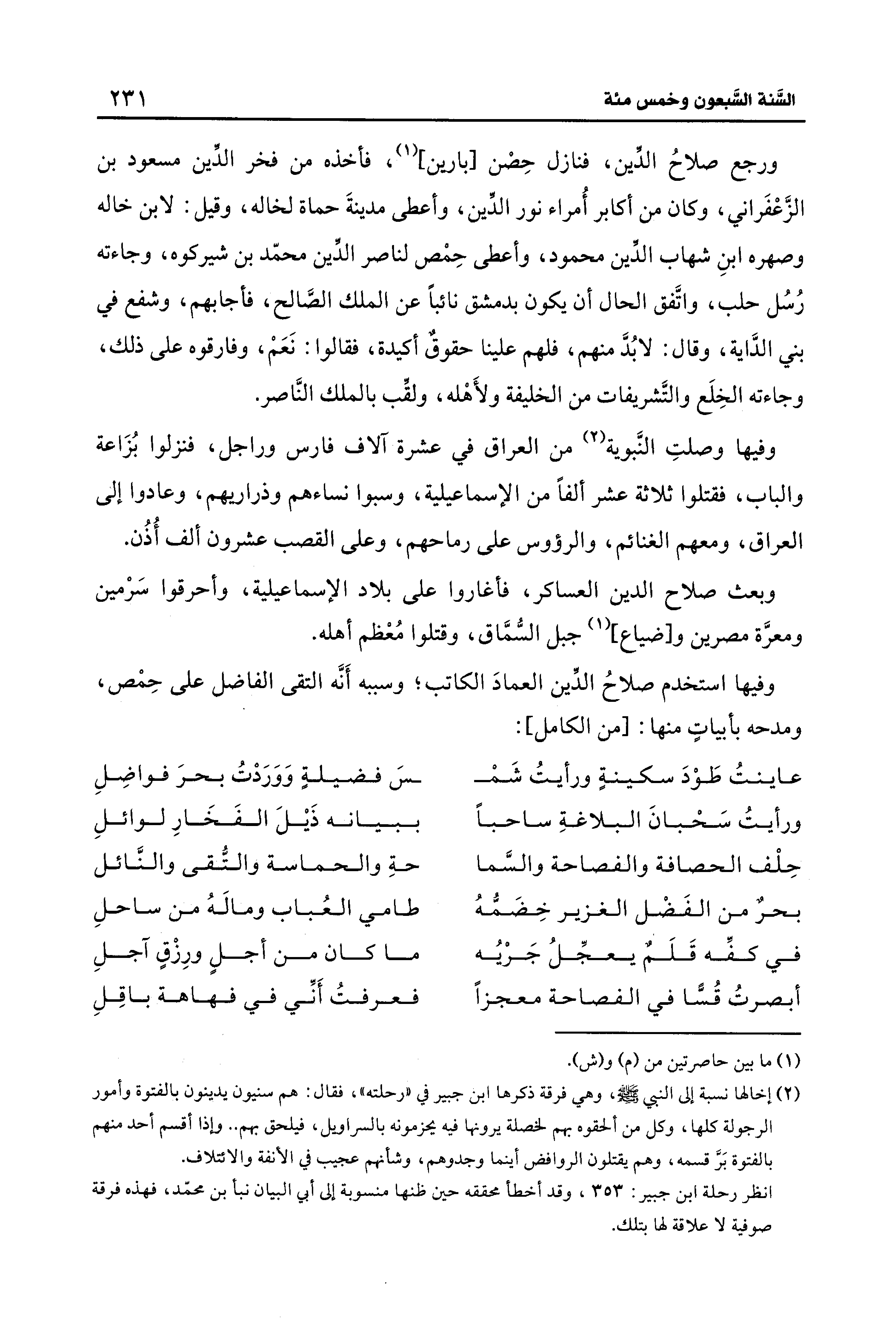 وفيها استخدم صلاحُ الدِّين العمادَ الكاتب؛ وسببه أَنَّه التقى الفاضل على حِمْص، ومدحه بأبياتٍ منها: [من الكامل]: