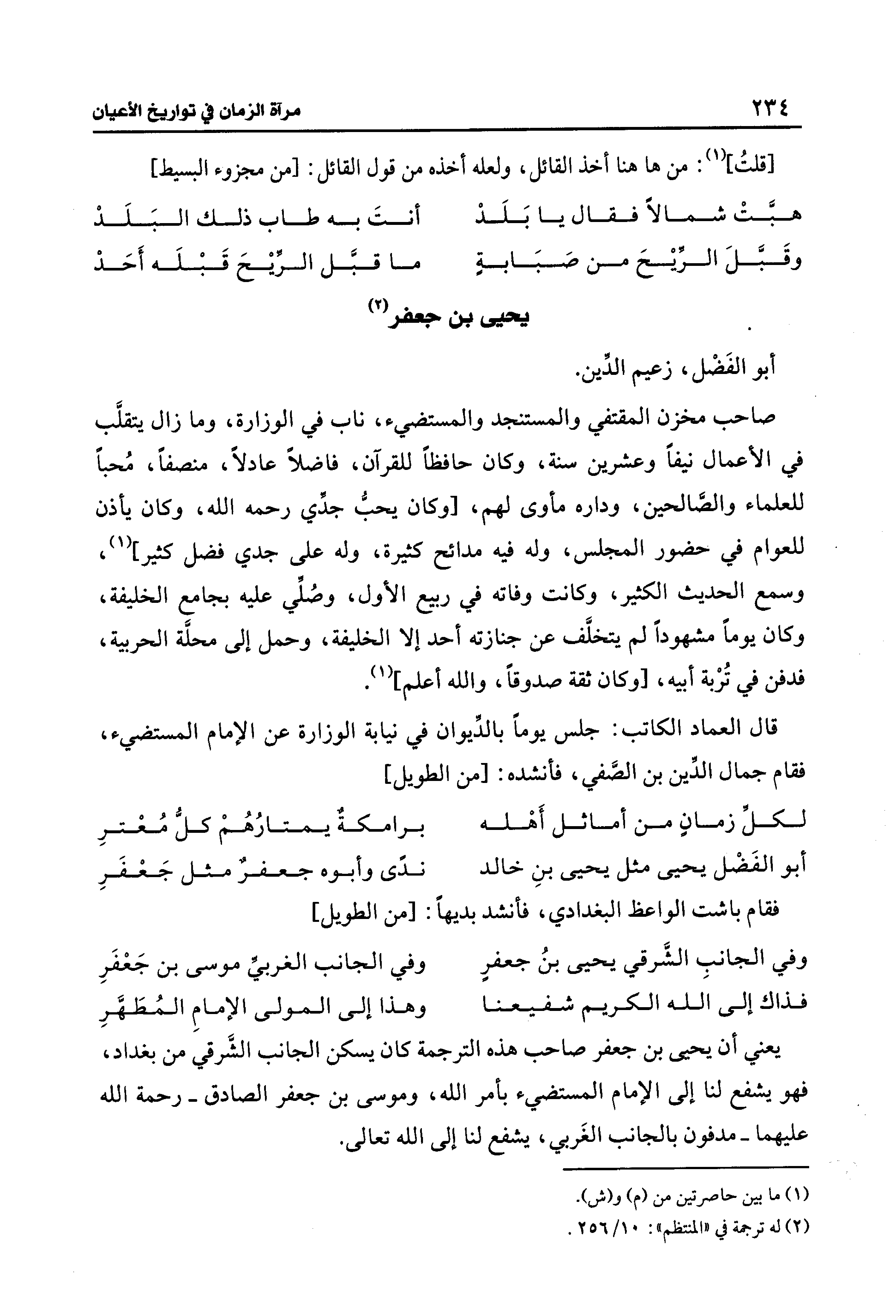 يعني أن يحيى بن جعفر صاحب هذه الترجمة كان يسكن الجانب الشَّرقي من بغداد، فهو يشفع لنا إلى الإمام المستضيء بأمر الله، وموسى بن جعفر الصادق -رحمة الله عليهما- مدفون بالجانب الغَربي، يشفع لنا إلى الله تعالى.