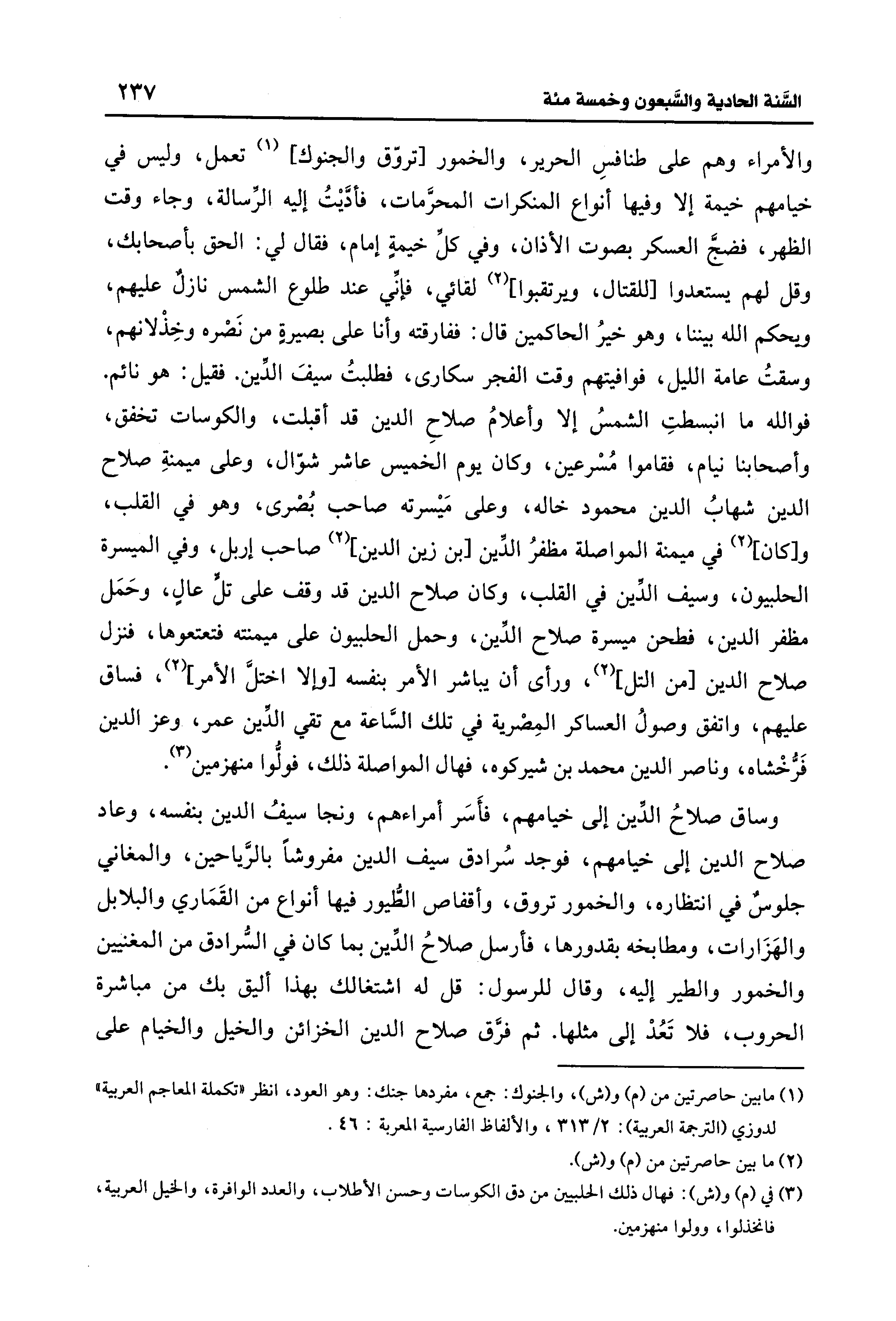 والأمراء وهم على طنافسِ الحرير، والخمور [تروّق والجنوك] (¬1) تعمل، وليس في خيامهم خيمة إلا وفيها أنواع المنكرات المحرَّمات، فأدَّيتُ إليه الرِّسالة، وجاء وقت الظهر، فضجَّ العسكر بصوت الأذان، وفي كلِّ خيمةٍ إمام، فقال لي: الحق بأصحابك، وقل لهم يستعدوا [للقتال، ويرتقبوا] (2) لقائي، فإنِّي عند طلوع الشمس نازلٌ عليهم، ويحكم الله بيننا، وهو خيرُ الحاكمين قال: ففارقته وأنا على بصيرةٍ من نَصْره وخِذْلانهم، وسقتُ عامة الليل، فوافيتهم وقت الفجر سكارى، فطلبتُ سيفَ الدِّين. فقيل: هو نائم. فوالله ما انبسطتِ الشمسُ إلا وأعلامُ صلاحِ الدين قد أقبلت، والكوسات تخفق، وأصحابنا نيام، فقاموا مُسْرعين، وكان يوم الخميس عاشر شوّال، وعلى ميمنةِ صلاح الدين شهابُ الدين محمود خاله، وعلى مَيسرته صاحب بُصْرى، وهو في القلب، و [كان] (2) في ميمنة المواصلة مظفرُ الدِّين [بن زين الدين] (2) صاحب إربل، وفي الميسرة الحلبيون، وسيف الدِّين في القلب، وكان صلاح الدين قد وقف على تلٍّ عالٍ، وحَمَل مظفر الدين، فطحن ميسرة صلاح الدِّين، وحمل الحلبيون على ميمنته فتعتعوها، فنزل صلاح الدين [من التل] (2)، ورأى أن يباشر الأمر بنفسه [وإلا اختلَّ الأمر] (¬2)، فساق عليهم، واتفق وصولُ العساكر المِصْرية في تلك السَّاعة مع تقي الدِّين عمر، وعز الدين فَرُّخْشاه، وناصر الدين محمد بن شيركوه، فهال المواصلة ذلك، فولُّوا منهزمين (¬3).