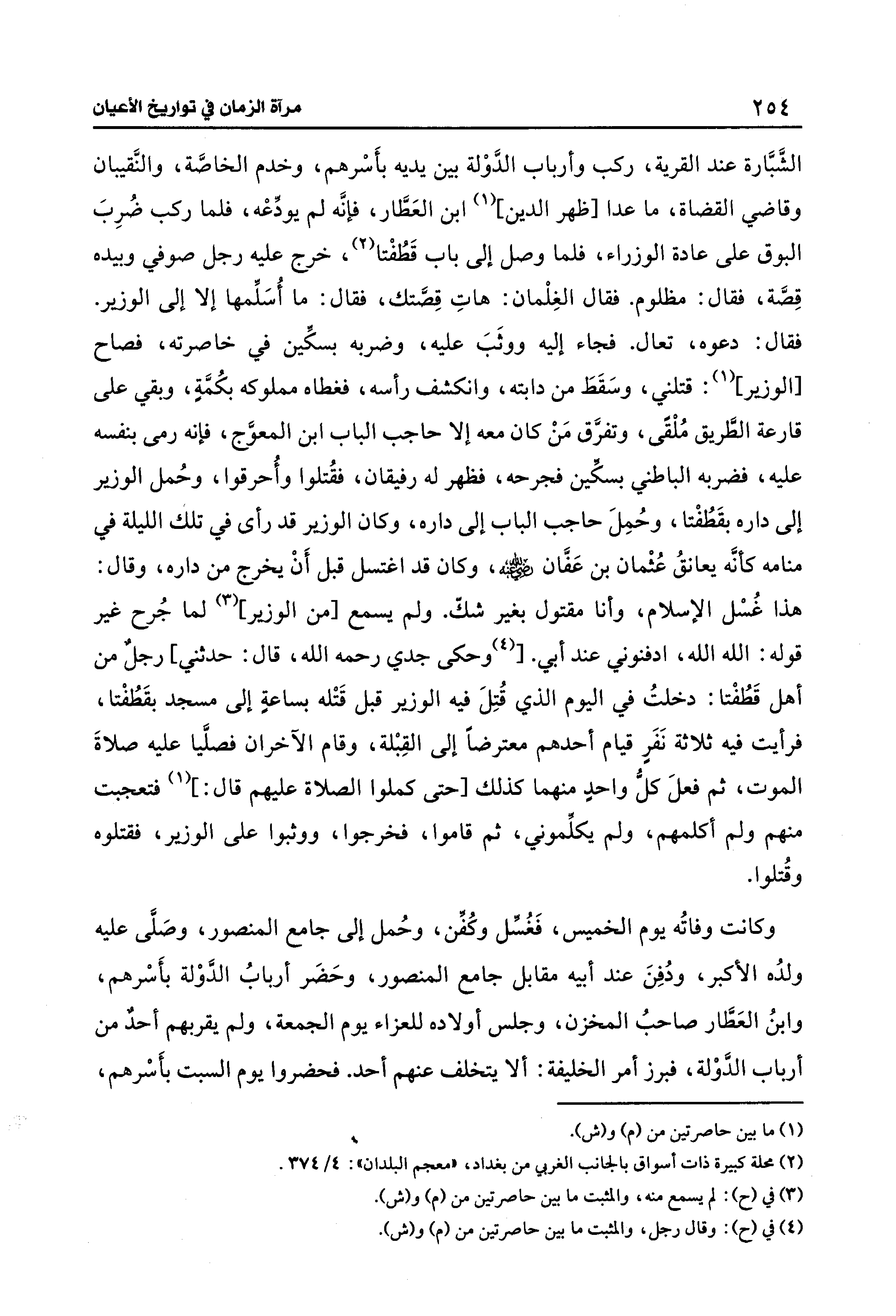 الشَّبَّارة عند القرية، ركب وأرباب الدَّوْلة بين يديه بأَسْرهم، وخدم الخاصَّة، والنَّقيبان وقاضي القضاة، ما عدا [ظهر الدين] (¬1) ابن العَطَّار، فإنَّه لم يودِّعْه، فلما ركب ضُرِبَ البوق على عادة الوزراء، فلما وصل إلى باب قَطُفْتا (¬2)، خرج عليه رجل صوفي وبيده قِصَّة، فقال: مظلوم. فقال الغِلْمان: هاتِ قِصَّتك، فقال: ما أُسَلِّمها إلا إلى الوزير. فقال: دعوه، تعال. فجاء إليه ووثَبَ عليه، وضربه بسكِّين في خاصرته، فصاح [الوزير] (1): قتلني، وسَقَطَ من دابته، وانكشف رأسه، فغطاه مملوكه بكُمَّةٍ، وبقي على قارعة الطَّريق مُلْقًى، وتفرَّق مَنْ كان معه إلا حاجب الباب ابن المعوَّج، فإنه رمى بنفسه عليه، فضربه الباطني بسكِّين فجرحه، فظهر له رفيقان، فقُتلوا وأُحرقوا، وحُمل الوزير إلى داره بقَطُفْتا، وحُمِلَ حاجب الباب إلى داره، وكان الوزير قد رأى في تلك الليلة في منامه كأنَّه يعانقُ عُثْمان بن عَفَّان - رضي الله عنه -، وكان قد اغتسل قبل أَنْ يخرج من داره، وقال: هذا غُسْل الإسلام، وأنا مقتول بغير شكّ. ولم يسمع [من الوزير] (¬3) لما جُرح غير قوله: الله الله، ادفنوني عند أبي. [(¬4) وحكى جدي رحمه الله، قال: حدثني، رجلٌ من أهل قَطُفْتا: دخلتُ في اليوم الذي قُتِلَ فيه الوزير قبل قَتْله بساعةٍ إلى مسجد بقَطُفْتا، فرأيت فيه ثلاثة نَفَرٍ قيام أحدهم معترضًا إلى القِبْلة، وقام الآخران فصلَّيا عليه صلاةَ الموت، ثم فعلَ كلُّ واحدٍ منهما كذلك [حتى كملوا الصلاة عليهم قال: ] (1) فتعجبت منهم ولم أكلمهم، ولم يكلِّموني، ثم قاموا، فخرجوا، ووثبوا على الوزير، فقتلوه وقُتلوا.