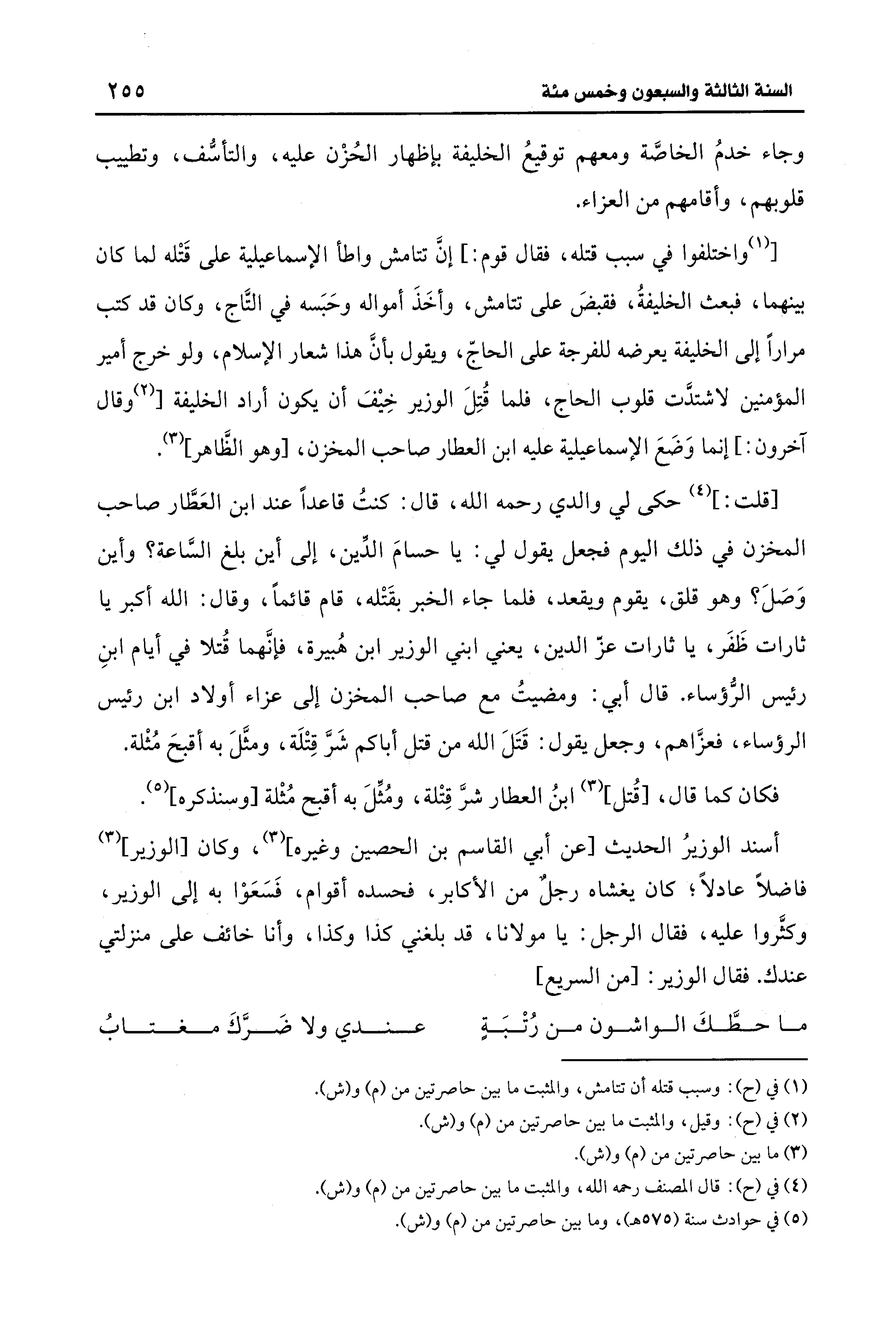 [(¬1) واختلفوا في سبب قتله، فقال قوم: ] إنَّ تتامش واطأ الإسماعيلية على قَتْله لما كان بينهما، فبعث الخليفةُ، فقبضَ على تتامش، وأخَذَ أمواله وحَبَسه في التَّاج، وكان قد كتب مرارًا إلى الخليفة يعرضه للفرجة على الحاجّ، ويقول بأنَّ هذا شعار الإسلام، ولو خرج أمير المؤمنين لاشتدَّت قلوب الحاج، فلما قُتِلَ الوزير خِيفَ أن يكون أراد الخليفة [(¬2) وقال آخرون: ] إنما وَضَعَ الإسماعيلية عليه ابن العطار صاحب المخزن، [وهو الظَّاهر] (¬3).