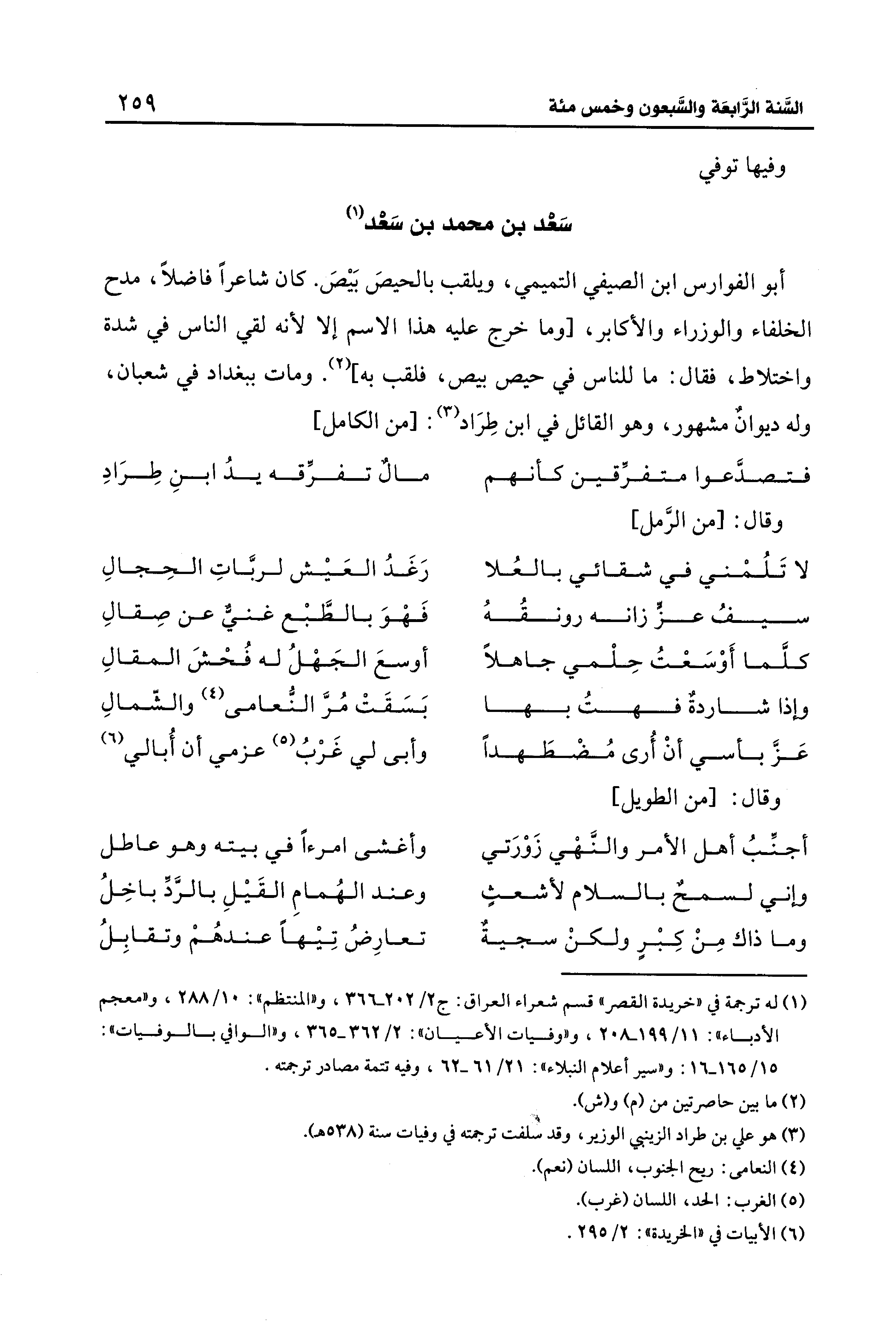 أبو الفوارس بن الصيفي التميمي، ويلقب بالحيصَ بَيصَ. كان شاعرًا فاضلًا، مدح الخلفاء والوزراء والأكابر، [وما خرج عليه هذا الاسم إلا لأنه لقي الناس في شدة واختلاط، فقال: ما للناس في حيص بيص، فلقب به] (¬2). ومات ببغداد في شعبان، وله ديوانٌ مشهور، وهو القائل في ابن طِرَاد (¬3): [من الكامل]