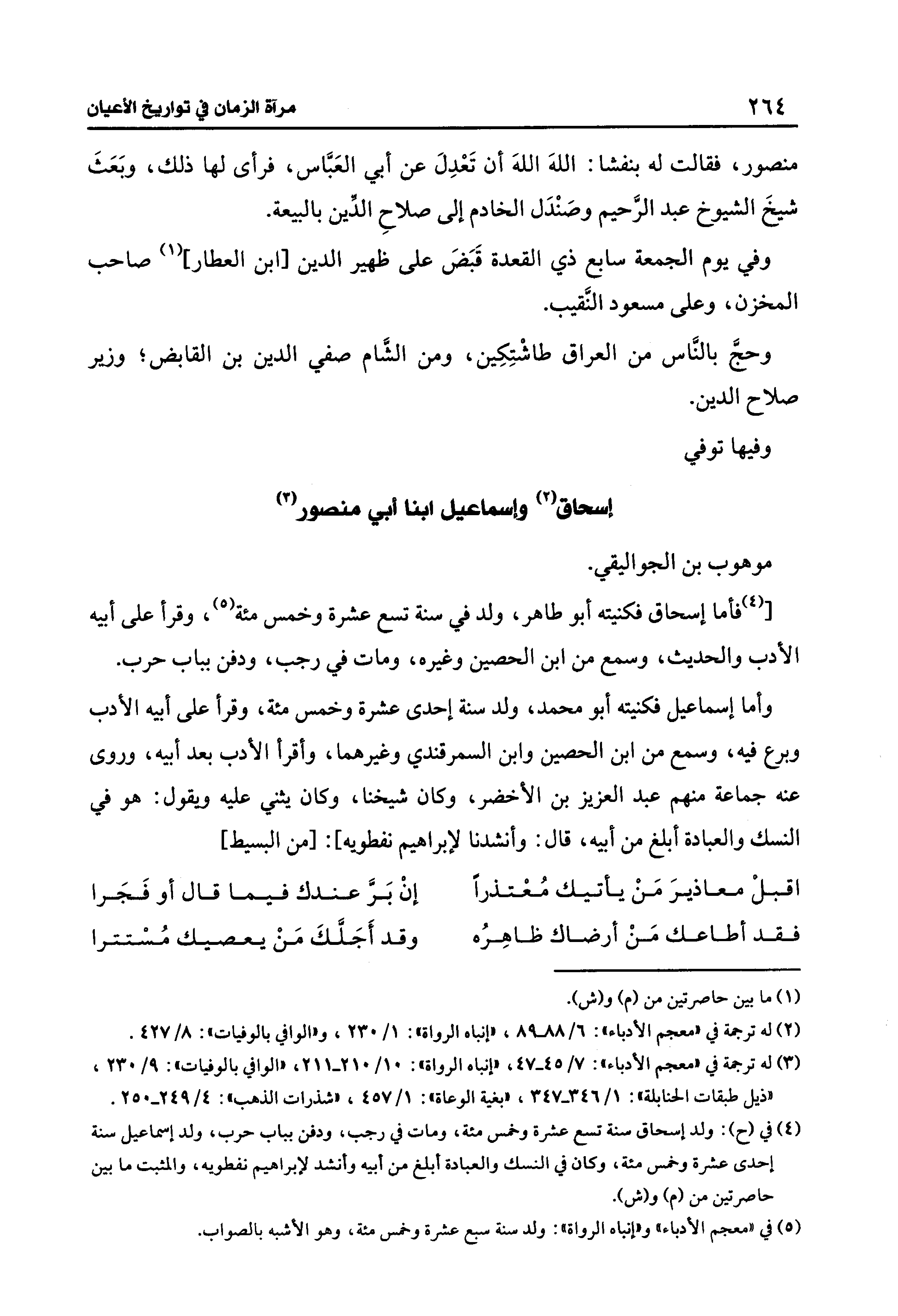 (¬4) في (ح): ولد إسحاق سنة تسع عشرة وخمس مئة، ومات في رجب، ودفن بباب حرب، ولد إسماعيل سنة إحدى عشرة وخمس مئة، وكان في النسك والعبادة أبلغ من أبيه وأنشد لإبراهيم نفطويه، والمثبت ما بين حاصرتين من (م) و (ش).