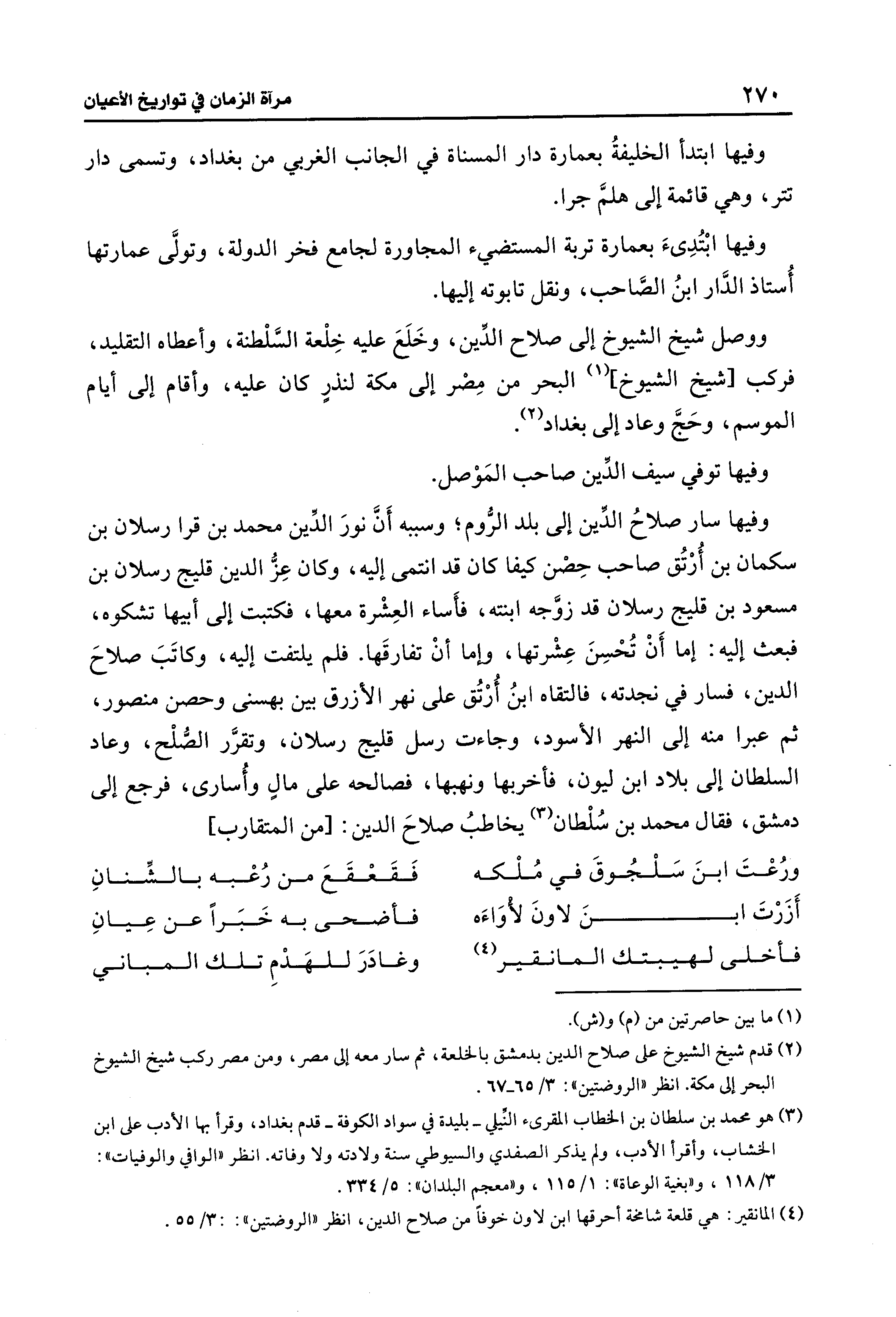 وفيها سار صلاحُ الدِّين إلى بلد الرُّوم؛ وسببه أَنَّ نورَ الدّين محمد بن قرا رسلان بن سكمان بن أُرْتُق صاحب حِصْن كيفا كان قد انتمى إليه، وكان عِزُّ الدين قليج رسلان بن مسعود بن قليج رسلان قد زوَّجه ابنته، فأَساء العِشْرة معها، فكتبت إلى أبيها تشكوه، فبعث إليه: إما أَنْ تُحْسِنَ عِشْرتها، وإما أنْ تفارقَها. فلم يلتفت إليه، وكاتَبَ صلاحَ الدين، فسار في نجدته، فالتقاه ابنُ أُرْتُق على نهر الأزرق بين بهسنى وحصن منصور، ثم عبرا منه إلى النهر الأسود، وجاءت رسل قليج رسلان، وتقرَّر الصُّلْح، وعاد السلطان إلى بلاد ابن ليون، فأخربها ونهبها، فصالحه على مالٍ وأُسارى، فرجع إلى دمشق، فقال محمد بن سُلْطان (¬3) يخاطبُ صلاحَ الدين: [من المتقارب]