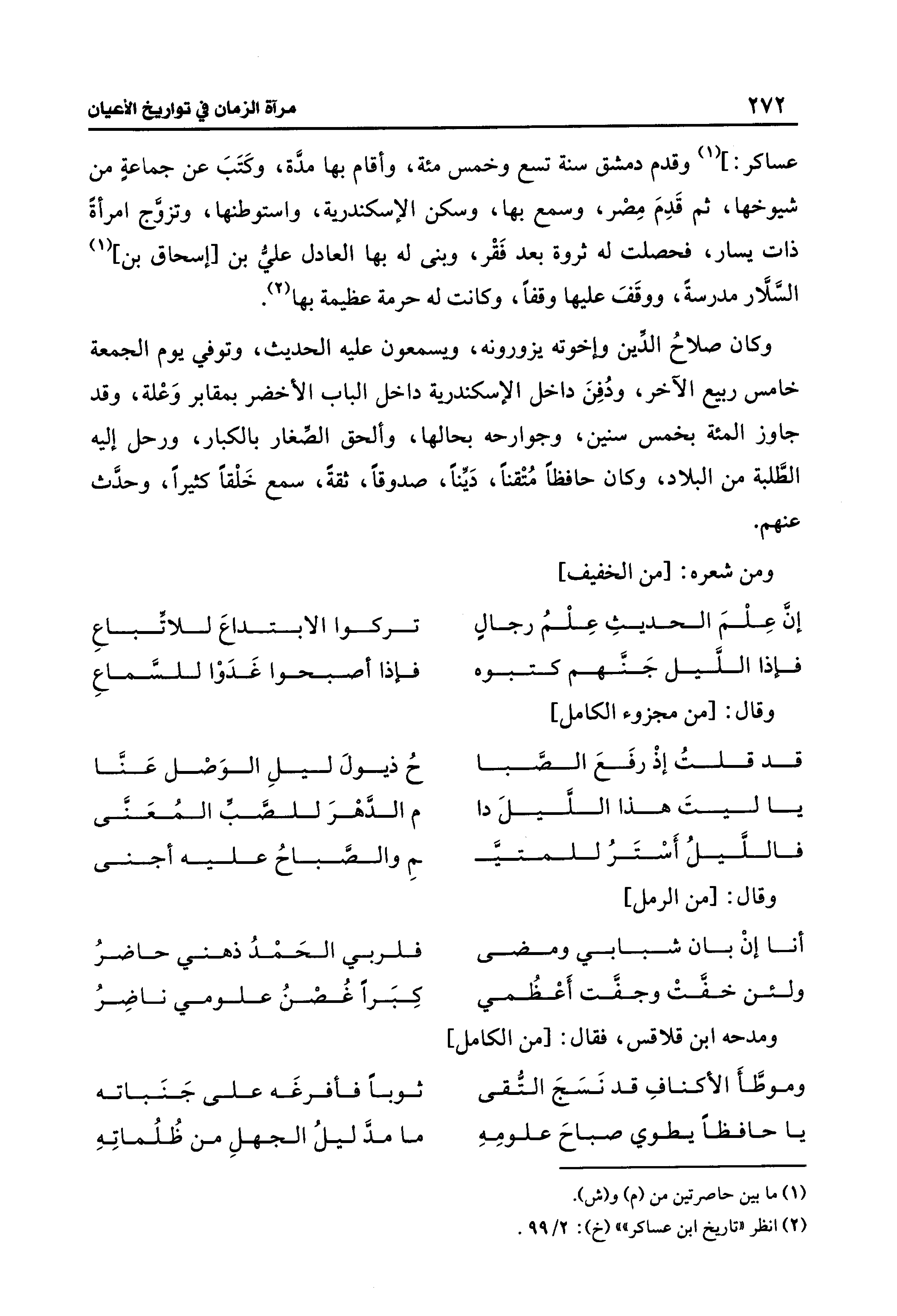 عساكر: ] (¬1) وقدم دمشق سنة تسع وخمس مئة، وأقام بها مدَّة، وكَتَبَ عن جماعةٍ من شيوخها، ثم قَدِمَ مِصْر، وسمع بها، وسكن الإسكندرية، واستوطنها، وتزوَّج امرأة ذات يسار، فحصلت له ثروة بعد فَقْر، وبنى له بها العادل عليُّ بن [إسحاق بن] (1) السَّلَّار مدرسةً، ووقَفَ عليها وقفًا، وكانت له حرمة عظيمة بها (¬2).