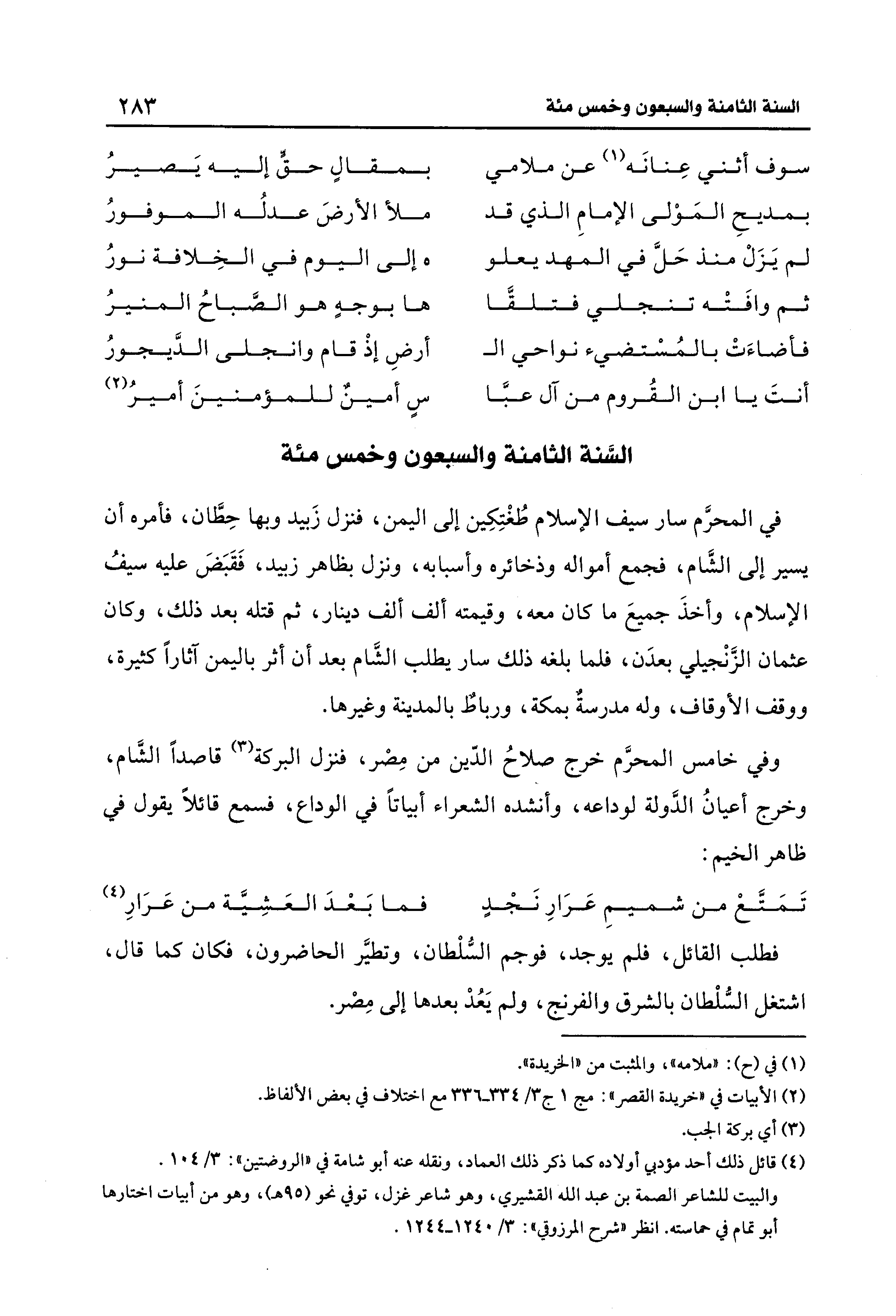 وفي خامس المحرَّم خرج صلاحُ الدّين من مِصْر، فنزل البركة (¬3) قاصدًا الشَّام، وخرج أعيانُ الدَّولة لوداعه، وأنشده الشعراء أبياتًا في الوداع، فسمع قائلًا يقول في ظاهر الخيم: