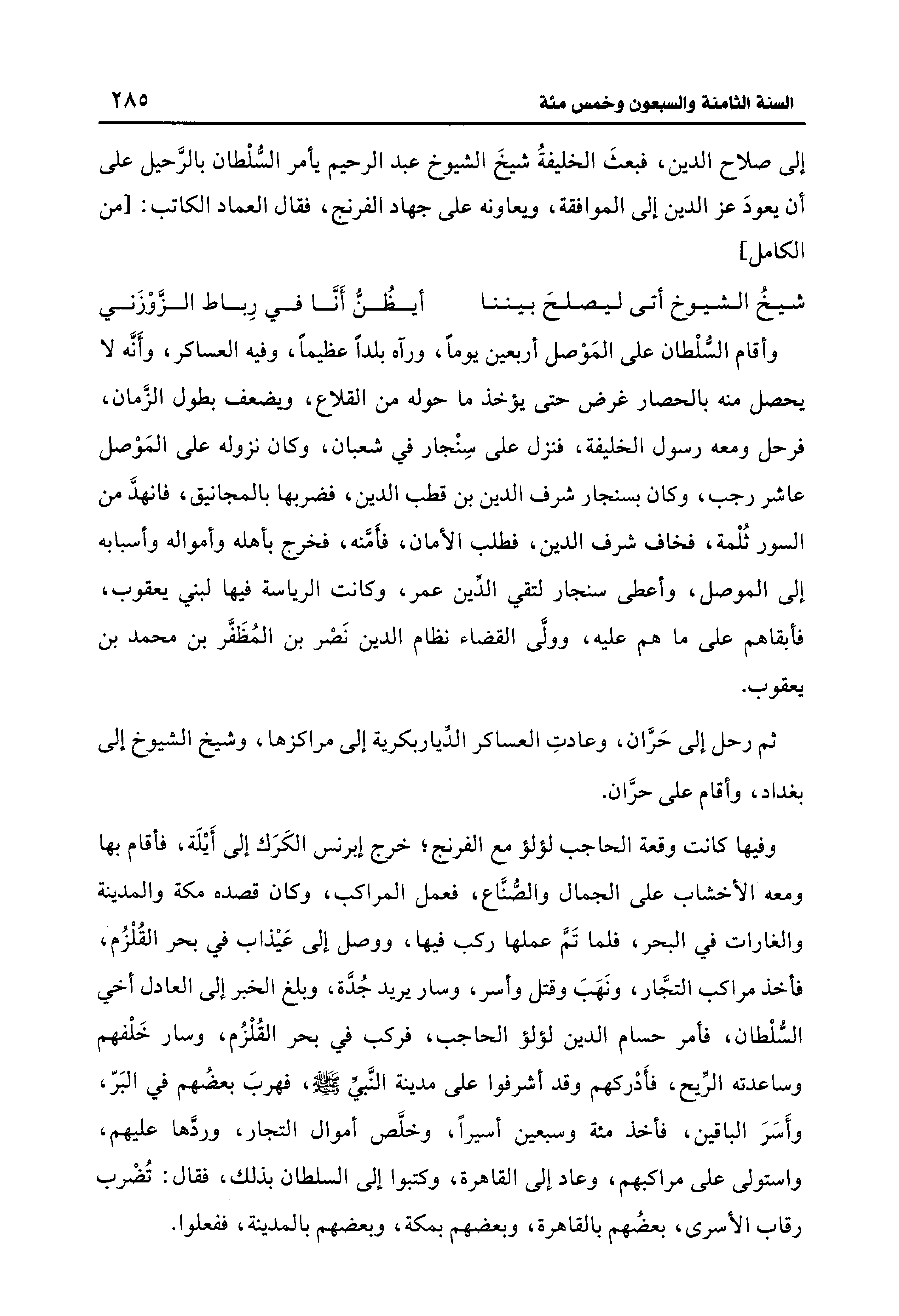 إلى صلاح الدين، فبعثَ الخليفةُ شيخَ الشيوخ عبد الرحيم يأمر السُّلْطان بالرَّحيل على أن يعودَ عز الدين إلى الموافقة، ويعاونه على جهاد الفرنج، فقال العماد الكاتب: [من الكامل]