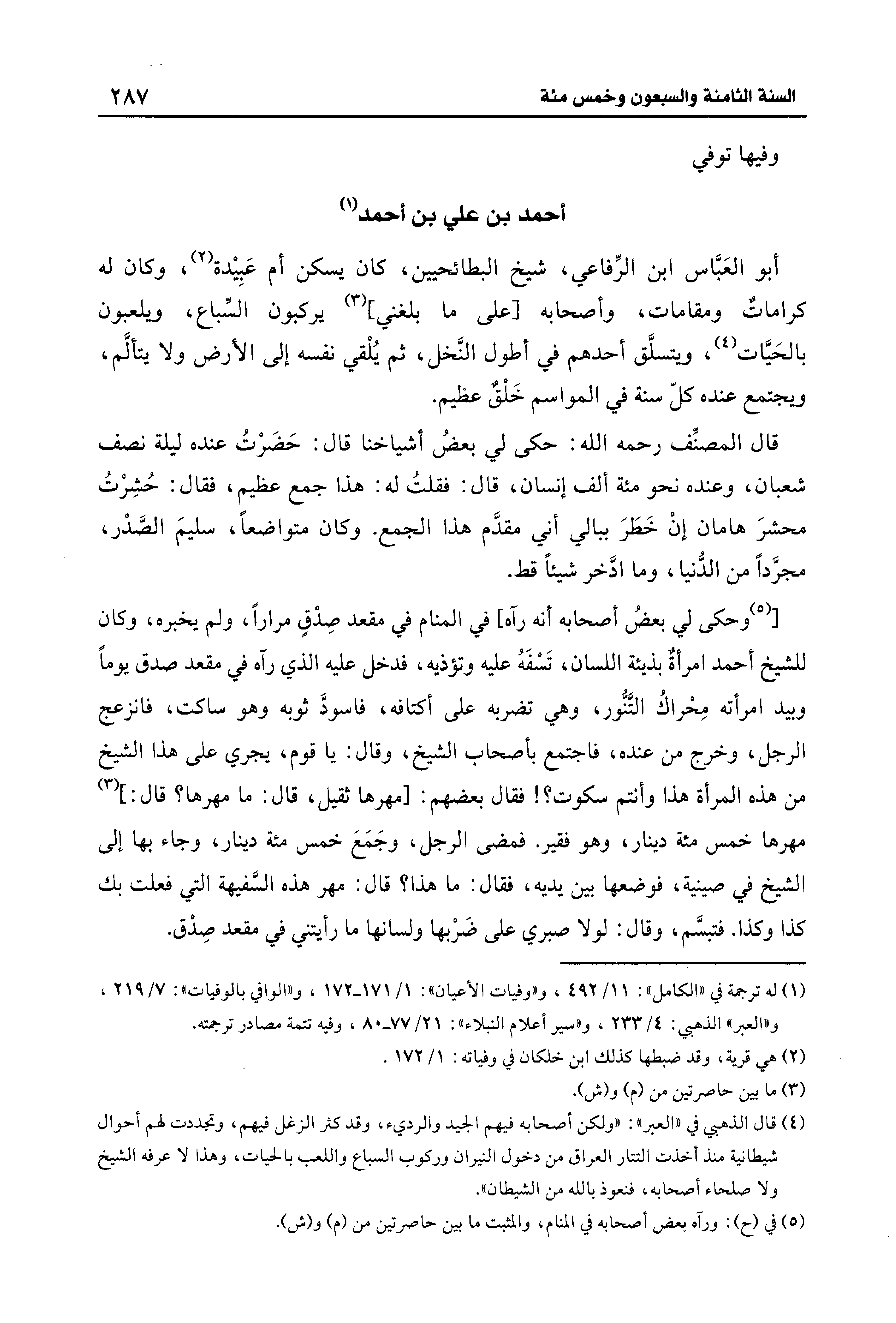 أبو العَبَّاس بن الرِّفاعي، شيخ البطائحيين، كان يسكن أم عَبِيدة (¬2)، وكان له كراماتٌ ومقامات، وأصحابه [على ما بلغني] (¬3) يركبون السِّباع، ويلعبون بالحَيَّات (¬4)، ويتسلَّق أحدهم في أطول النَّخل، ثم يُلْقي نفسه إلى الأرض ولا يتألَّم، ويجتمع عنده كلّ سنة في المواسم خَلْقٌ عظيم.