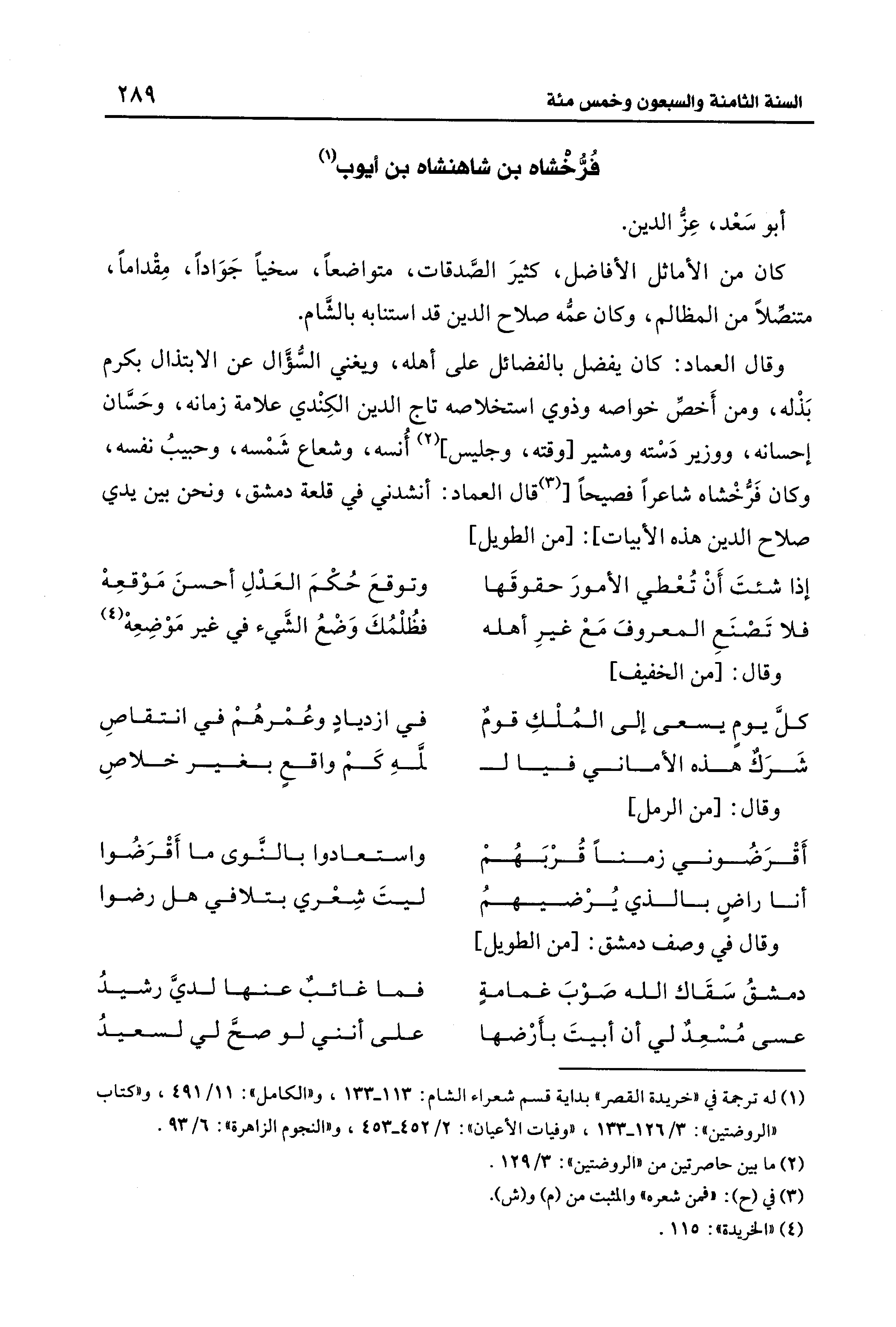 وقال العماد: كان يفضل بالفضائل على أهله، ويغني السُّؤَّال عن الابتذال بكرم بَذْله، ومن أَخصِّ خواصه وذوي استخلاصه تاج الدين الكِنْدي علامة زمانه، وحَسَّان إحسانه، ووزير دَسْته ومشير [وقته، وجليس] (¬2) أنسه، وشعاع شَمْسه، وحبيبُ نفسه، وكان فَرُّخْشاه شاعرًا فصيحًا [(¬3) قال العماد: أنشدني في قلعة دمشق، ونحن بين يدي صلاح الدين هذه الأبيات]: [من الطويل]