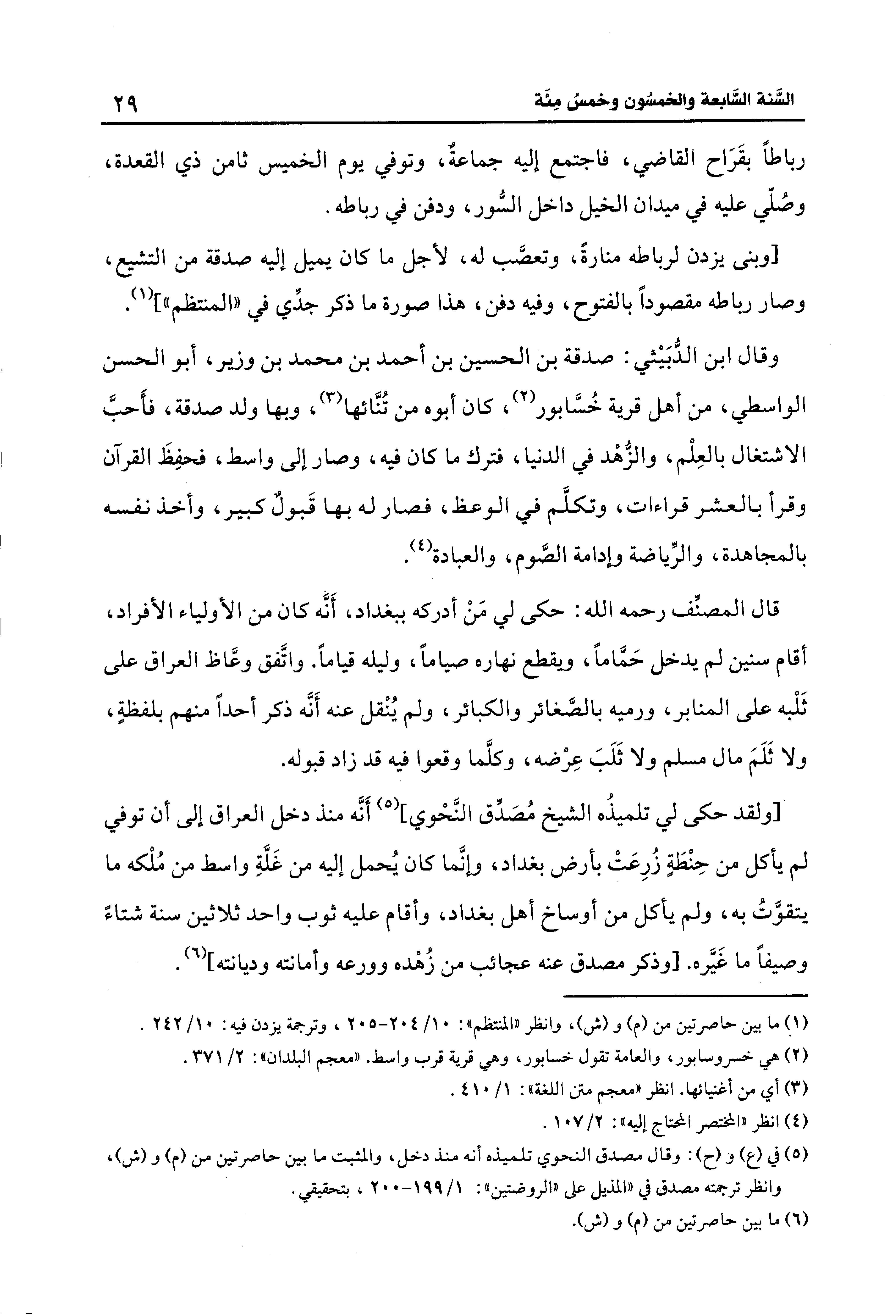 وقال ابن الدُّبَيثي: صدقة بن الحسين بن أحمد بن محمد بن وزير، أبو الحسن الواسطي، من أهل قرية خُسَّابور (¬2)، كان أبوه من تُنَّائها (¬3)، وبها ولد صدقة، فأَحبَّ الاشتغال بالعِلْم، والزُّهْد في الدنيا، فترك ما كان فيه، وصار إلى واسط، فحفِظَ القرآن وقرأ بالعشر قراءات، وتكلَّم في الوعظ، فصار له بها قَبولٌ كبير، وأخذ نفسه بالمجاهدة، والرِّياضة وإدامة الصَّوم، والعبادة (¬4).