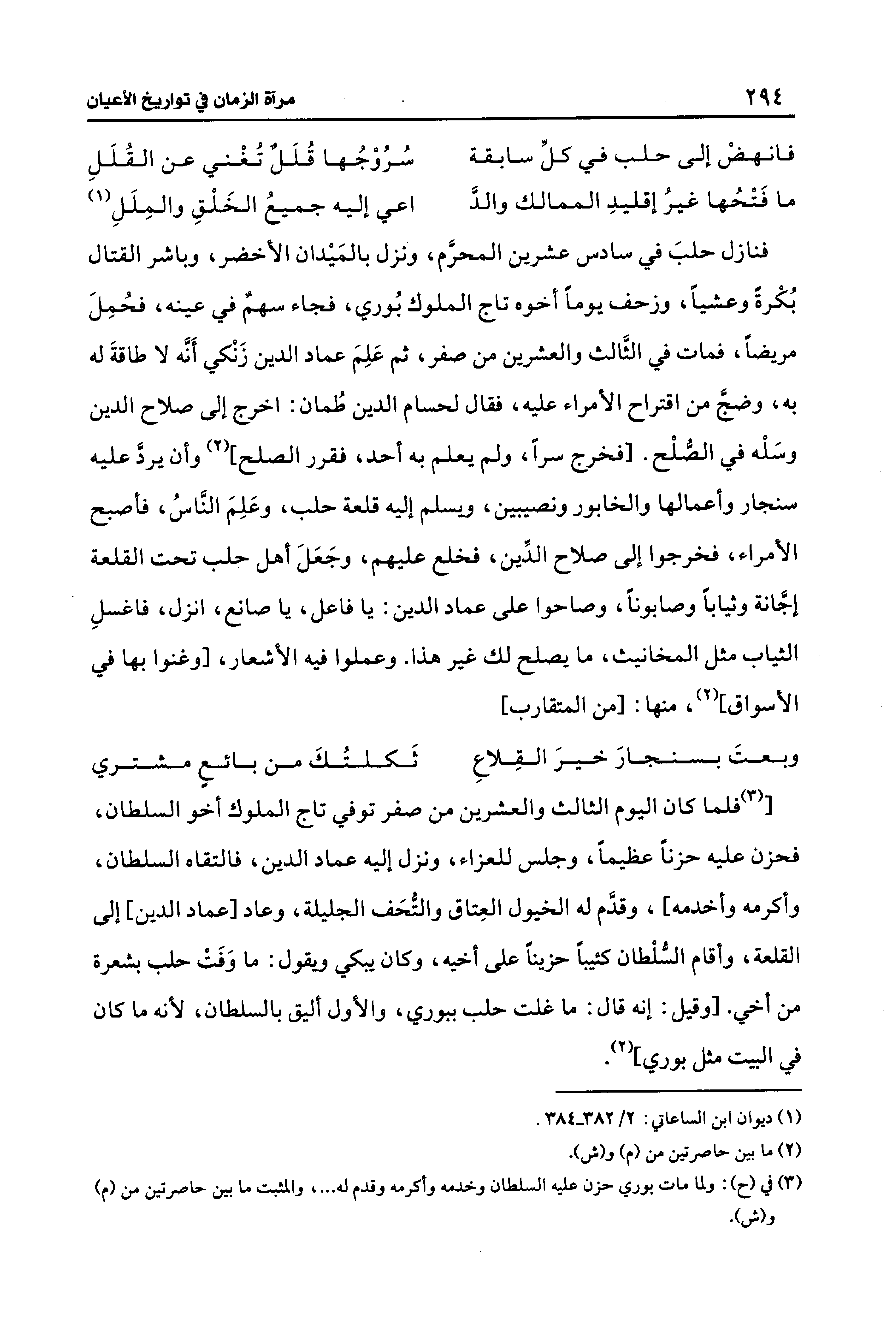 فنازل حلبَ في سادس عشرين المحرَّم، ونزل بالمَيدان الأخضر، وباشر القتال بُكْرةً وعشيًّا، وزحف يومًا أخوه تاج الملوك بُوري، فجاء سهمٌ في عينه، فحُمِلَ مريضًا، فمات في الثَّالث والعشرين من صفر، ثم عَلِمَ عماد الدين زَنْكي أَنَّه لا طاقةَ له به، وضجَّ من اقتراح الأمراء عليه، فقال لحسام الدين طُمان: اخرج إلى صلاح الدين وسَلْه في الصُّلْح. [فخرج سرًّا، ولم يعلم به أحد، فقرر الصلح] (¬2) وأن يردَّ عليه سنجار وأعمالها والخابور ونصيبين، ويسلم إليه قلعة حلب، وعَلِمَ النَّاسُ، فأصبح الأمراء، فخرجوا إلى صلاح الدِّين، فخلع عليهم، وجَعَلَ أهل حلب تحت القلعة إجَّانة وثيابًا وصابونًا، وصاحوا على عماد الدين: يا فاعل، يا صانع، انزل، فاغسلِ الثياب مثل المخانيث، ما يصلح لك غير هذا. وعملوا فيه الأشعار، [وغنوا بها في الأسواق] (2)، منها: [من المتقارب]
