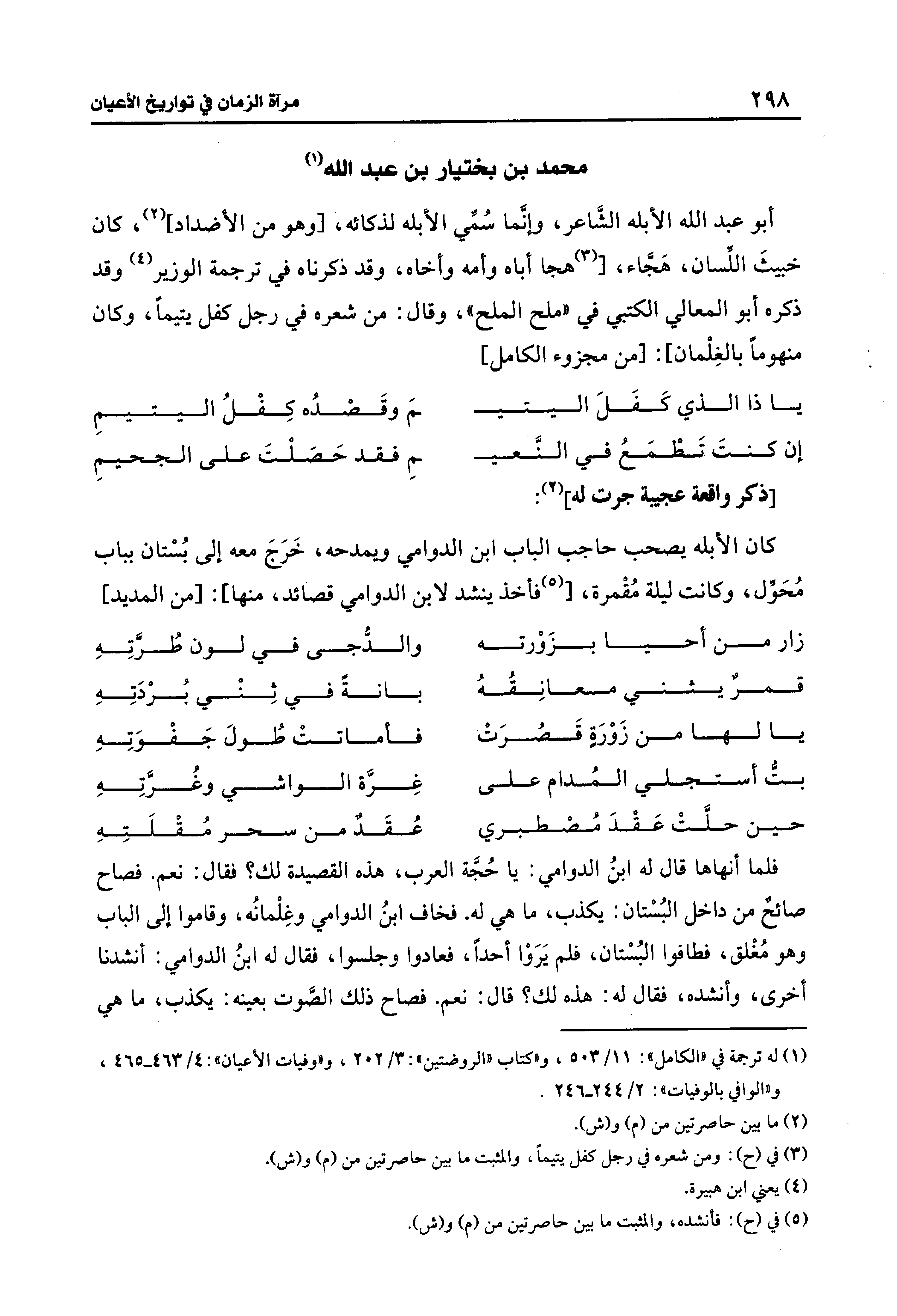 أبو عبد الله الأبله الشَّاعر، وإنَّما سُمِّي الأبله لذكائه، [وهو من الأضداد] (¬2)، كان خبيثَ اللِّسان، هَجَّاء، [(¬3) هجا أباه وأمه وأخاه، وقد ذكرناه في ترجمة الوزير (¬4) وقد ذكره أبو المعالي الكتبي في "ملح الملح"، وقال: من شعره في رجل كفل يتيمًا، وكان منهومًا بالغِلْمان]: [من مجزوء الكامل]
