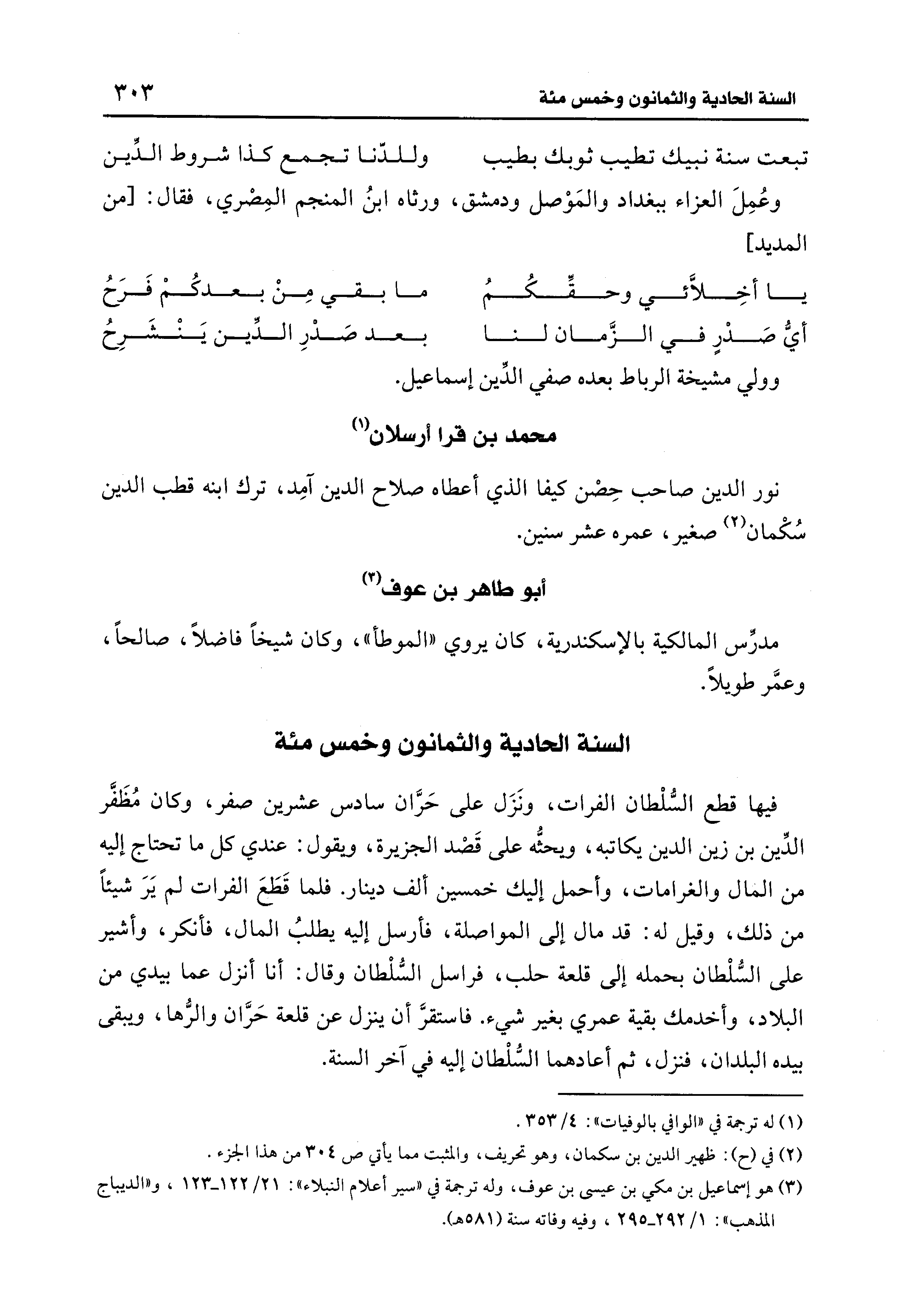 فيها قطع السُّلْطان الفرات، ونَزَل على حَرَّان سادس عشرين صفر، وكان مُظَفَّر الدِّين بن زين الدين يكاتبه، ويحثه على قَصْد الجزيرة، ويقول: عندي كل ما تحتاج إليه من المال والغرامات، وأحمل إليك خمسين ألف دينار. فلما قَطَعَ الفرات لم يَرَ شيئًا من ذلك، وقيل له: قد مال إلى المواصلة، فأرسل إليه يطلبُ المال، فأنكر، وأشير على السُّلْطان بحمله إلى قلعة حلب، فراسل السُّلْطان وقال: أنا أنزل عما بيدي من البلاد، وأخدمك بقية عمري بغير شيء. فاستقرَّ أن ينزل عن قلعة حَرَّان والرُّها، ويبقى بيده البلدان، فنزل، ثم أعادهما السُّلْطان إليه في آخر السنة.