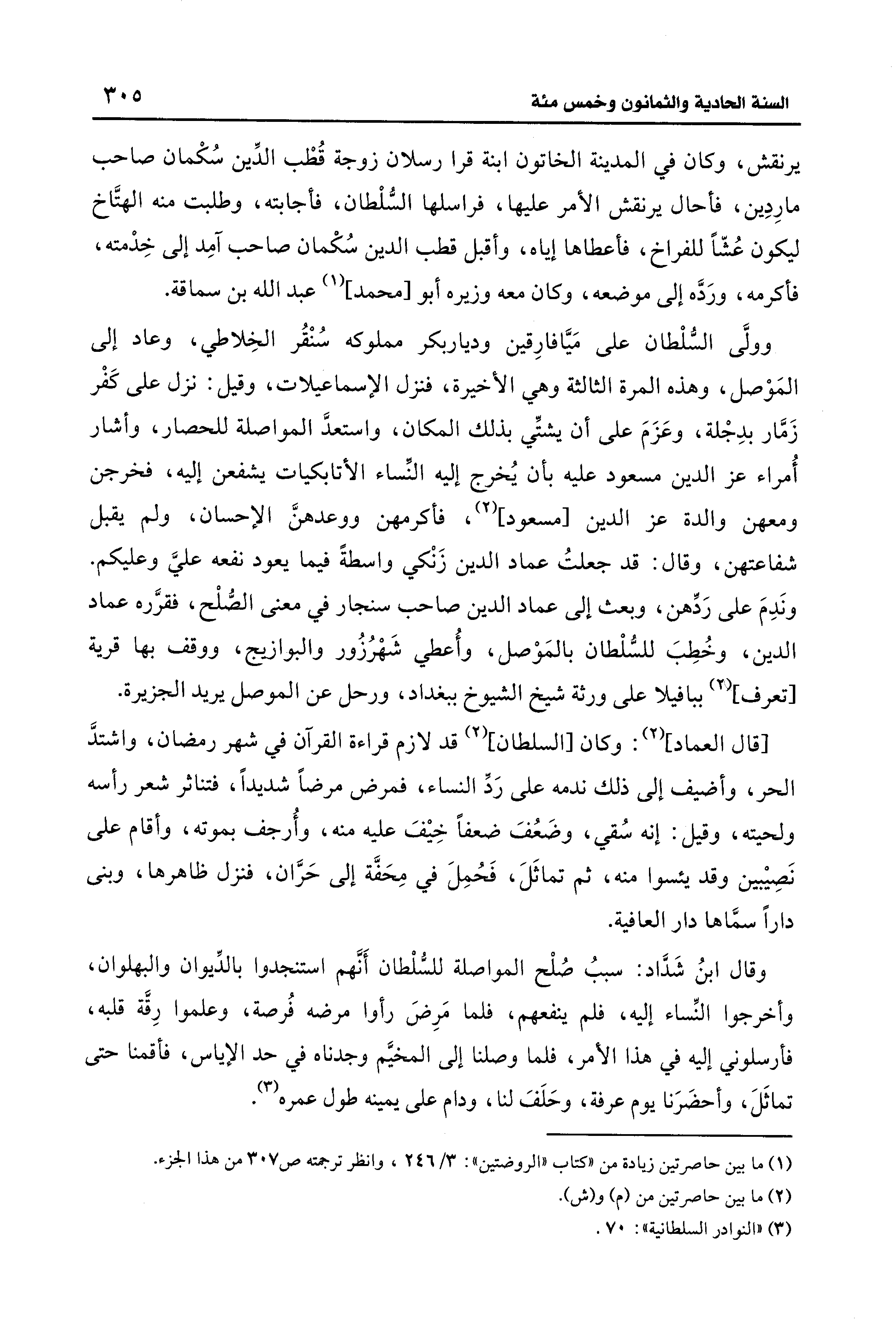 وولَّى السُّلْطان على مَيَّافارِقين ودياربكر مملوكه سُنْقُر الخِلاطي، وعاد إلى المَوْصل، وهذه المرة الثالثة وهي الأخيرة، فنزل الإسماعيلات، وقيل: نزل على كَفْر زَمَّار بدِجْلة، وعَزَمَ على أن يشتِّي بذلك المكان، واستعدَّ المواصلة للحصار، وأشار أُمراء عز الدين مسعود عليه بأن يُخرج إليه النِّساء الأتابكيات يشفعن إليه، فخرجن ومعهن والدة عز الدين [مسعود] (2)، فأكرمهن ووعدهنَّ الإحسان، ولم يقبل شفاعتهن، وقال: قد جعلتُ عماد الدين زَنْكي واسطةً فيما يعود نفعه عليَّ وعليكم. ونَدِمَ على رَدِّهن، وبعث إلى عماد الدين صاحب سنجار في معنى الصُّلْح، فقرَّره عماد الدين، وخُطِبَ للسُّلْطان بالمَوْصل، وأُعطي شَهْرُزُور والبوازيج، ووقف بها قرية [تعرف] (2) ببافيلا على ورثة شيخ الشيوخ ببغداد، ورحل عن الموصل يريد الجزيرة. [قال العماد] (2): وكان [السلطان] (¬2) قد لازم قراءة القرآن في شهر رمضان، واشتدَّ الحر، وأضيف إلى ذلك ندمه على رَدِّ النساء، فمرض مرضًا شديدًا، فتناثر شعر رأسه ولحيته، وقيل: إنه سُقي، وضَعُفَ ضعفًا خِيفَ عليه منه، وأُرجف بموته، وأقام على نَصِيبين وقد يئسوا منه، ثم تماثَلَ، فَحُمِلَ في مِحَفَّة إلى حَرَّان، فنزل ظاهرها، وبنى دارًا سمَّاها دار العافية.
