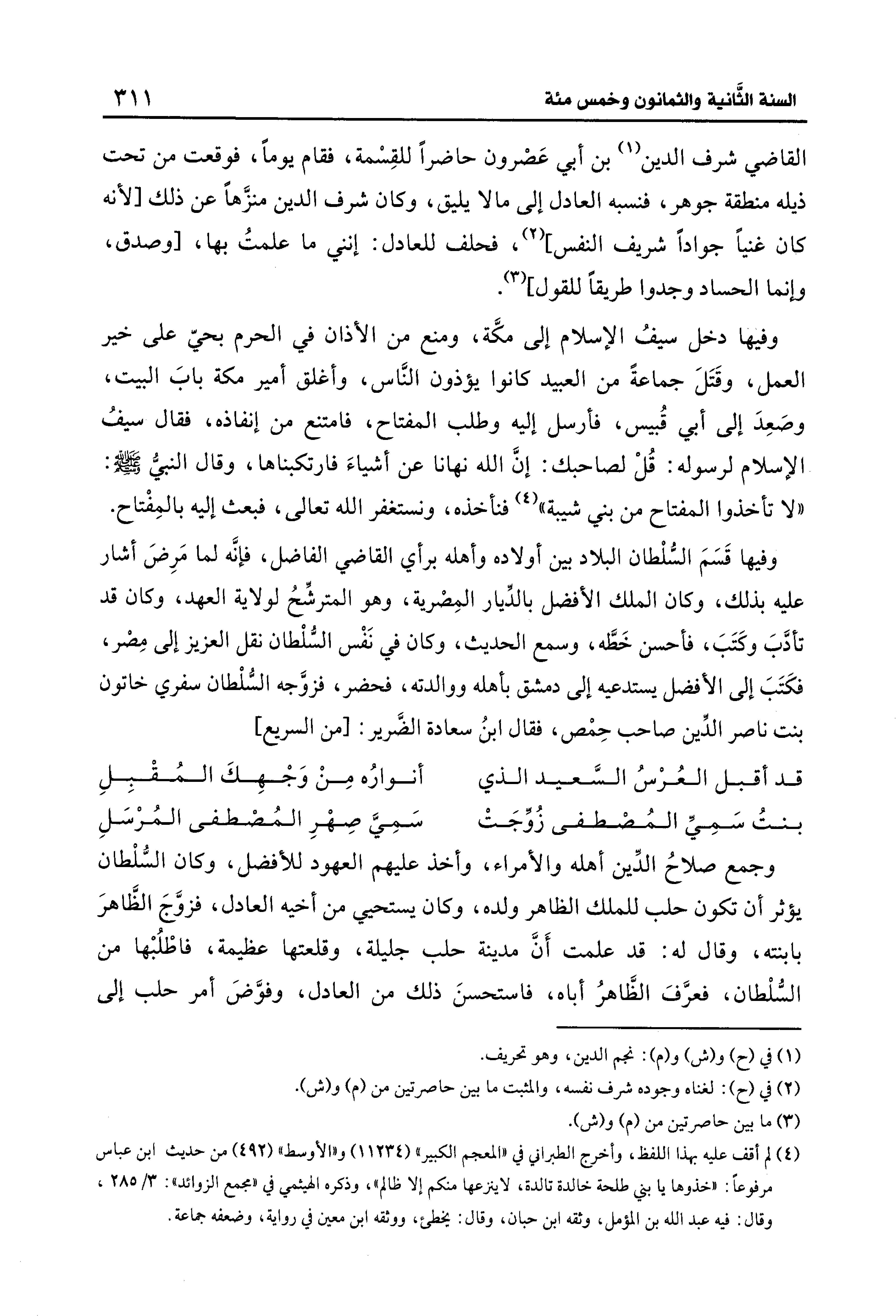 القاضي شرف الدين (¬1) بن أبي عَصْرون حاضرًا للقِسْمة، فقام يومًا، فوقعت من تحت ذيله منطقة جوهر، فنسبه العادل إلى ما لا يليق، وكان شرف الدين منزَّهًا عن ذلك [لأنه كان غنيًّا جوادًا شريف النفس] (¬2)، فحلف للعادل: إنني ما علمتُ بها، [وصدق، وإنما الحساد وجدوا طريقًا للقول] (¬3).