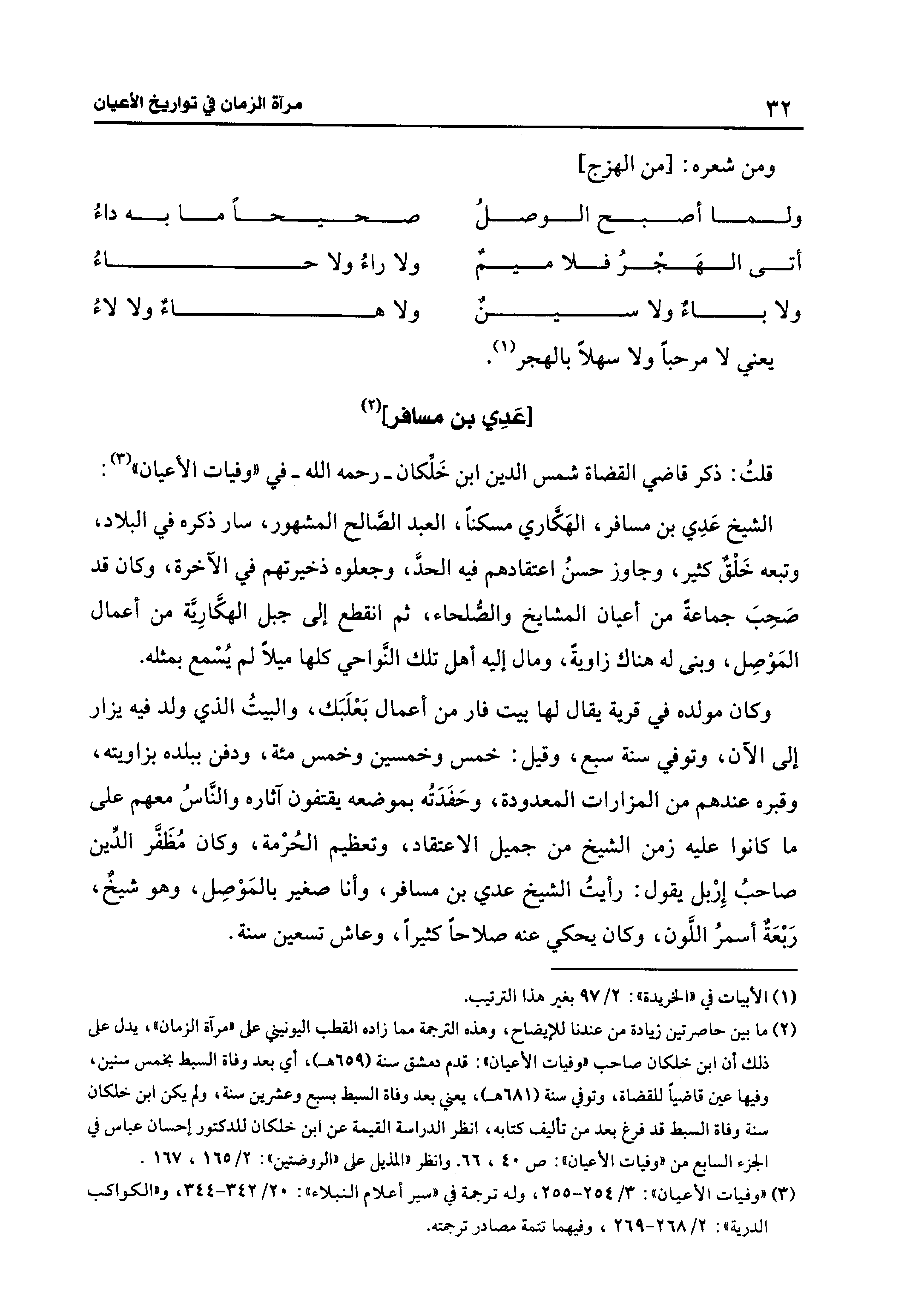 الشيخ عَدِي بن مسافر، الهَكَّاري مسكنًا، العبد الصَّالح المشهور، سار ذكره في البلاد، وتبعه خَلْقٌ كثير، وجاوز حسنُ اعتقادهم فيه الحدَّ، وجعلوه ذخيرتهم في الآخرة، وكان قد صَحِبَ جماعةً من أعيان المشايخ والصُّلحاء، ثم انقطع إلى جبل الهكَّارِيَّة من أعمال المَوْصِل، وبنى له هناك زاويةً، ومال إليه أهل تلك النَّواحي كلها ميلًا لم يُسْمع بمثله.