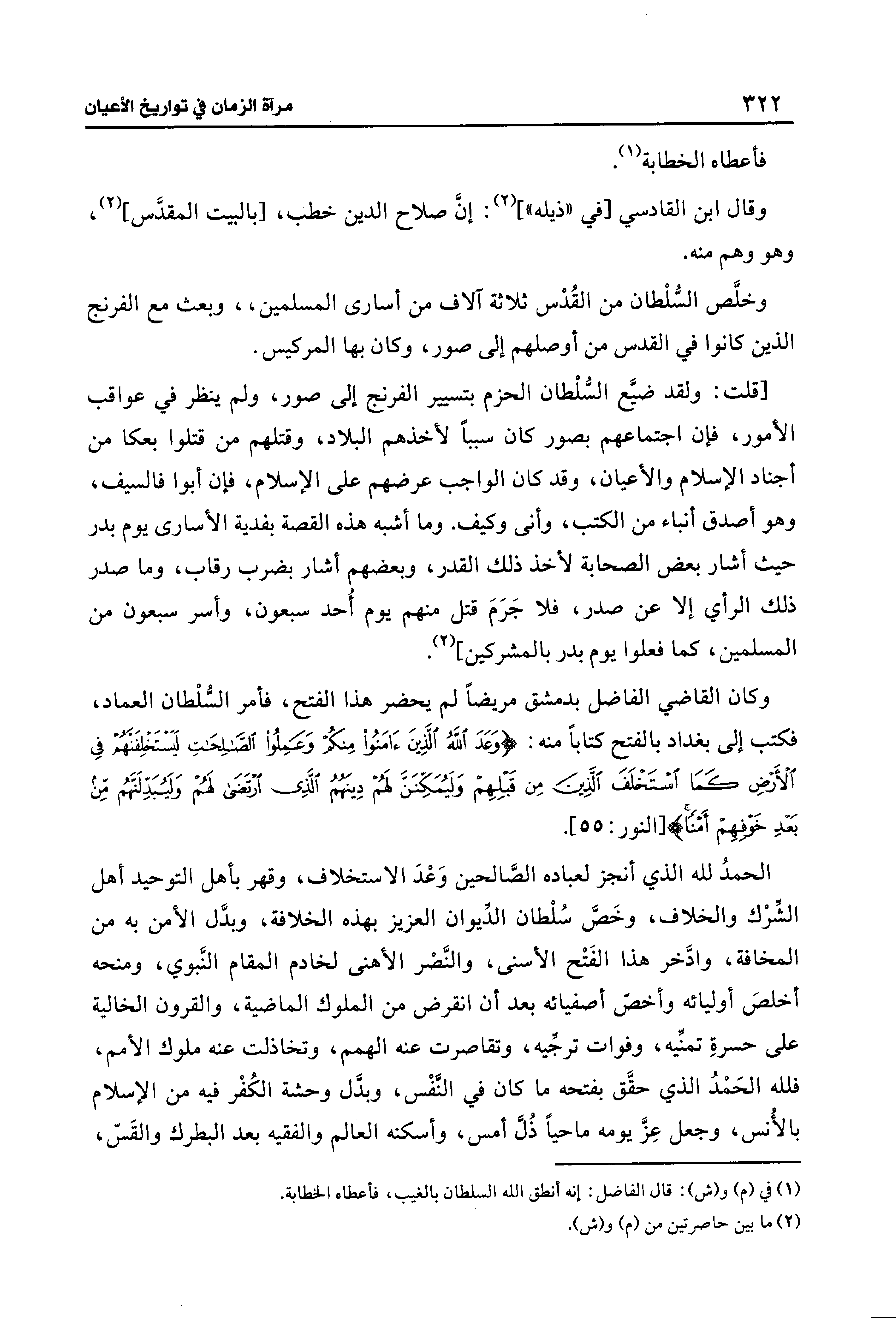 وكان القاضي الفاضل بدمشق مريضًا لم يحضر هذا الفتح، فأمر السُّلْطان العماد، فكتب إلى بغداد بالفتح كتابًا منه: {وَعَدَ اللَّهُ الَّذِينَ آمَنُوا مِنْكُمْ وَعَمِلُوا الصَّالِحَاتِ لَيَسْتَخْلِفَنَّهُمْ فِي الْأَرْضِ كَمَا اسْتَخْلَفَ الَّذِينَ مِنْ قَبْلِهِمْ وَلَيُمَكِّنَنَّ لَهُمْ دِينَهُمُ الَّذِي ارْتَضَى لَهُمْ وَلَيُبَدِّلَنَّهُمْ مِنْ بَعْدِ خَوْفِهِمْ أَمْنًا} [النور: 55].