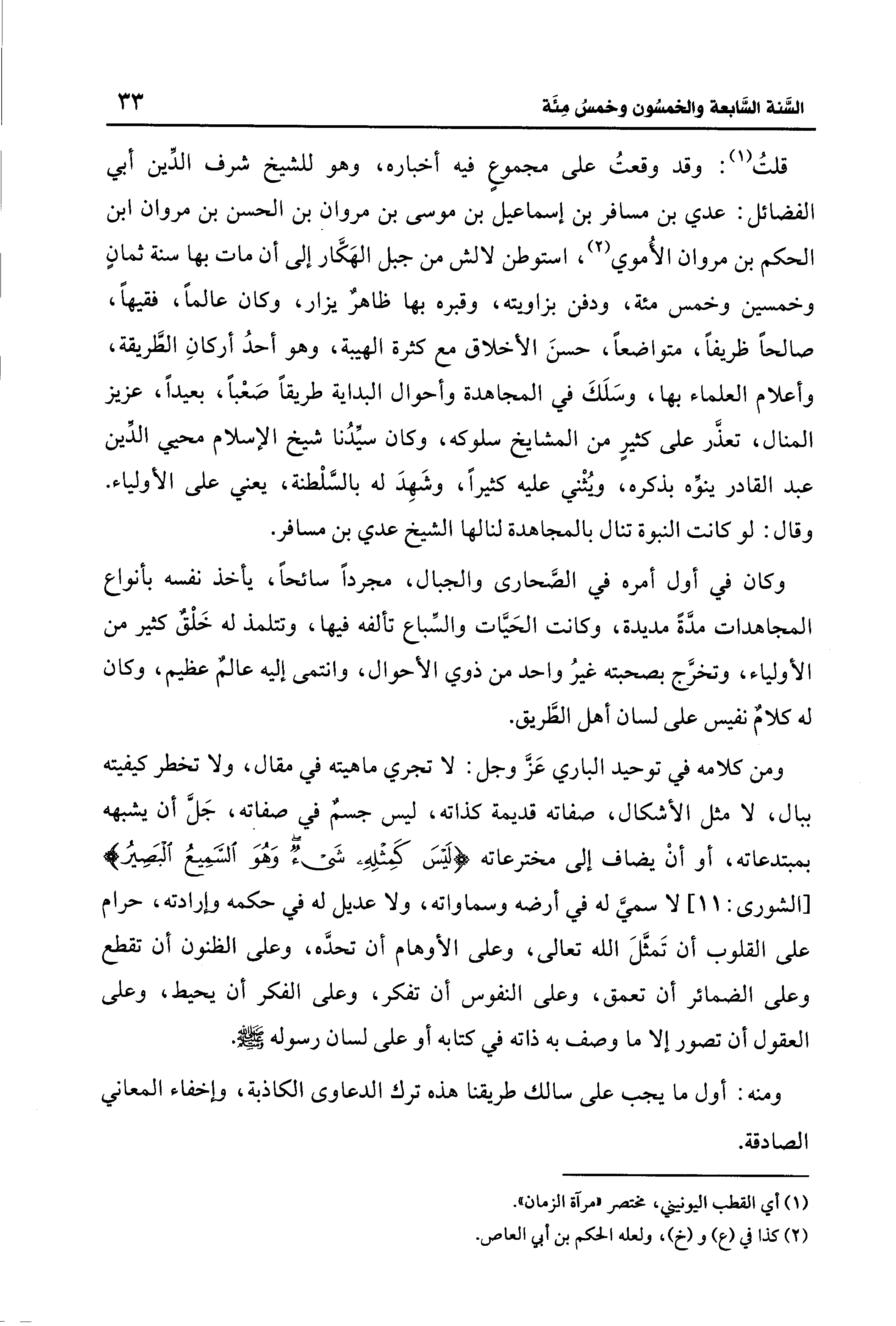 قلتُ (¬1): وقد وقعتُ على مجموعٍ فيه أخباره، وهو للشيخ شرف الدِّين أبي الفضائل: عدي بن مسافر بن إسماعيل بن موسى بن مروان بن الحسن بن مروان بن الحكم بن مروان الأُموي (¬2)، استوطن لالش من جبل الهَكَّار إلى أن مات بها سنة ثمانٍ وخمسين وخمس مئة، ودفن بزاويته، وقبره بها ظاهرٌ يزار، وكان عالمًا، فقيهًا، صالحًا ظريفًا، متواضعًا، حسنَ الأخلاق مع كثرة الهيبة، وهو أحدُ أركانِ الطَّريقة، وأعلام العلماء بها، وسَلَكَ في المجاهدة وأحوال البداية طريقًا صَعْبًا، بعيدًا، عزيز المنال، تعذَّر على كثيرٍ من المشايخ سلوكه، وكان سيِّدُنا شيخ الإسلام محيي الدِّين عبد القادر ينوِّه بذكره، ويُثْني عليه كثيرًا، وشَهِدَ له بالسَّلْطنة، يعني على الأولياء. وقال: لو كانت النبوة تنال بالمجاهدة لنالها الشيخ عدي بن مسافر.