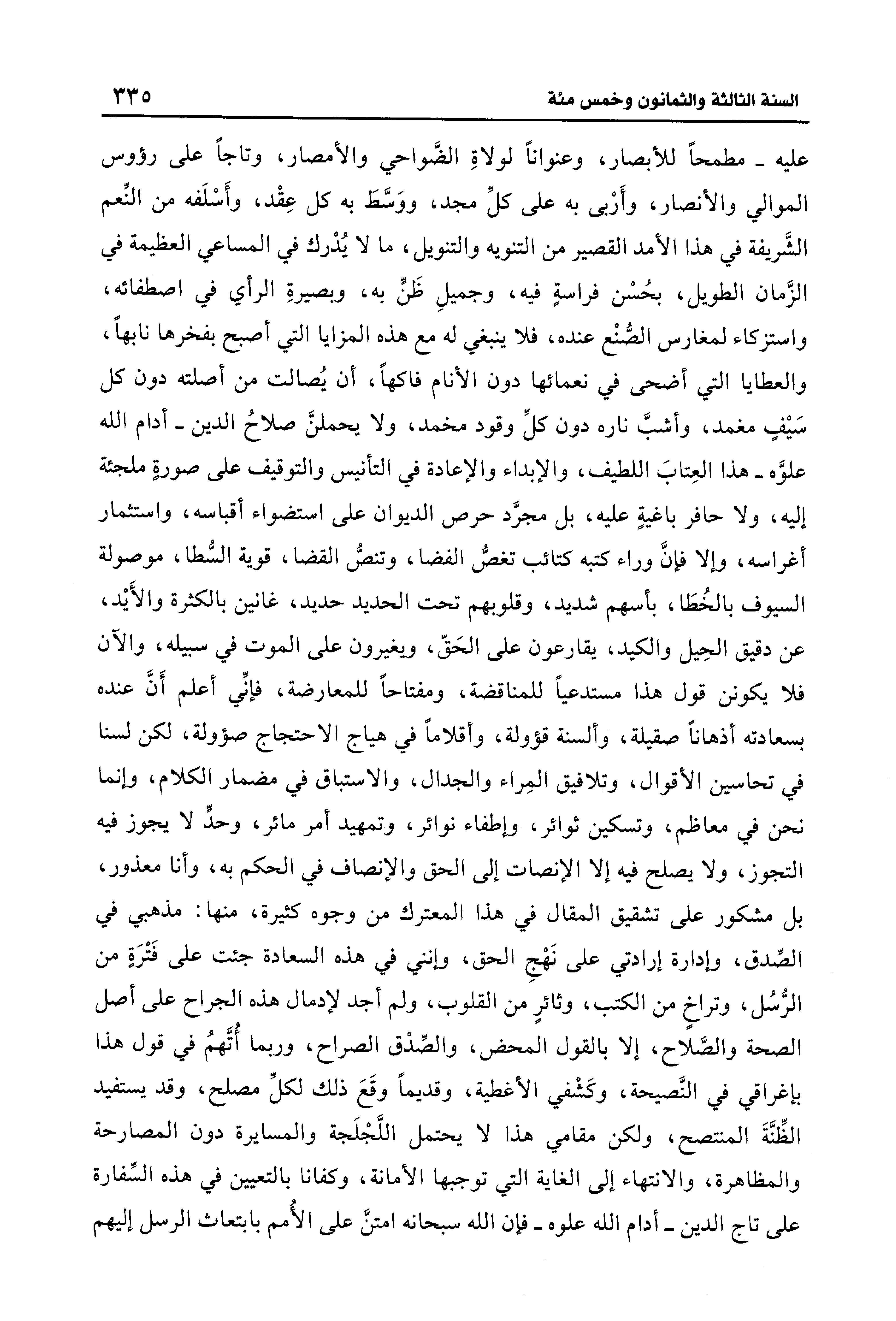 عليه- مطمحًا للأبصار، وعنوانًا لولاةِ الضَّواحي والأمصار، وتاجًا على رؤوس الموالي والأنصار، وأَرْبى به على كلِّ مجد، ووَسَّطَ به كل عِقْد، وأَسْلَفه من النِّعم الشَّريفة في هذا الأمد القصير من التنويه والتنويل، ما لا يُدْرك في المساعي العظيمة في الزَّمان الطويل، بحُسْن فراسةٍ فيه، وجميلِ ظَنٍّ به، وبصيرةِ الرأي في اصطفائه، واستزكاء لمغارس الصُّنْع عنده، فلا ينبغي له مع هذه المزايا التي أصبح بفخرها نابهًا، والعطايا التي أضحى في نعمائها دون الأنام فاكهًا، أن يُصالت من أصلته دون كل سَيفٍ مغمد، وأشبَّ ناره دون كلِّ وقود مخمد، ولا يحملنَّ صلاحُ الدين -أدام الله علوَّه- هذا العِتابَ اللطيف، والإبداء والإعادة في التأنيس والتوقيف على صورةٍ ملجئة إليه، ولا حافر باغيةٍ عليه، بل مجرَّد حرص الديوان على استضواء أقباسه، واستثمار أغراسه، وإلا فإنَّ وراء كتبه كتائب تغصُّ الفضا، وتنصُّ القضا، قوية السُّطا، موصولة السيوف بالخُطَا، بأسهم شديد، وقلوبهم تحت الحديد حديد، غانين بالكثرة والأَيد، عن دقيق الحِيل والكيد، يقارعون على الحَقّ، ويغيرون على الموت في سبيله، والآن فلا يكونن قول هذا مستدعيًا للمناقضة، ومفتاحًا للمعارضة، فإنِّي أعلم أَنَّ عنده بسعادته أذهانًا صقيلة، وألسنة قؤولة، وأقلامًا في هياج الاحتجاج صؤولة، لكن لسنا في تحاسين الأقوال، وتلافيق المِراء والجدال، والاستباق في مضمار الكلام، وإنما نحن في معاظم، وتسكين ثوائر، وإطفاء نوائر، وتمهيد أمر مائر، وحدٍّ لا يجوز فيه التجوز، ولا يصلح فيه إلا الإنصات إلى الحق والإنصاف في الحكم به، وأنا معذور، بل مشكور على تشقيق المقال في هذا المعترك من وجوه كثيرة، منها: مذهبي في الصِّدق، وإدارة إرادتي على نَهْجِ الحق، وإنني في هذه السعادة جئت على فَتْرَةٍ من الرُّسُل، وتراخٍ من الكتب، وثائرٍ من القلوب، ولم أجد لإدمال هذه الجراح على أصل الصحة والصَّلاح، إلا بالقول المحض، والصِّدْق الصراح، وربما أُتَّهمُ في قول هذا بإغراقي في النَّصيحة، وكَشْفي الأغطية، وقديمًا وقَعَ ذلك لكلِّ مصلح، وقد يستفيد الظِّنَّةَ المنتصح، ولكن مقامي هذا لا يحتمل اللَّجْلَجة والمسايرة دون المصارحة والمظاهرة، والانتهاء إلى الغاية التي توجبها الأمانة، وكفانا بالتعيين في هذه السِّفارة على تاج الدين -أدام الله علوه- فإن الله سبحانه امتنَّ على الأُمم بابتعاث الرسل إليهم