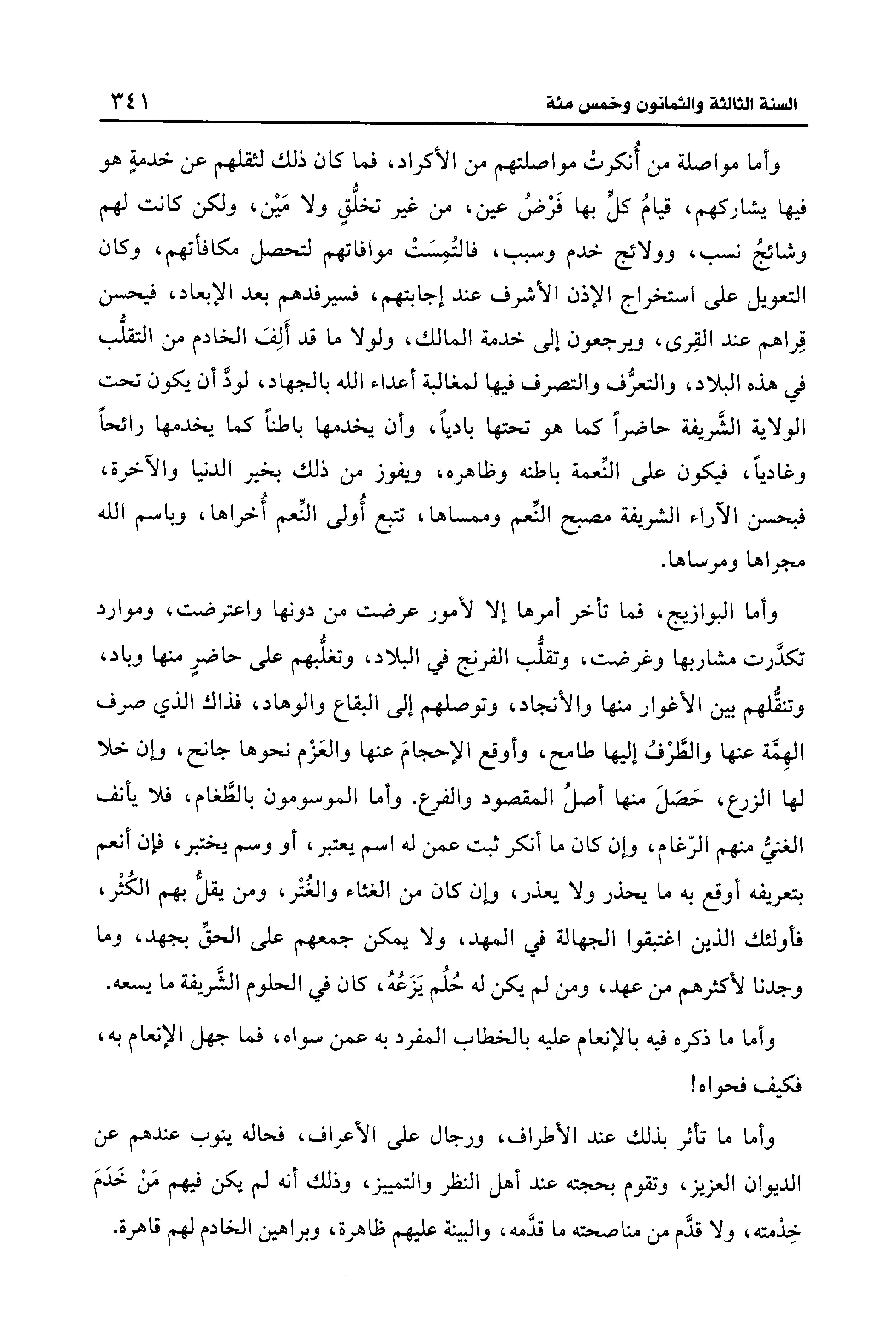 وأما مواصلة من أُنكرتْ مواصلتهم من الأكراد، فما كان ذلك لثقلهم عن خدمةٍ هو فيها يشاركهم، قيامُ كل بها فَرْضُ عين، من غير تخلُّقٍ ولا مَين، ولكن كانت لهم وشائجُ نسب، وولائج خدم وسبب، فالتُمِسَتْ موافاتهم لتحصل مكافأتهم، وكان التعويل على استخراج الإذن الأشرف عند إجابتهم، فسيرفدهم بعد الإبعاد، فيحسن قِراهم عند القِرى، ويرجعون إلى خدمة المالك، ولولا ما قد أَلِفَ الخادم من التقلُّب في هذه البلاد، والتعرُّف والتصرف فيها لمغالبة أعداء الله بالجهاد، لودَّ أن يكون تحت الولاية الشَريفة حاضرًا كما هو تحتها باديًا، وأن يخدمها باطنًا كما يخدمها رائحًا وغاديًا، فيكون على النّعمة باطنه وظاهره، ويفوز من ذلك بخير الدنيا والآخرة، فبحسن الآراء الشريفة مصبح النّعم وممساها، تتبع أُولى النّعم أُخراها، وباسم الله مجراها ومرساها.