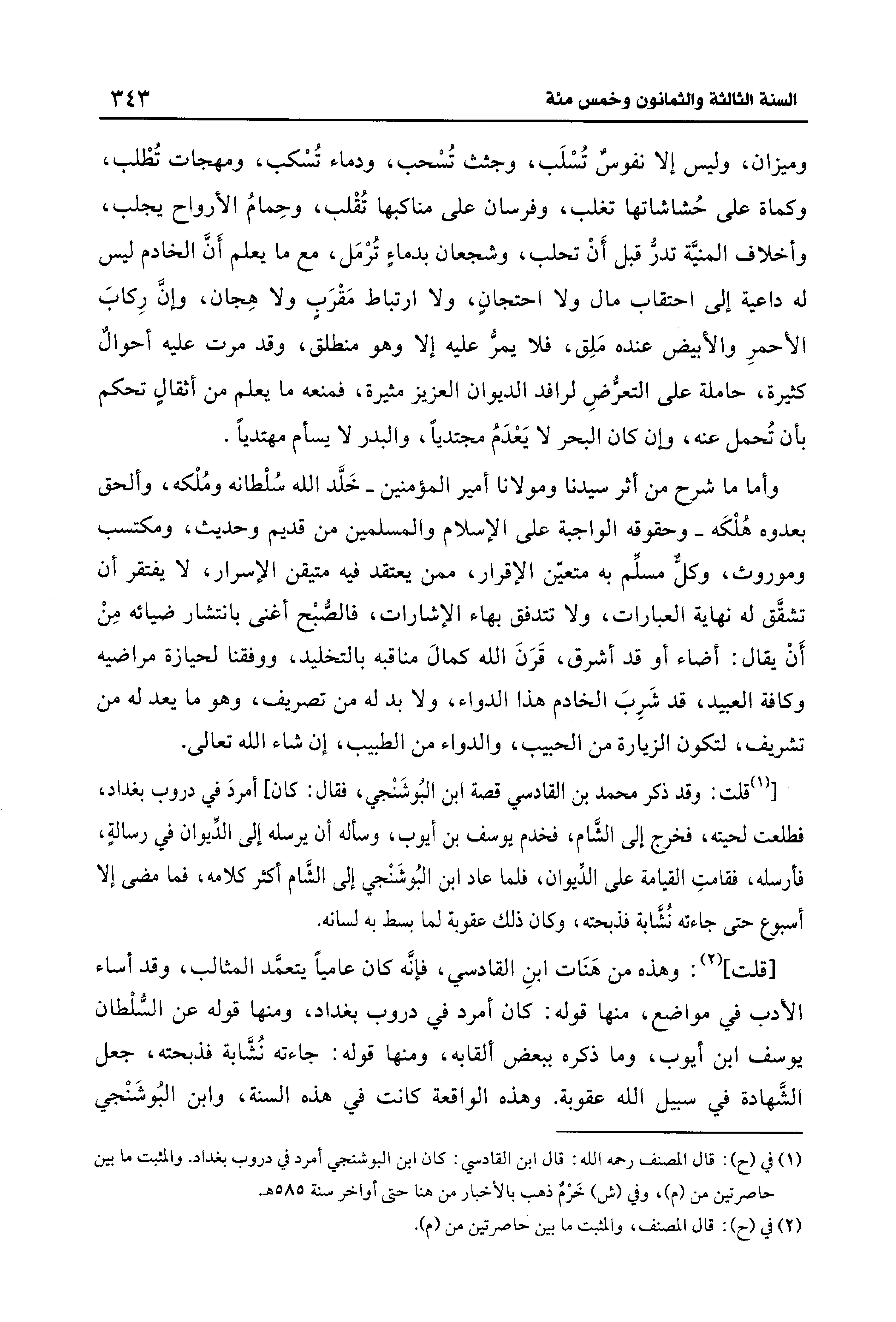 [قلت] (¬2): وهذه من هَنات ابنِ القادسي، فإنَّه كان عاميًا يتعمَّد المثالب، وقد أساء الأدب في مواضع، منها قوله: كان أمرد في دروب بغداد، ومنها قوله عن السُّلْطان يوسف بن أيوب، وما ذكره ببعض ألقابه، ومنها قوله: جاءته نُشّابة فذبحته، جعل الشَّهادة في سبيل الله عقوبة. وهذه الواقعة كانت في هذه السنة، وابن البُوشَنْجي