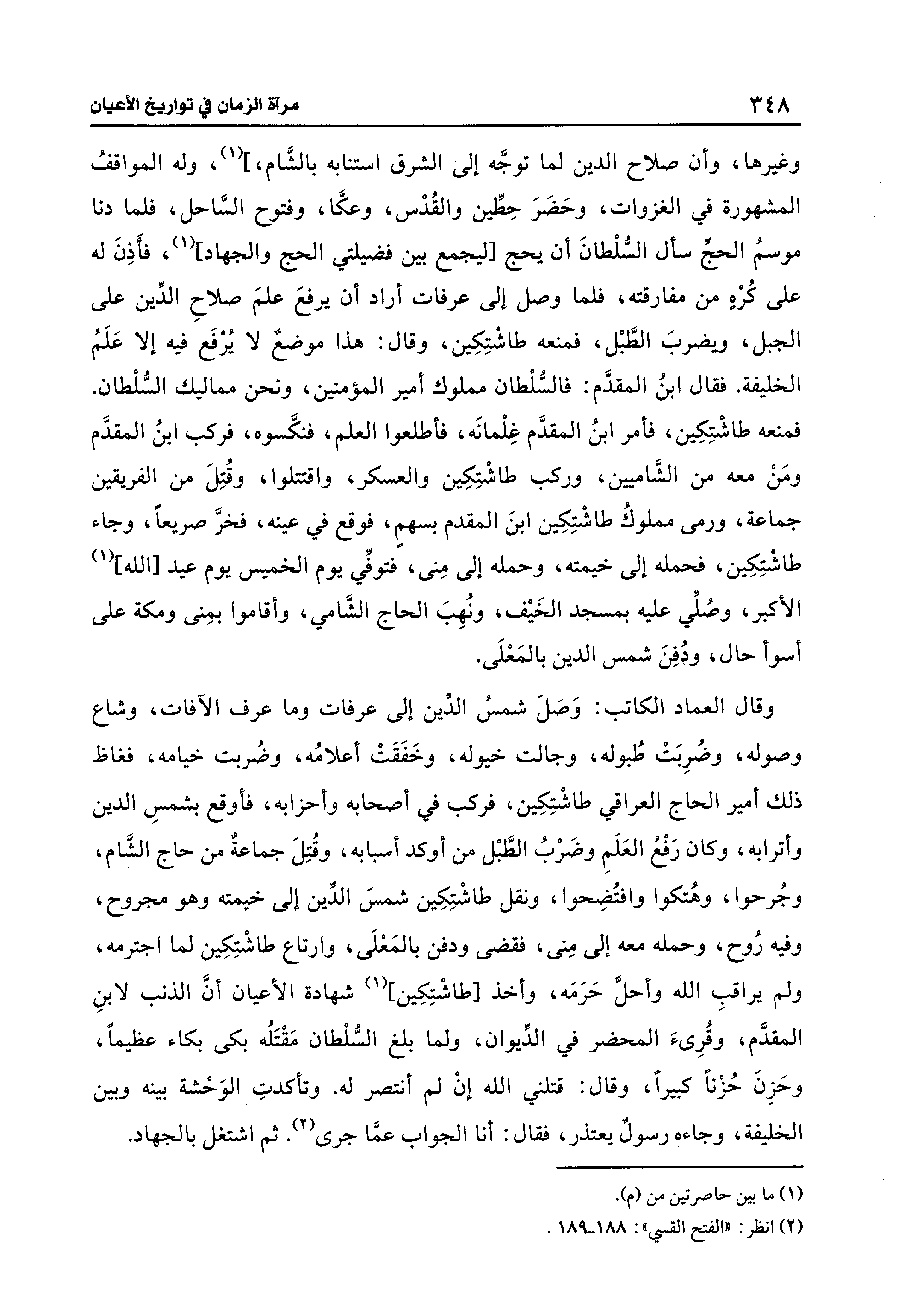وغيرها، وأن صلاح الدين لما توجّه إلى الشرق استنابه بالشام، ] (¬1)، وله المواقفُ المشهورة في الغزوات، وحَضَرَ حِطِّين والقُدْس، وعكّا، وفتوح السّاحل، فلما دنا موسمُ الحج سأل السُّلْطانَ أن يحج [ليجمع بين فضيلتي الحج والجهاد] (1)، فأَذِنَ له على كُرْهٍ من مفارقته، فلما وصل إلى عرفات أراد أن يرفعَ علمَ صلاحِ الدِّين على الجبل، ويضربَ الطَّبْل، فمنعه طاشْتِكِين، وقال: هذا موضعٌ لا يُرْفَع فيه إلا عَلَمُ الخليفة. فقال ابنُ المقدَّم: فالسُّلْطان مملوك أمير المؤمنين، ونحن مماليك السُّلْطان. فمنعه طاشْتِكِين، فأمر ابنُ المقدَّم غِلْمانَه، فأطلعوا العلم، فنكَّسوه، فركب ابنُ المقدَّم ومَنْ معه من الشَّاميين، وركب طاشْتِكِين والعسكر، واقتتلوا، وقُتِلَ من الفريقين جماعة، ورمى مملوكُ طاشْتِكِين ابنَ المقدم بسهمٍ، فوقع في عينه، فخرَّ صريعًا، وجاء طاشْتِكِين، فحمله إلى خيمته، وحمله إلى مِنى، فتوفِّي يوم الخميس يوم عيد [الله] (1) الأكبر، وصُلِّي عليه بمسجد الخَيف، ونُهِبَ الحاج الشَّامي، وأقاموا بمِنى ومكة على أسوأ حال، ودُفِنَ شمس الدين بالمَعْلَى.