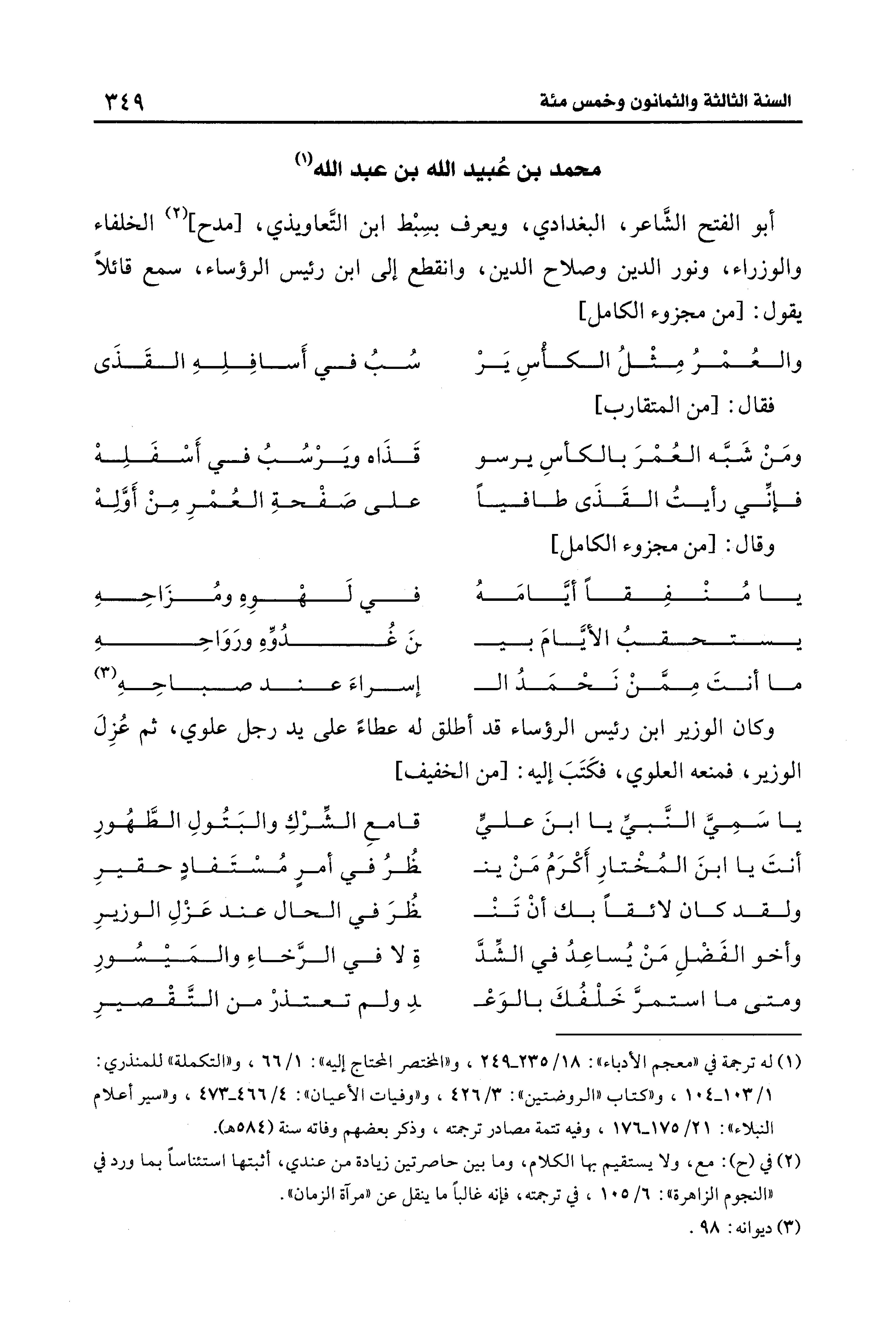 أبو الفتح الشَّاعر، البغدادي، ويعرف بسِبْط ابن التَّعاويذي، [مدح] (¬2) الخلفاء والوزراء، ونور الدين وصلاح الدين، وانقطع إلى ابن رئيس الرؤساء، سمع قائلًا يقول: [من مجزوء الكامل]