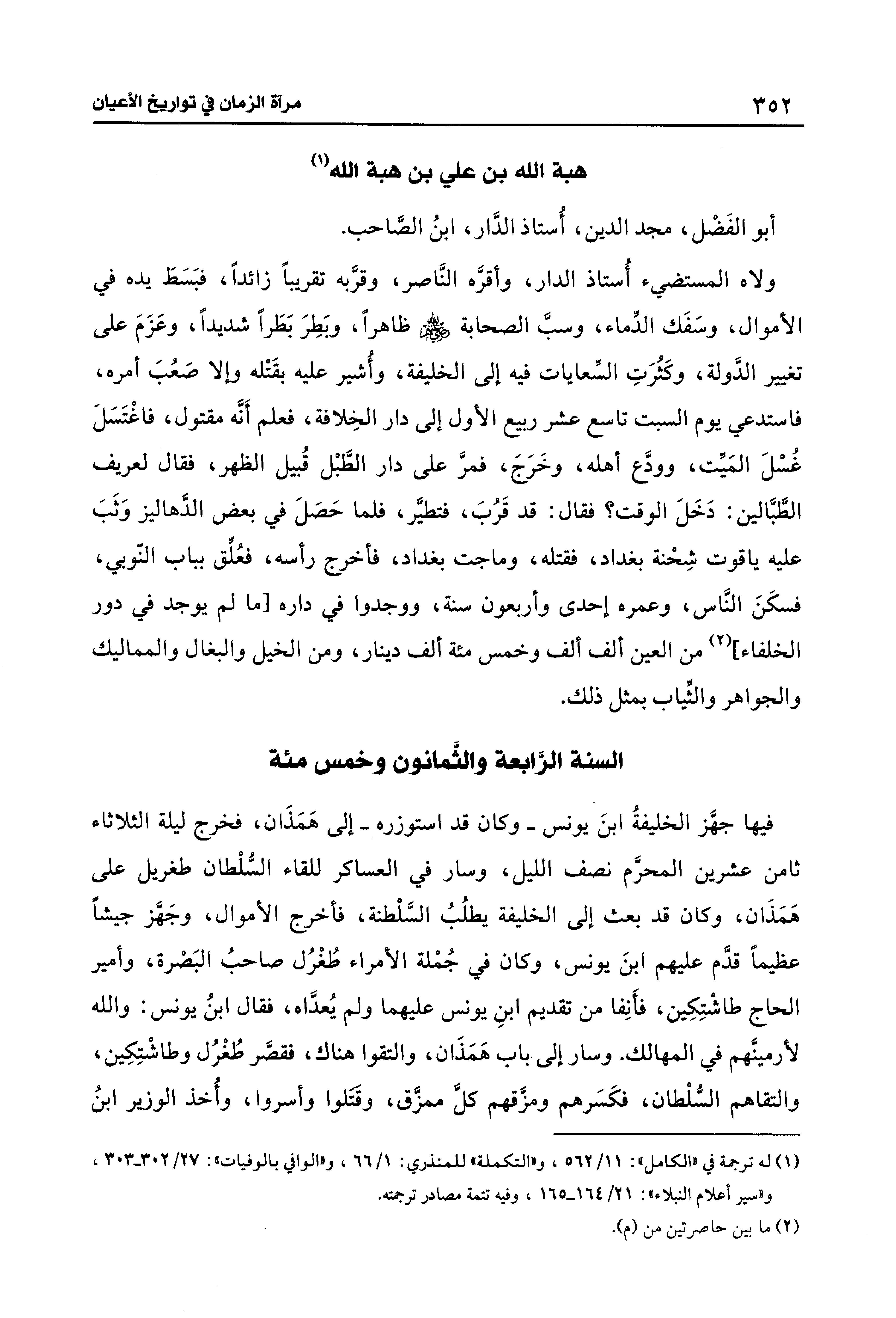 فيها جهَّز الخليفةُ ابنَ يونس -وكان قد استوزره- إلى هَمَذان، فخرج ليلة الثلاثاء ثامن عشرين المحرم نصف الليل، وسار في العساكر للقاء السُّلْطان طغريل على هَمَذان، وكان قد بعث إلى الخليفة يطلُبُ السَّلْطنة، فأخرج الأموال، وجَهَّز جيشًا عظيمًا قدَّم عليهم ابنَ يونس، وكان في جُمْلة الأمراء طُغْرُل صاحبُ البَصْرة، وأمير الحاج طاشْتِكِين، فأَنِفا من تقديم ابنِ يونس عليهما ولم يُعدّاه، فقال ابنُ يونس: والله لأرمينَّهم في المهالك. وسار إلى باب هَمَذان، والتقوا هناك، فقصَّر طُغْرُل وطاشْتِكِين، والتقاهم السّلْطان، فكَسَرهم ومزَّقهم كل ممزَّق، وقَتَلوا وأسروا، وأُخذ الوزير ابنُ