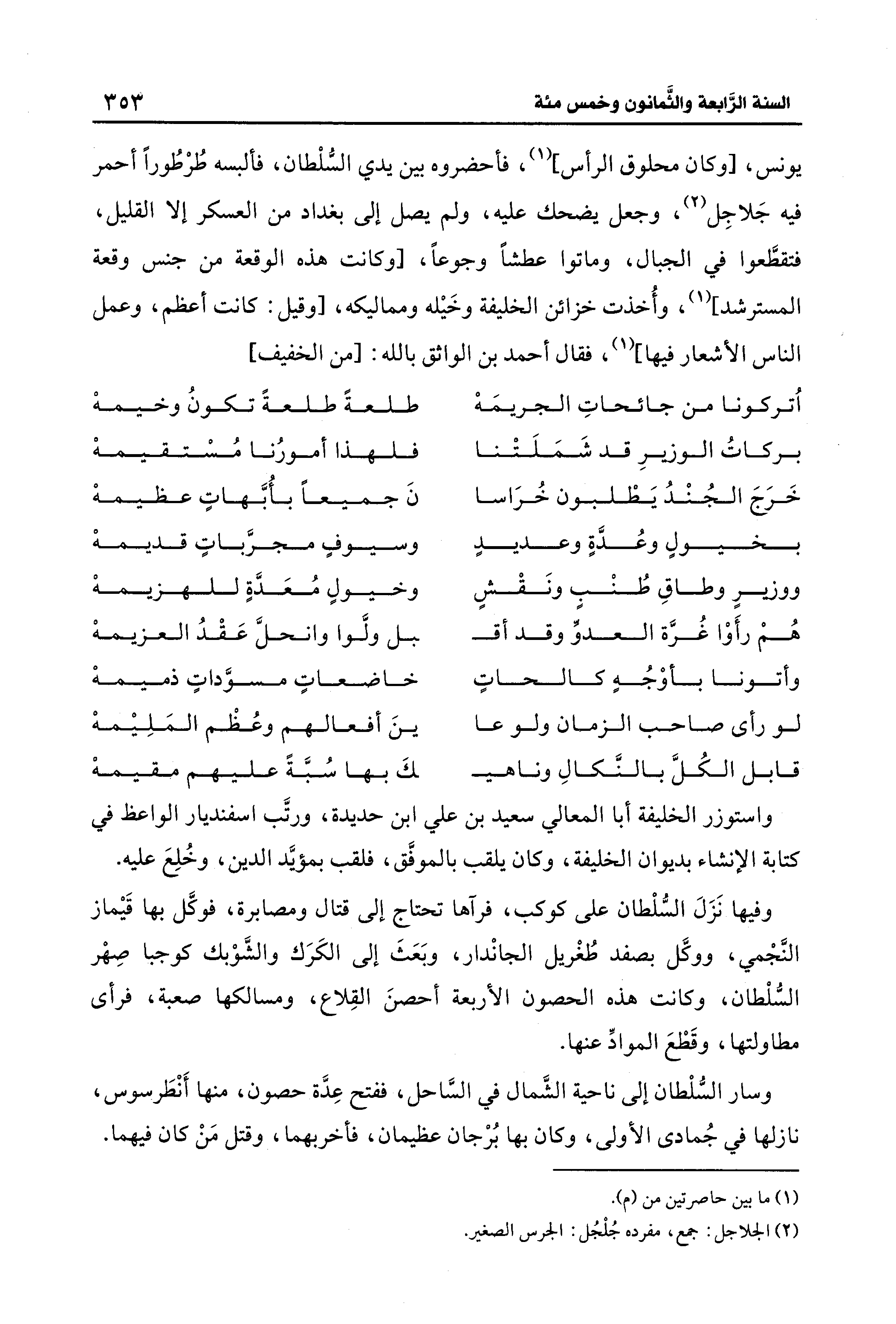 يونس، [وكان محلوق الرأس] (¬1)، فأحضروه بين يدي السّلْطان، فألبسه طُرطُورًا أحمر فيه جَلاجِل (¬2)، وجعل يضحك عليه، ولم يصل إلى بغداد من العسكر إلا القليل، فتقطَّعوا في الجبال، وماتوا عطشًا وجوعًا، [وكانت هذه الوقعة من جنس وقعة المسترشد] (1)، وأُخذت خزائن الخليفة وخَيله ومماليكه، [وقيل: كانت أعظم، وعمل الناس الأشعار فيها] (1)، فقال أحمد بن الواثق بالله: [من الخفيف]