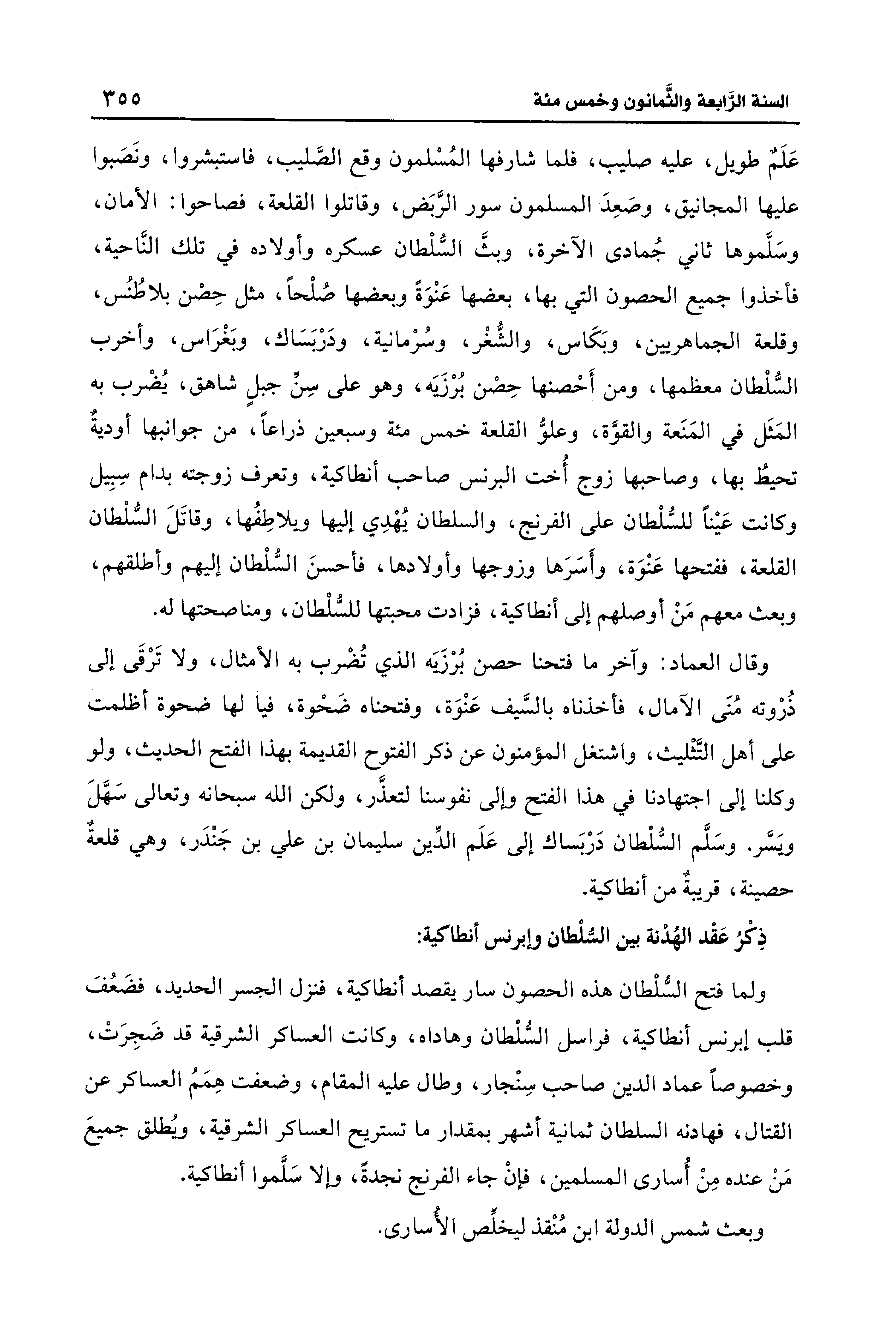 عَلَمٌ طويل، عليه صليب، فلما شارفها المُسْلمون وقع الصَّليب، فاستبشروا، ونَصَبوا عليها المجانيق، وصَعِدَ المسلمون سور الرَّبَض، وقاتلوا القلعة، فصاحوا: الأمان، وسَلَّموها ثاني جُمادى الآخرة، وبثَّ السُّلْطان عسكره وأولاده في تلك النَّاحية، فأخذوا جميع الحصون التي بها، بعضها عَنْوَةً وبعضها صُلْحًا، مثل حِصْن بلاطُنُس، وقلعة الجماهريين، وبَكاس، والشُّغْر، وسُرْمانية، ودَرْبَساك، وبَغْرَاس، وأخرب السُّلْطان معظمها، ومن أحْصنها حِصن بُرزَيَه، وهو على سِن جبلٍ شاهق، يُضْرب به المَثَل في المَنَعة والقوة، وعلوُّ القلعة خمس مئة وسبعين ذراعًا، من جوانبها أوديةٌ تحيطُ بها، وصاحبها زوج أُخت البرنس صاحب أنطاكية، وتعرف زوجته بدام سِبِيل وكانت عَيْنًا للسُّلْطان على الفرنج، والسلطان يُهْدِي إليها ويلاطِفُها، وقاتَلَ السُّلْطان القلعة، ففتحها عَنْوَة، وأَسَرَها وزوجها وأولادها، فأحسنَ السُّلْطان إليهم وأطلقهم، وبعث معهم مَنْ أوصلهم إلى أنطاكية، فزادت محبتها للسّلْطان، ومناصحتها له.