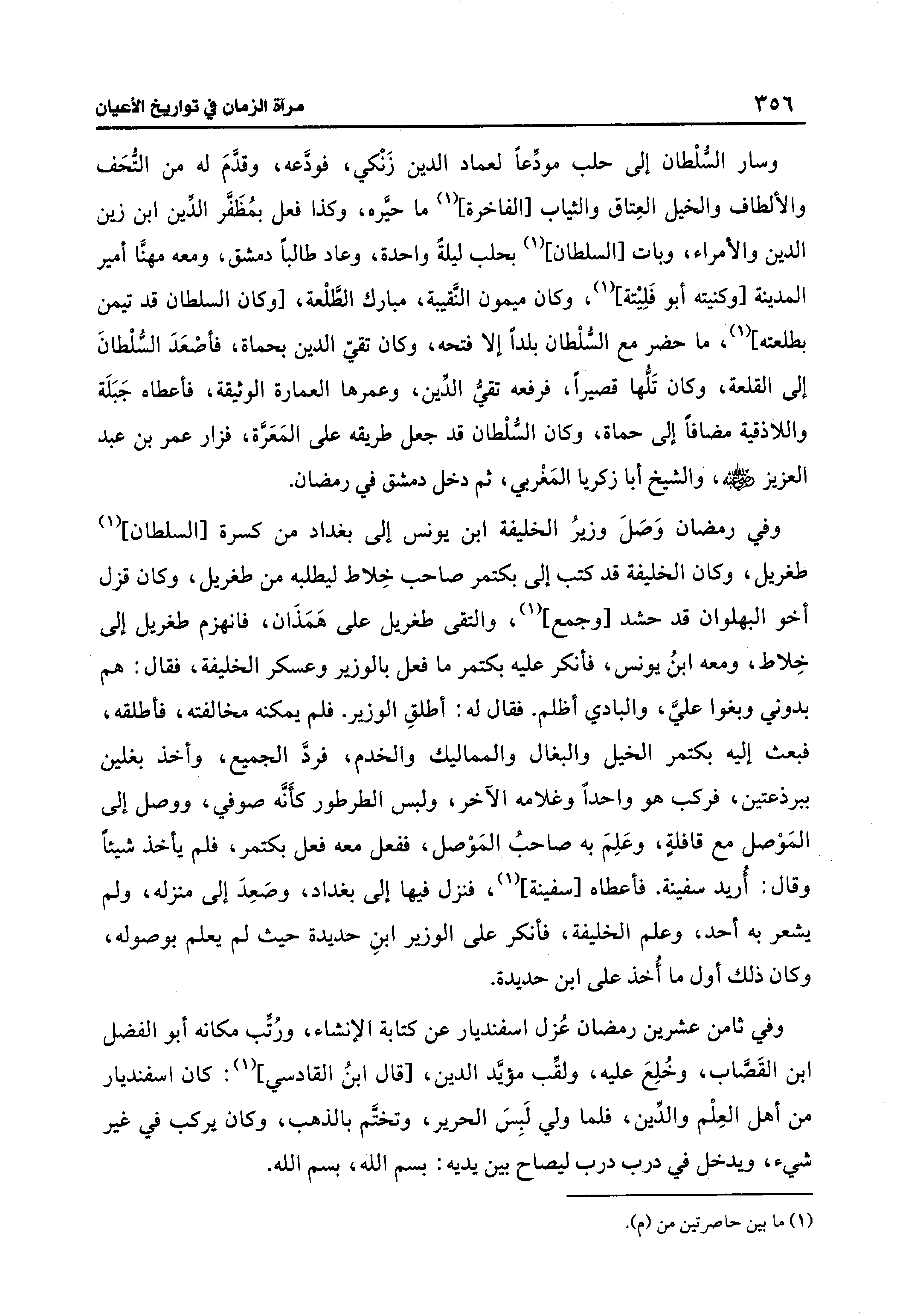 وسار السُّلْطان إلى حلب مودِّعًا لعماد الدين زَنكي، فودَّعه، وقدَّمَ له من التُّحَف والألطاف والخيل العِتاق والثياب [الفاخرة] (1) ما حيَّره، وكذا فعل بمُظَفَر الدين ابن زين الدين والأمراء، وبات [السلطان] (1) بحلب ليلةً واحدة، وعاد طالبًا دمشق، ومعه مهنَّا أمير المدينة [وكنيته أبو فَلِيتة] (1)، وكان ميمون النَّقيبة، مبارك الطَّلْعة، [وكان السلطان قد تيمن بطلعته] (1)، ما حضر مع السُّلْطان بلدًا إلا فتحه، وكان تقيّ الدين بحماة، فأصْعَدَ السُّلْطانَ إلى القلعة، وكان تَلُّها قصيرًا، فرفعه تقي الدِّين، وعمرها العمارة الوثيقة، فأعطاه جَبَلَة واللاذقية مضافًا إلى حماة، وكان السُّلْطان قد جعل طريقه على المَعَرَّة، فزار عمر بن عبد العزيز - رضي الله عنه -، والشيخ أبا زكريا المَغْربي، ثم دخل دمشق في رمضان.